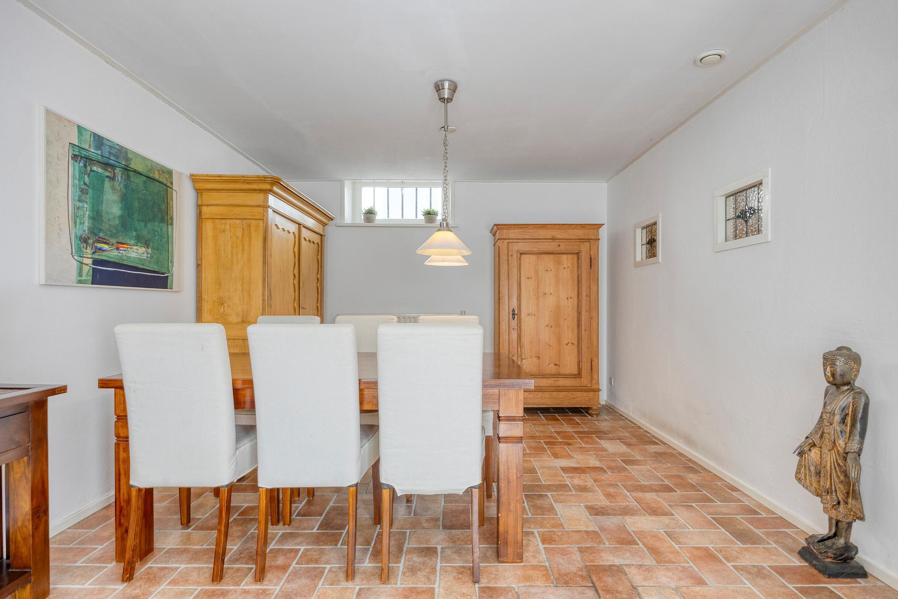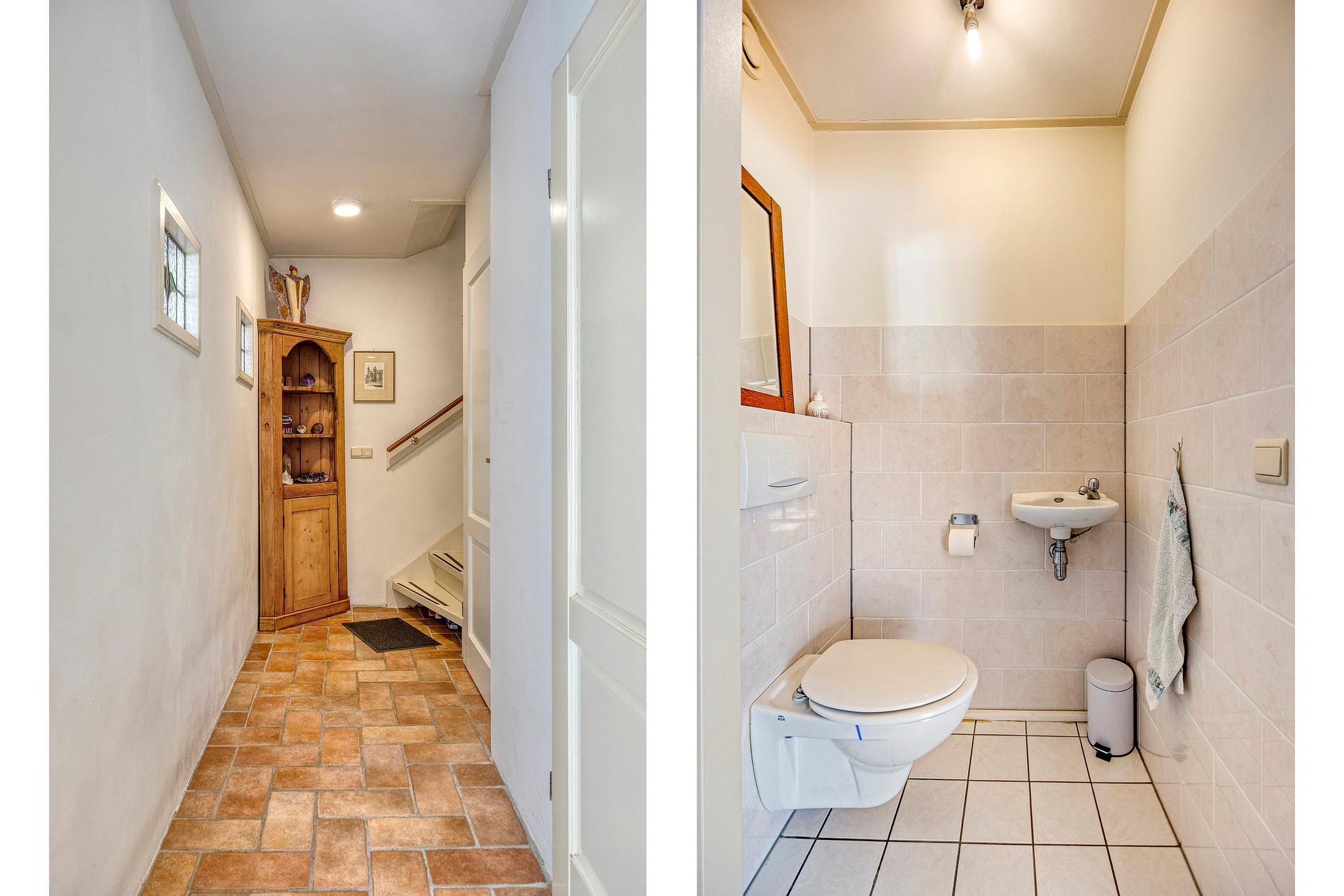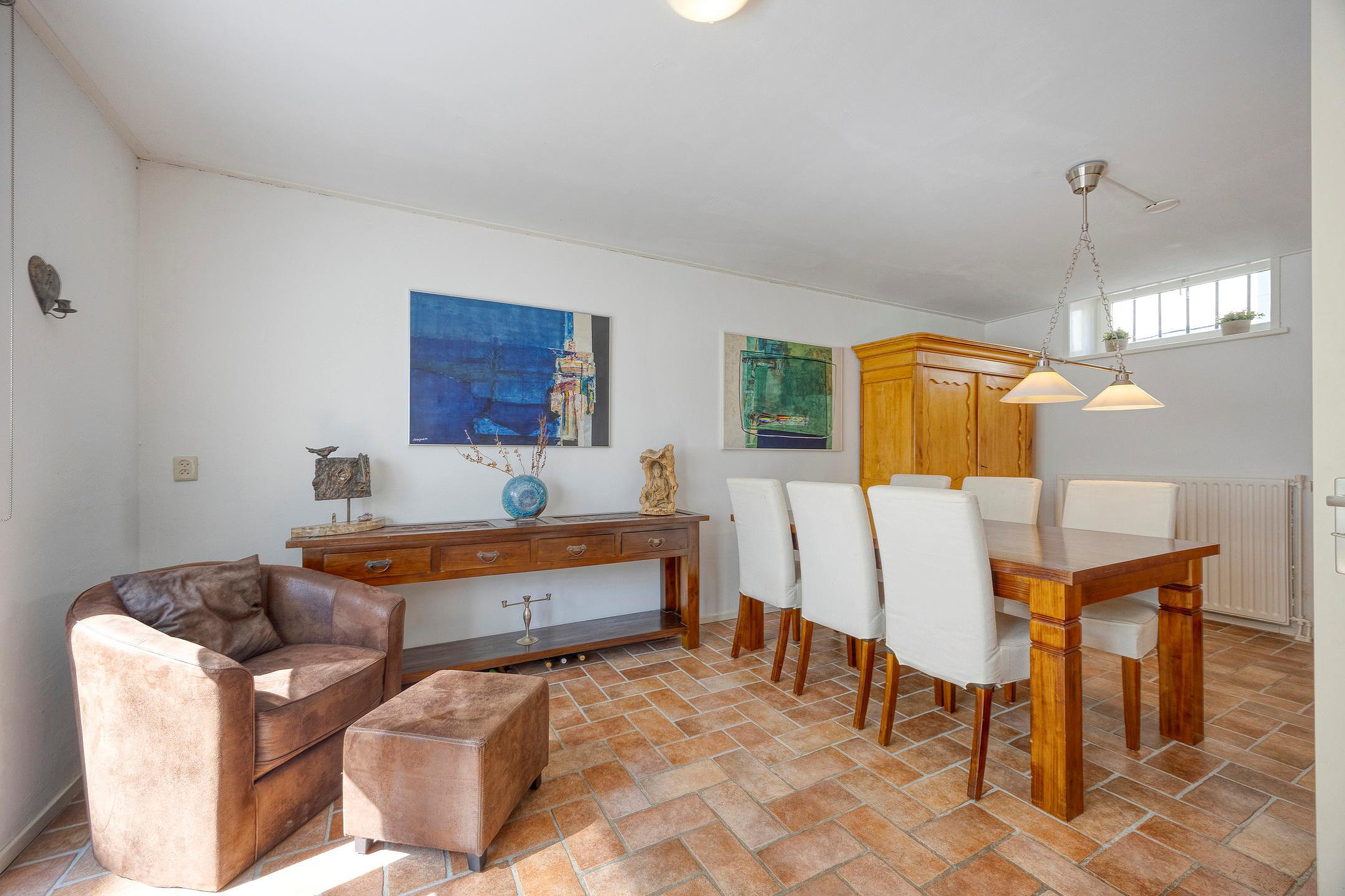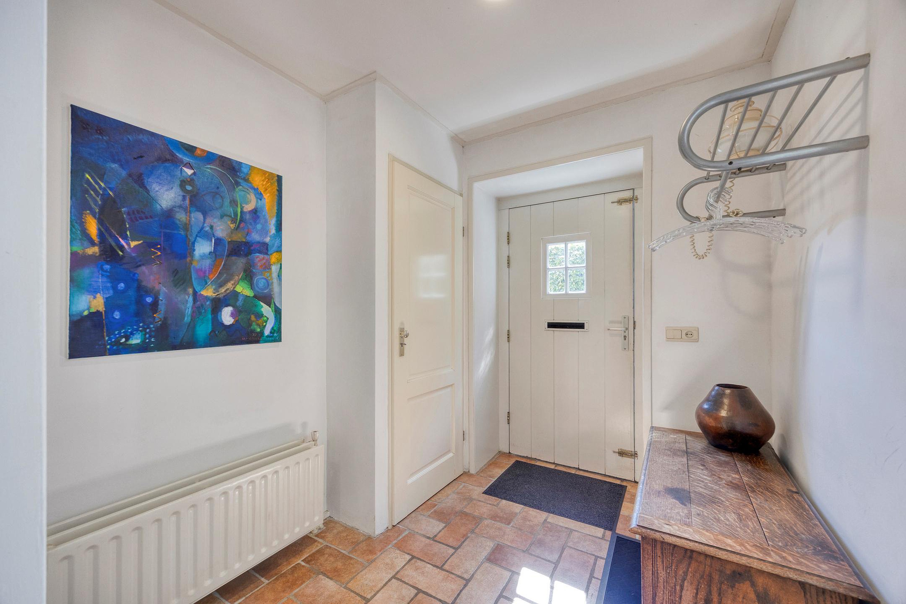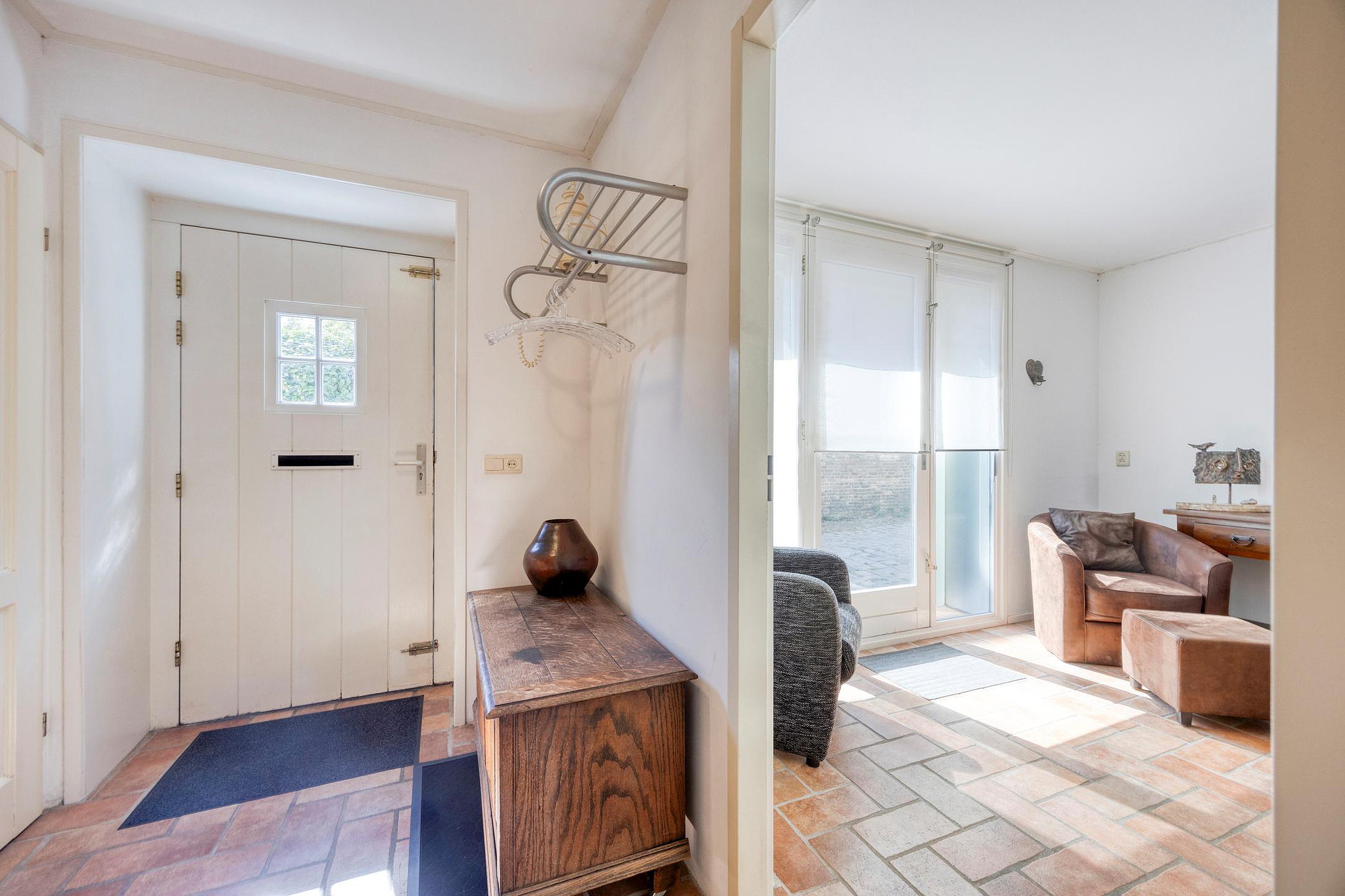 De hal heeft een meterkast, toiletruimte, bergkast en een trapopgang naar de eerste verdieping én geeft toegang tot een sfeervolle ruimte die zich perfect leent als werkkamer, hobbyruimte of tweede woonkamer. Deze ruimte heeft een eigen entree met een loopdeur in de glazen pui en kan met dubbele houten schuurdeuren extra worden afgesloten. Ideaal voor een praktijk of kantoor aan huis.