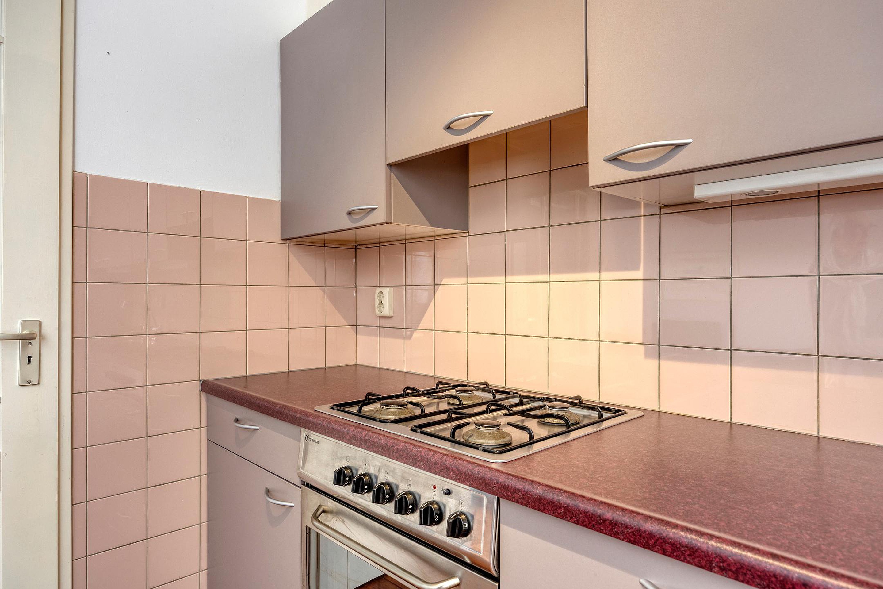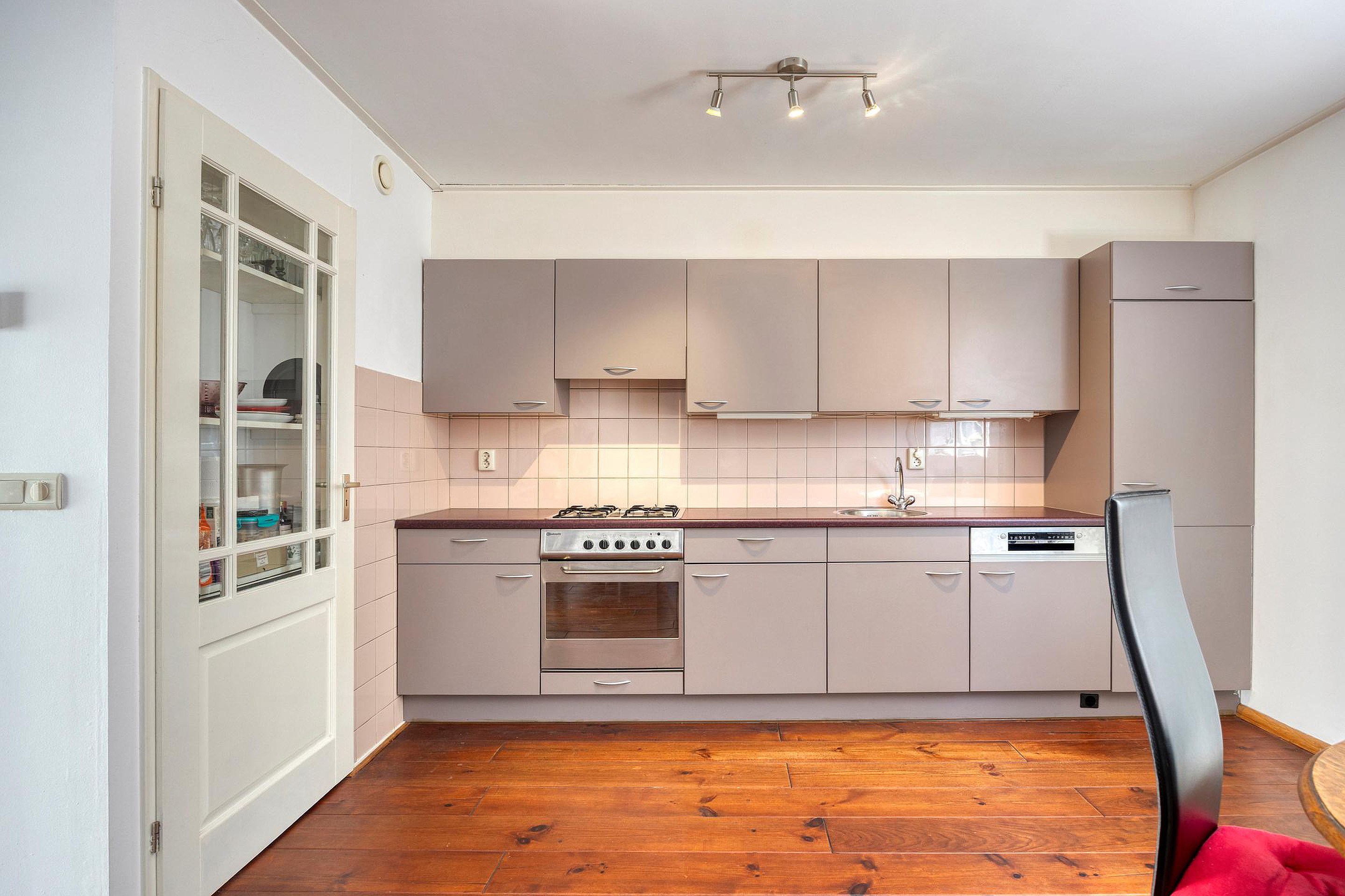 De open keuken is voorzien van een rechte keukenopstelling met kastruimte en inbouwapparatuur: vaatwasser, oven, afzuigkap en koelkast. Extra handig: een vaste servieskast met extra opbergruimte.