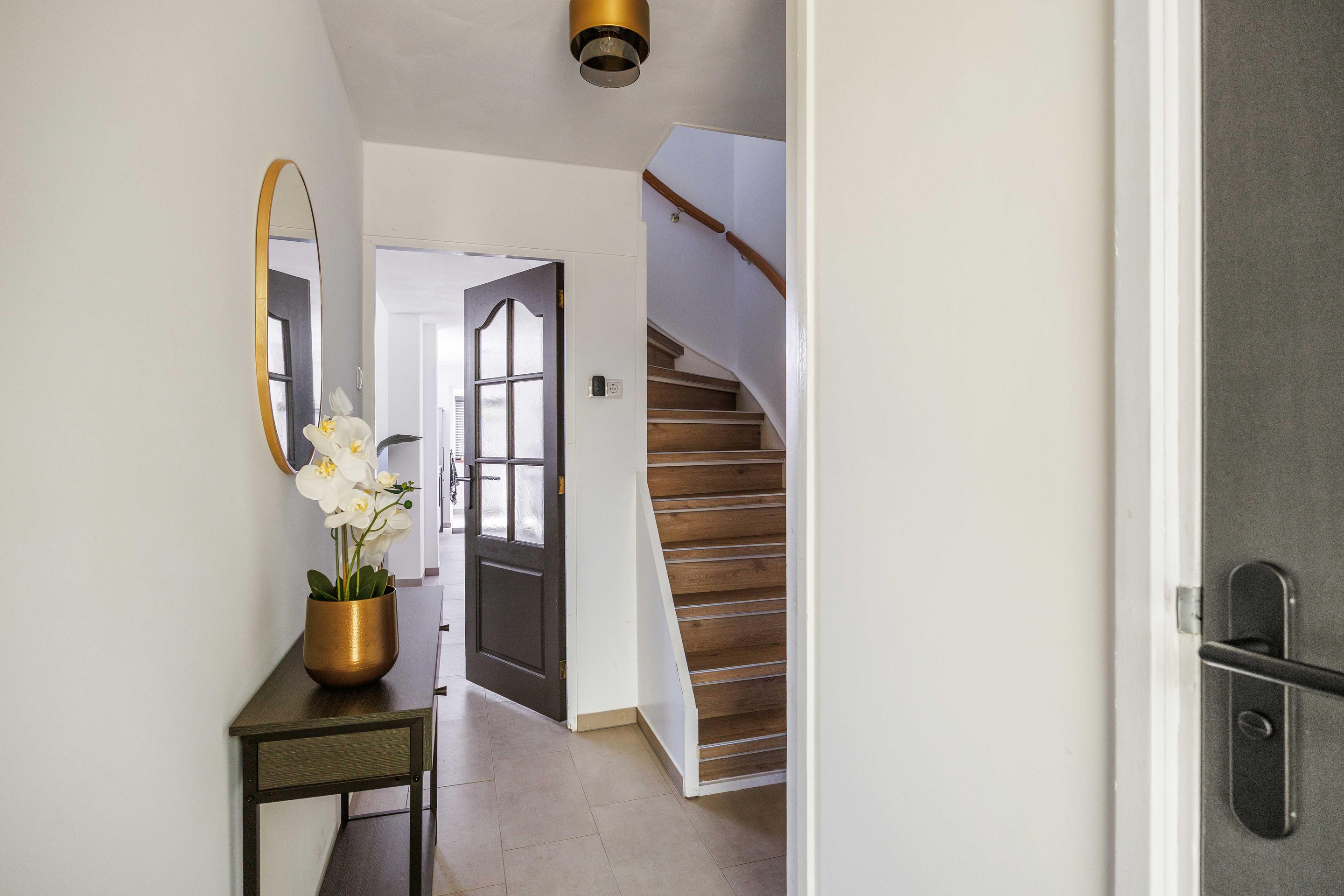 Stap binnen via de hal waar meteen opvalt hoe netjes en verzorgd alles is. Hier vind je niet alleen de meterkast, maar ook de trapopgang naar. De toiletruimte is voorzien van een modern wandcloset en fonteintje.
