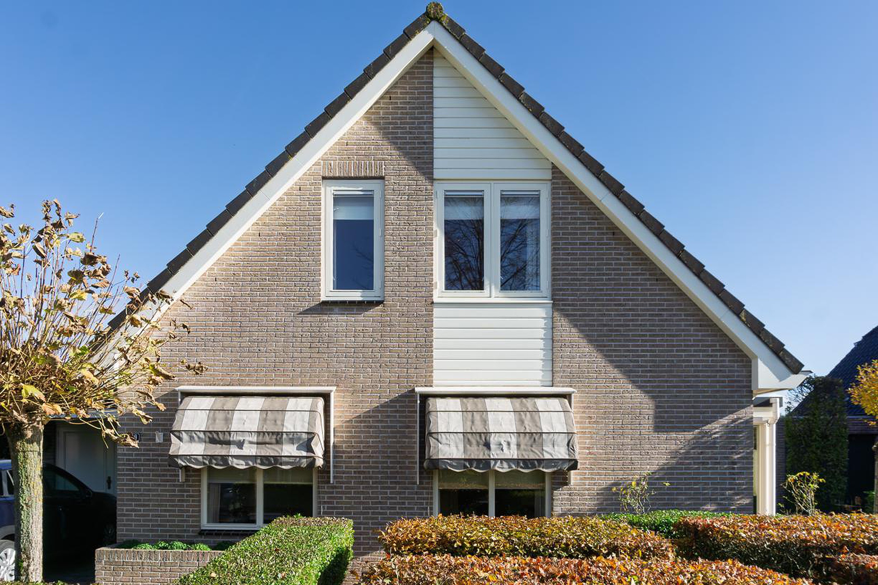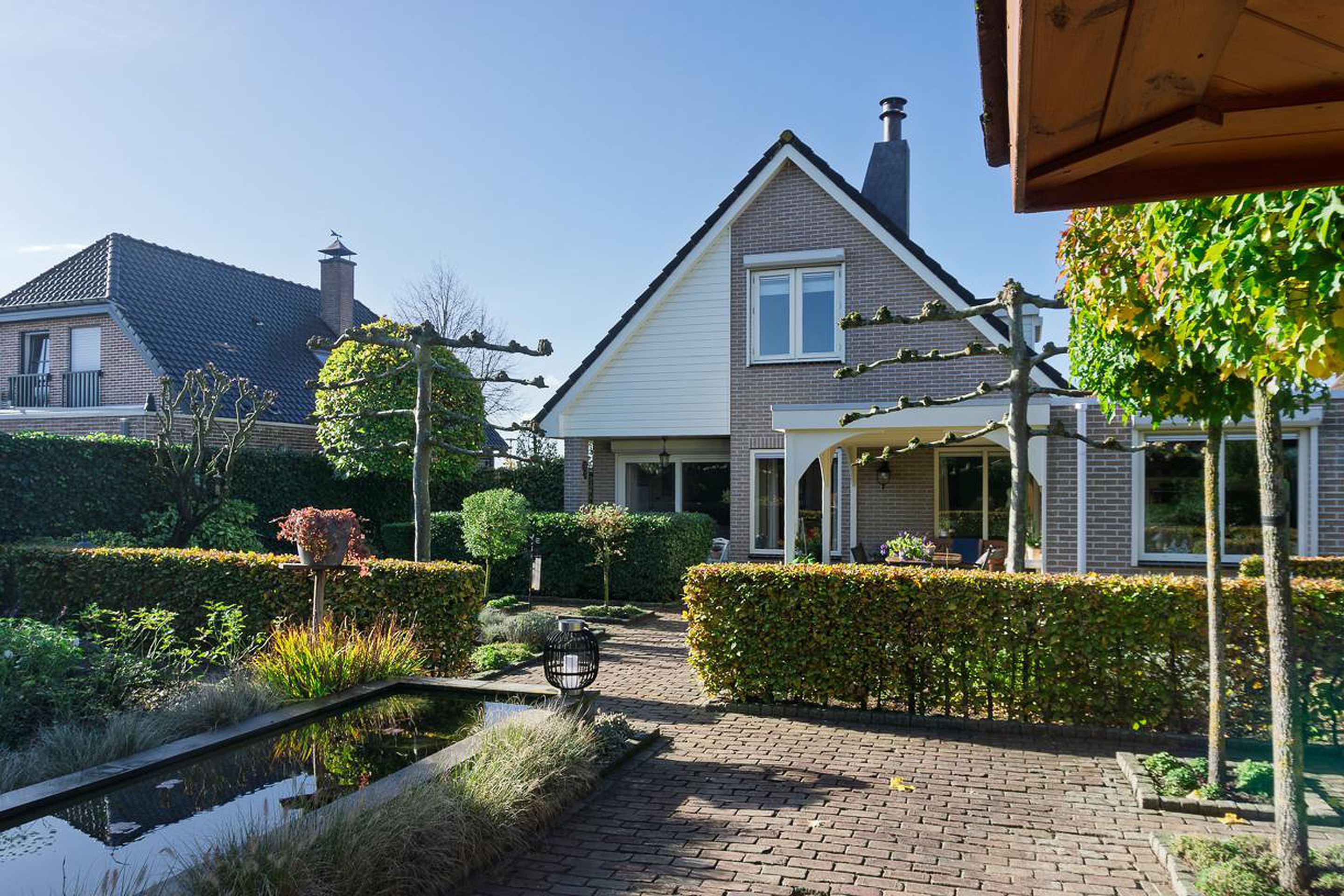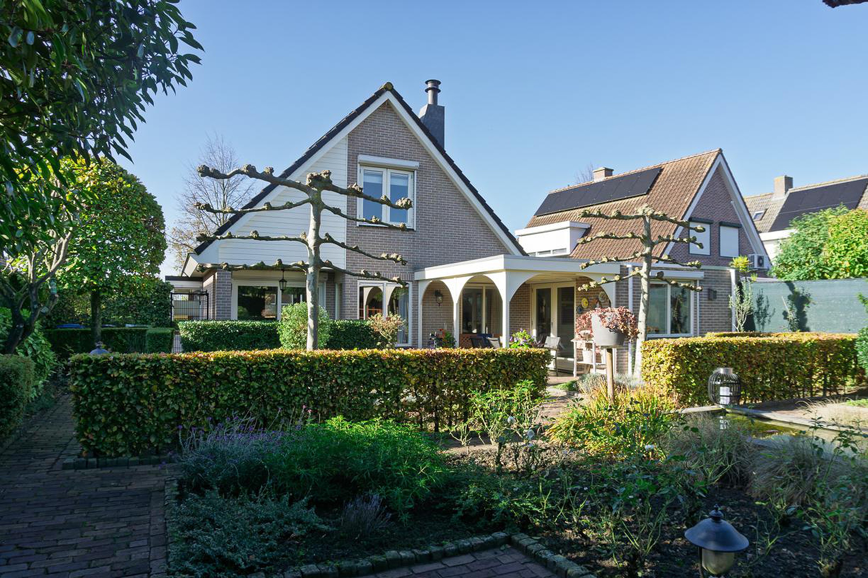 De woning beschikt op de begane grond over een ruime hal die met een dubbele deur toegang geeft tot de royale woonkamer van zo'n 70 m2 met hiernaast een werk-/studeerkamer. Aan de achterzijde is de woning uitgebouwd. Hierin bevindt zich de keuken die toegang geeft tot de garage. De garage is ook toegankelijk vanuit de hal van de woning. Op de 1e verdieping bevinden zich 3 slaapkamers, een kastenkamer en de badkamer met ligbad, douche, toilet en dubbele wastafel. Op de overloop van de 1e verdieping is in het plafond een luik aanwezig wat met een vlizotrap toegang geeft tot een grote bergzolder. Achter, voor en aan de zijkant van de woning ligt de prachtig aangelegde en onderhouden tuin met veranda, vijverpartij en mooie plantenborders en bomen; een plaatje! Voor de woning ligt een oprit waar 2 auto's op eigen terrein kunnen worden geparkeerd. De woning is volledig geïsoleerd en zorgt voor een deel voor de eigen energievoorziening door de aanwezigheid van 9 zonnepanelen en beschikt over energielabel B.
