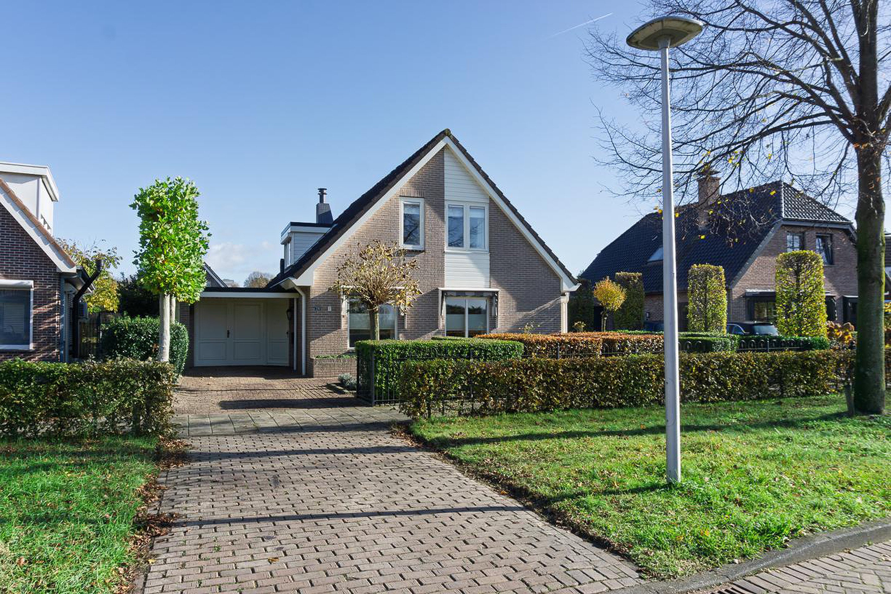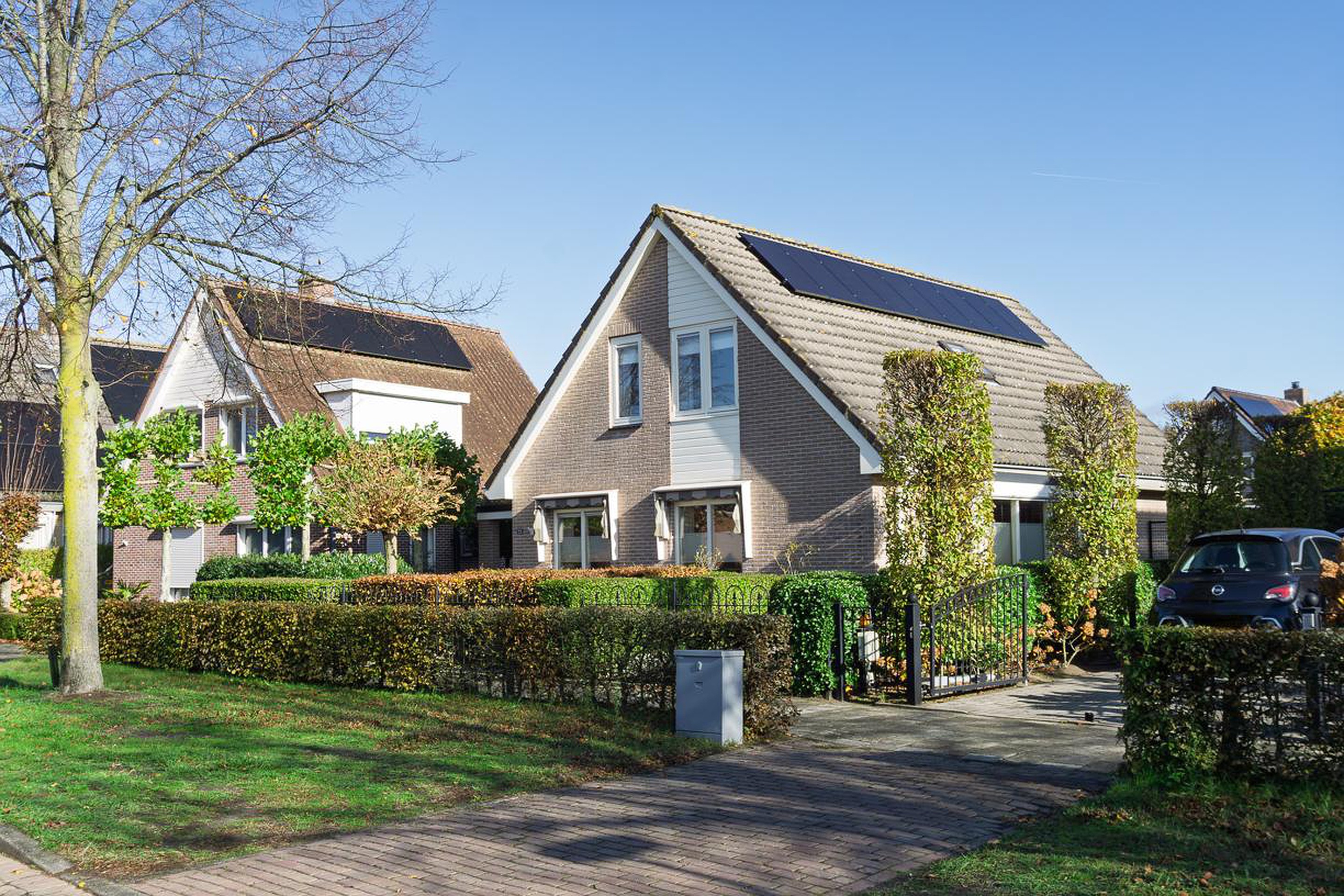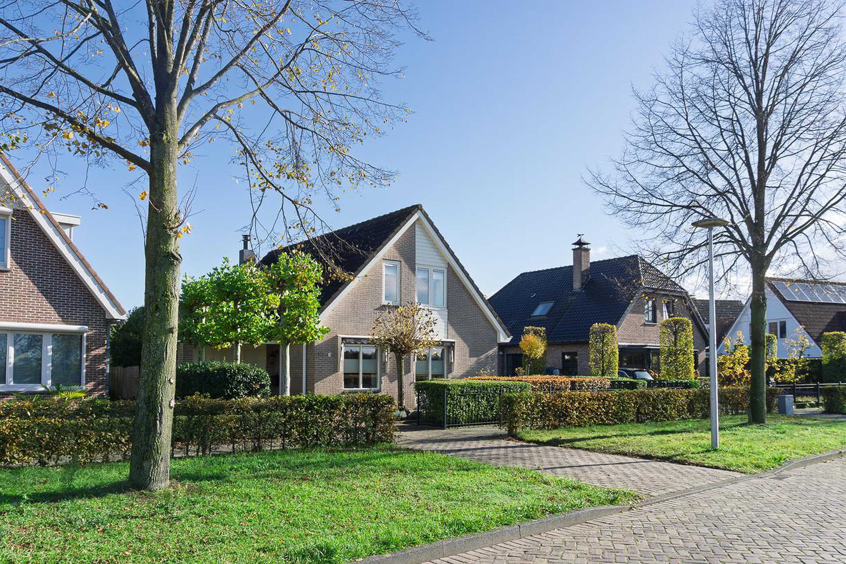 De woning beschikt op de begane grond over een ruime hal die met een dubbele deur toegang geeft tot de royale woonkamer van zo'n 70 m2 met hiernaast een werk-/studeerkamer. Aan de achterzijde is de woning uitgebouwd. Hierin bevindt zich de keuken die toegang geeft tot de garage. De garage is ook toegankelijk vanuit de hal van de woning. Op de 1e verdieping bevinden zich 3 slaapkamers, een kastenkamer en de badkamer met ligbad, douche, toilet en dubbele wastafel. Op de overloop van de 1e verdieping is in het plafond een luik aanwezig wat met een vlizotrap toegang geeft tot een grote bergzolder. Achter, voor en aan de zijkant van de woning ligt de prachtig aangelegde en onderhouden tuin met veranda, vijverpartij en mooie plantenborders en bomen; een plaatje! Voor de woning ligt een oprit waar 2 auto's op eigen terrein kunnen worden geparkeerd. De woning is volledig geïsoleerd en zorgt voor een deel voor de eigen energievoorziening door de aanwezigheid van 9 zonnepanelen en beschikt over energielabel B.