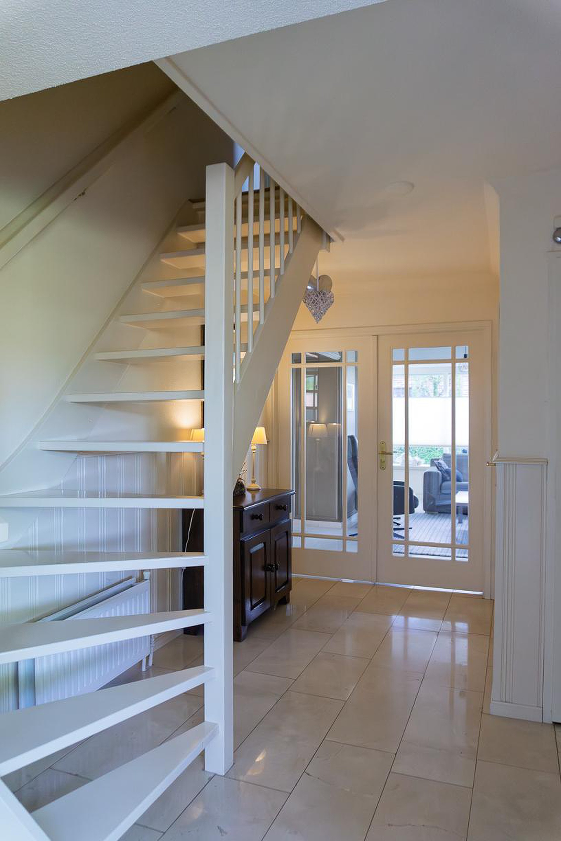 De woning wordt vanaf de oprit betreden in de ruime hal. In de hal zijn aanwezig het toilet, de trapopgang naar de 1e verdieping en de meterkast. De meterkast beschikt over 8 elektragroepen, 3 aardlekschakelaars en een PV-groep. De hal is afgewerkt met lambrisering op de wanden met hierboven spuitwerk, een gespoten plafond en een marmervloer.