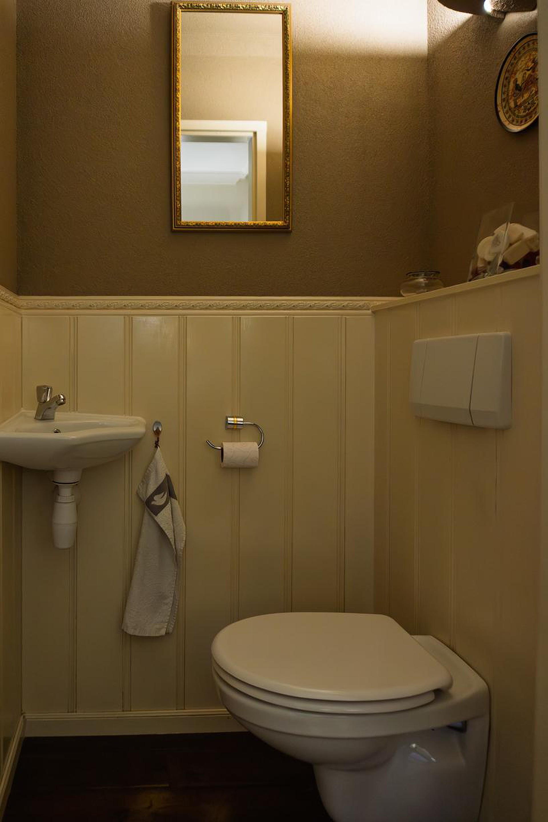 Het toilet beschikt over een hangcloset met hoekfontein. De afwerking bestaat uit lambrisering op de wanden, een gespoten plafond en een houten vloer.
