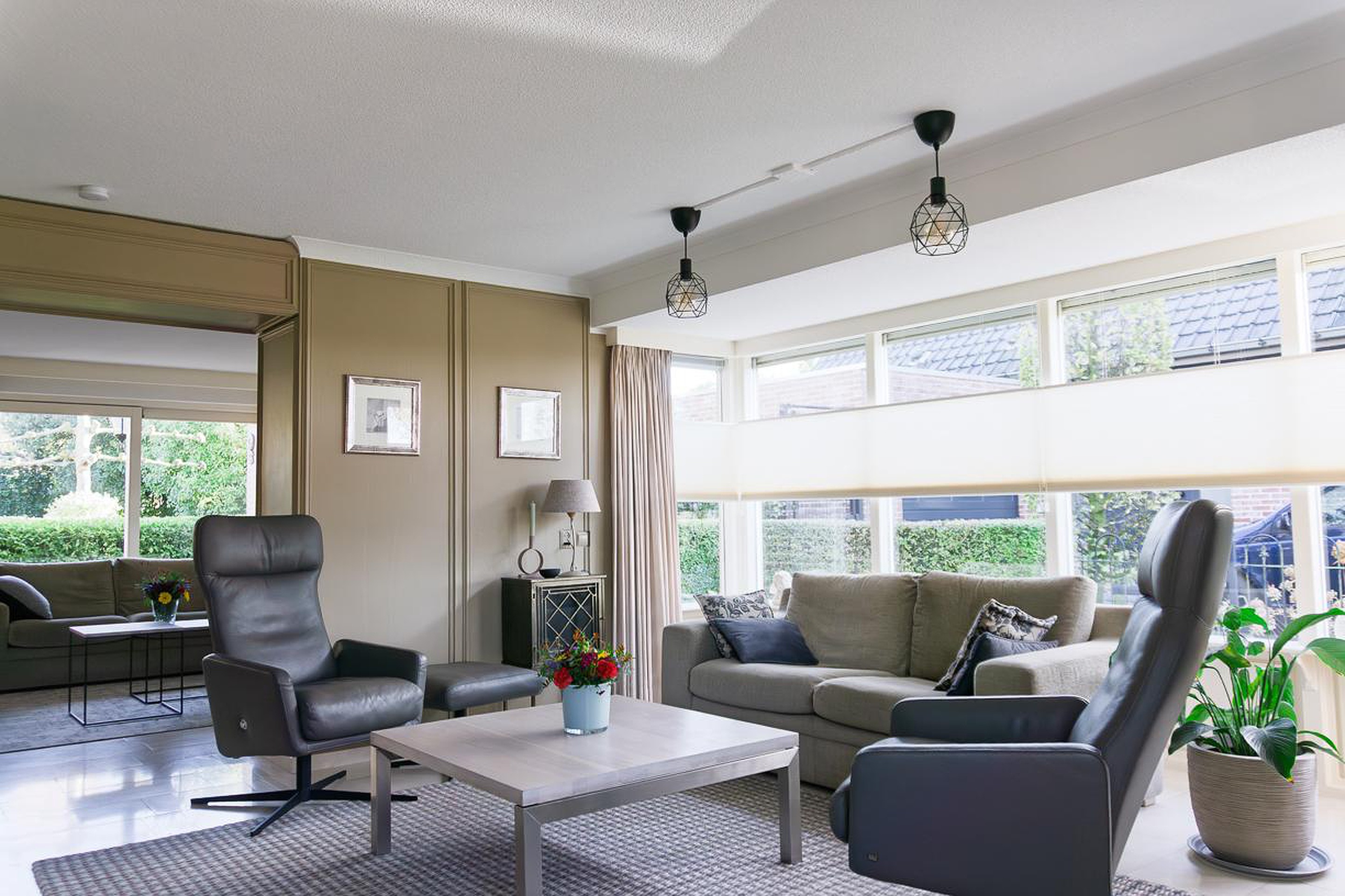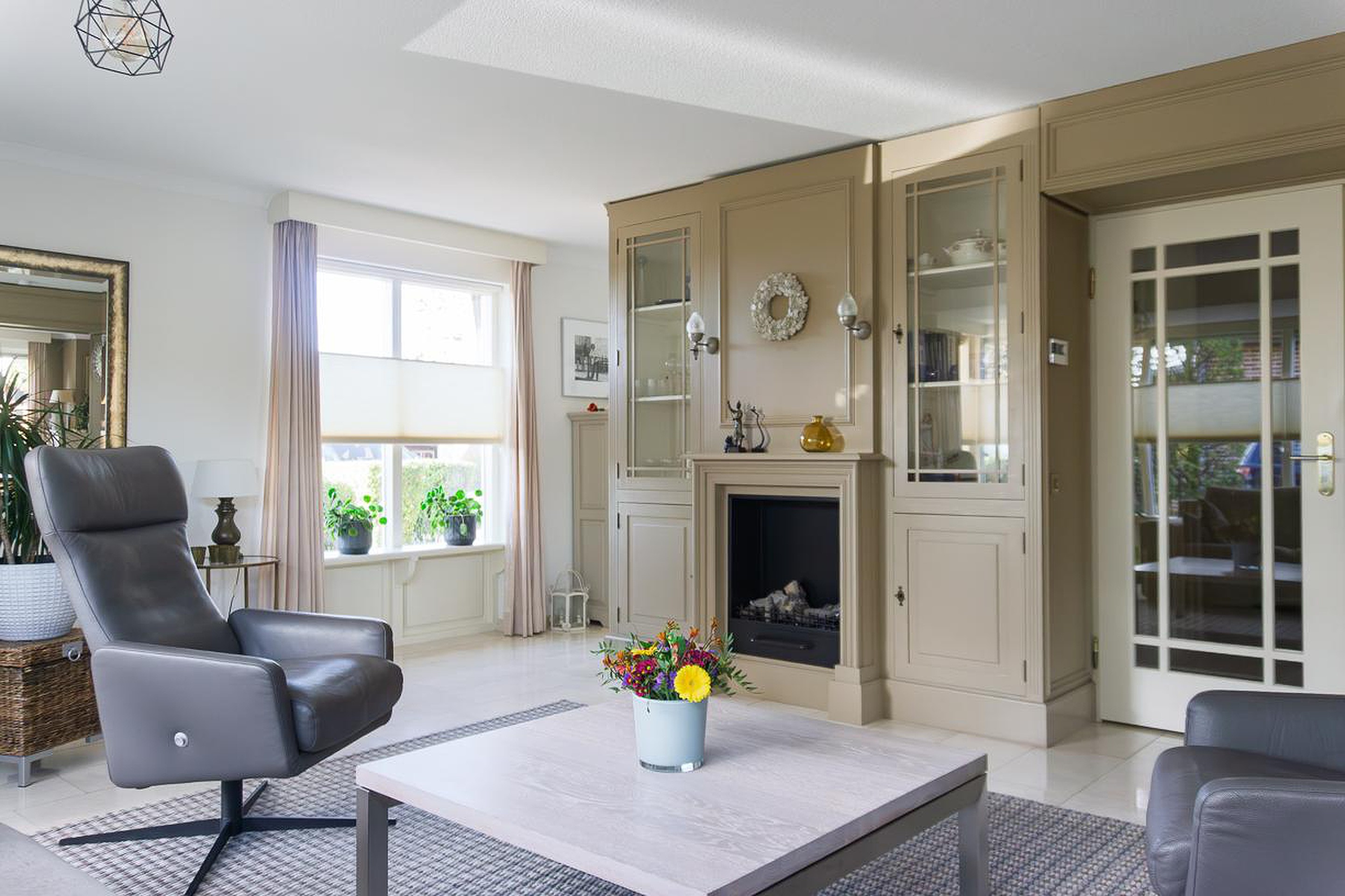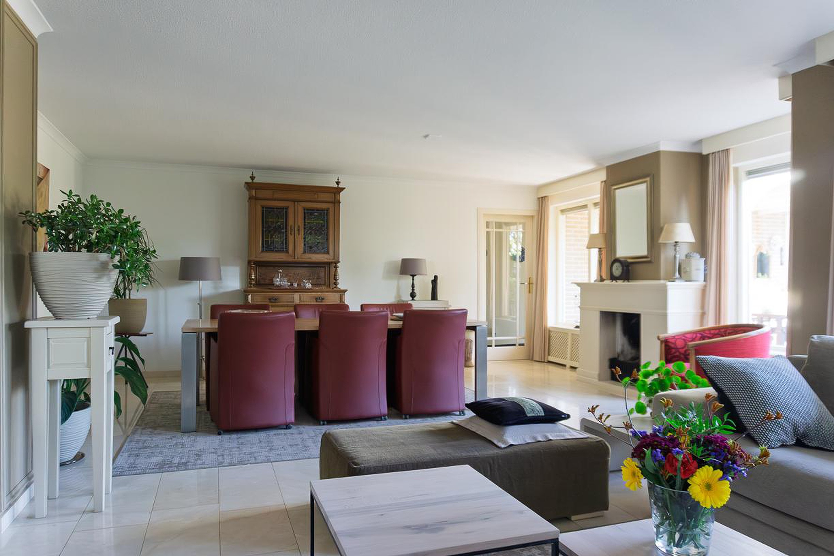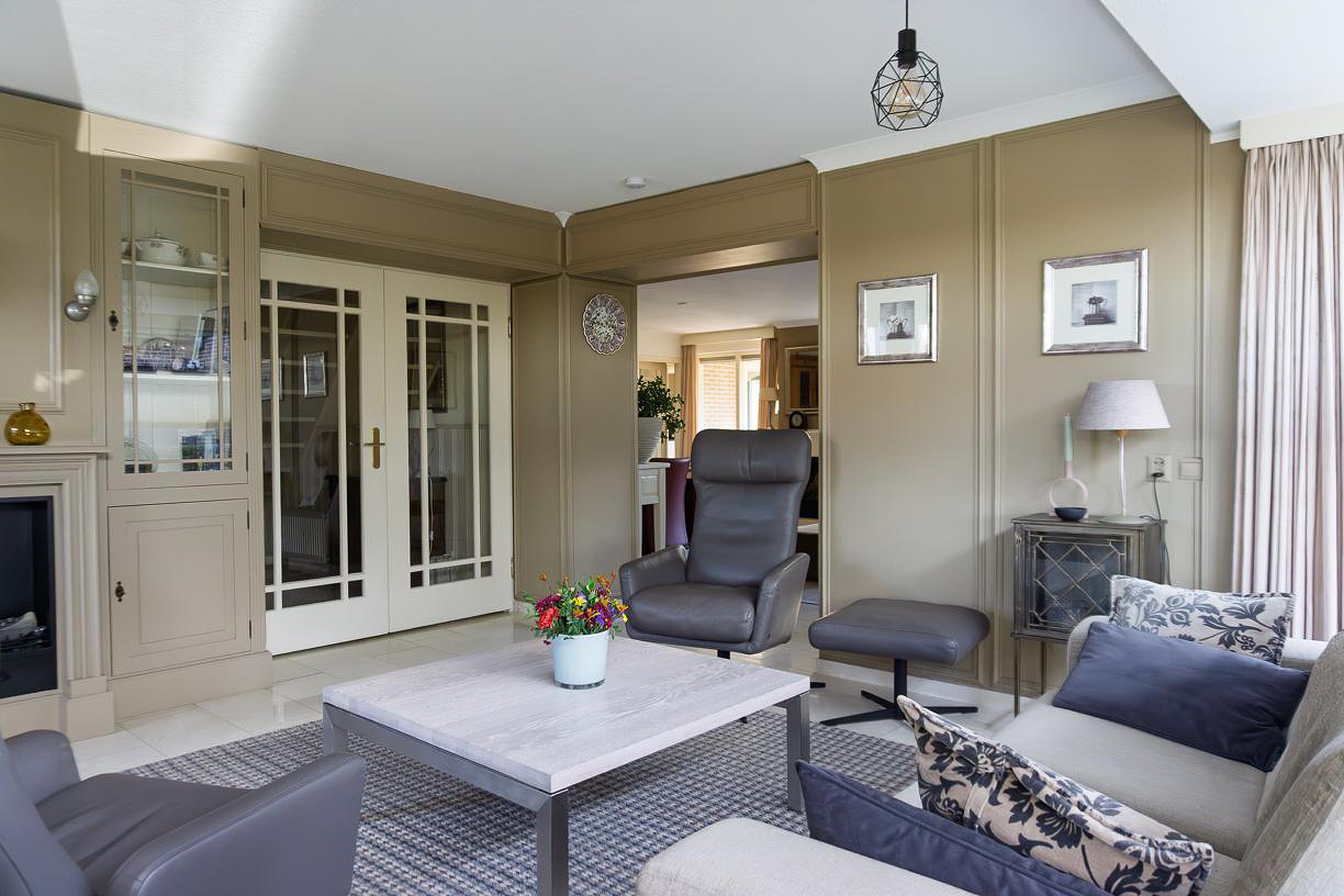 Vanuit de hal wordt via dubbele, beglaasde deuren de woonkamer betreden. De L-vormige woonkamer is royaal te noemen en in een voorkamer en achterkamer ingedeeld. In de voorkamer is aan de zijkant een erker aanwezig en aan de andere zijde een gelhaard met schouw ingebouwd in een vaste kast. Ook geeft de voorkamer toegang tot een naast de woonkamer gelegen studeer-/werkkamer. Door de vele raampartijen is er veel lichtinval in de voorkamer. De achterkamer is ruim te noemen met een zithoek voor de schuifpui waardoor de verbinding met de prachtige achtertuin kan worden gemaakt. Aan de andere kant van de achterkamer kan een grote eethoek worden geplaatst tegenover de sfeervolle gashaard. Hier is de deur aanwezig die toegang geeft tot de keuken. De afwerking van de woonkamer bestaat uit gedeeltelijk met hout en met spuitwerk afgewerkte wanden, een gespoten plafond en een marmervloer.