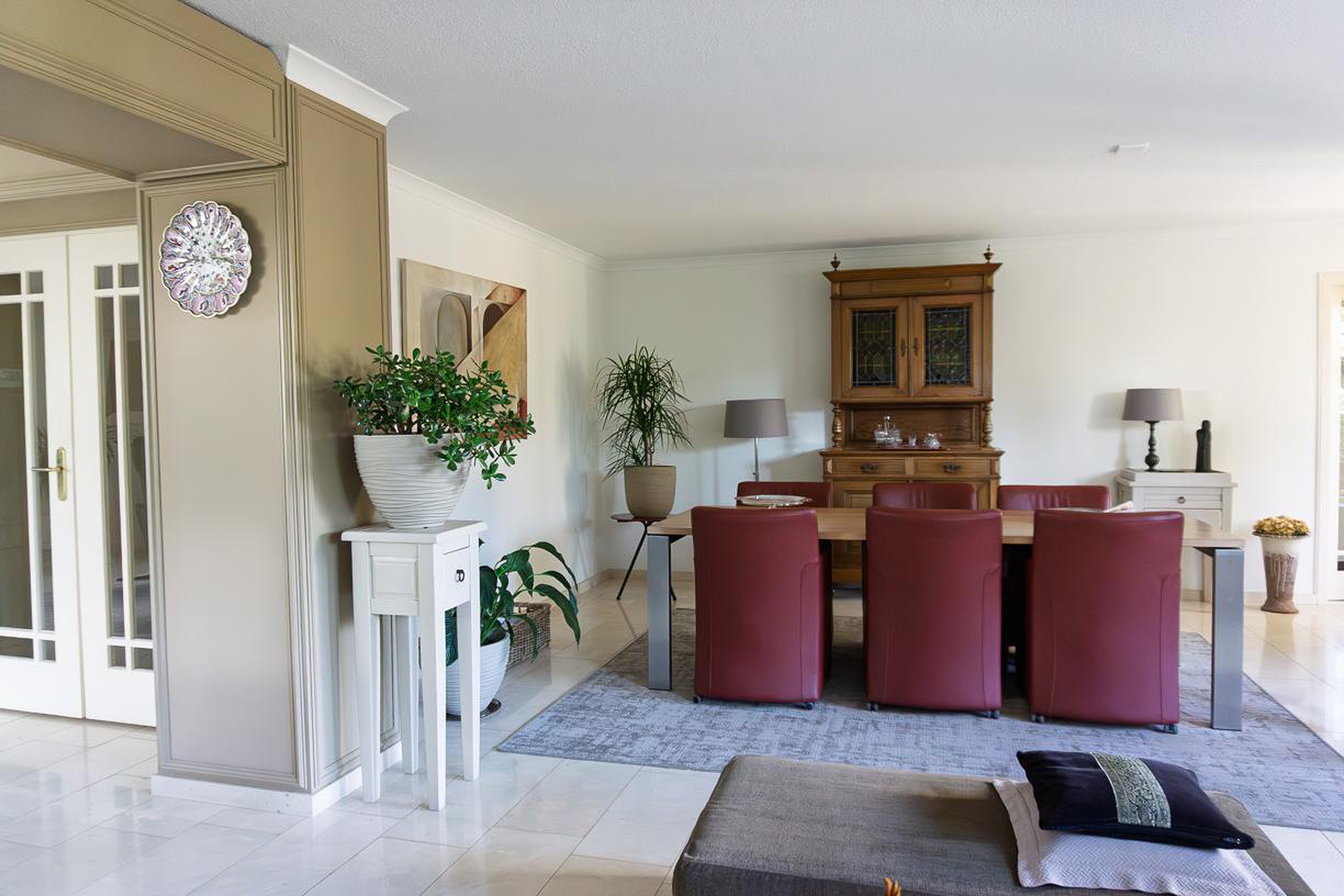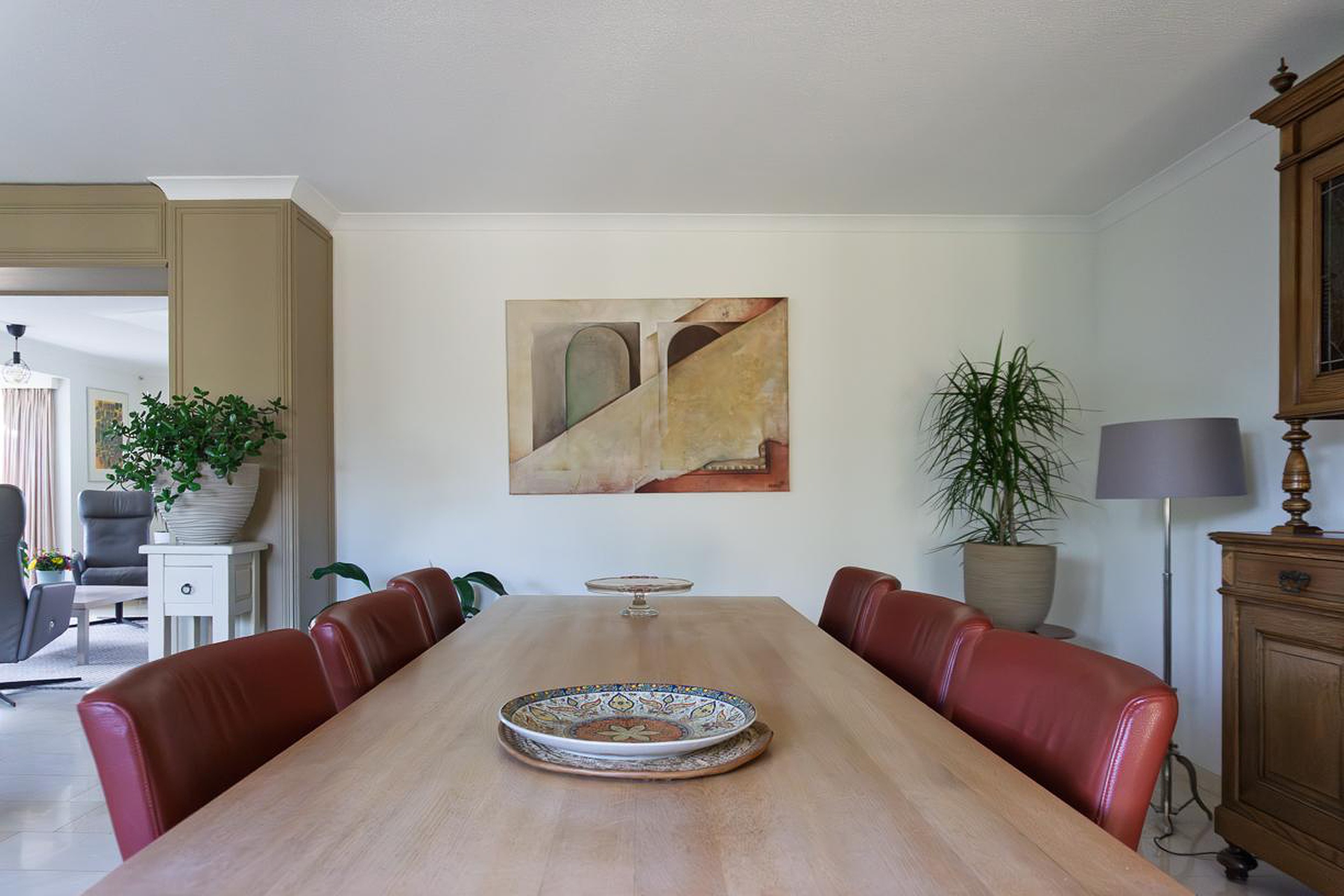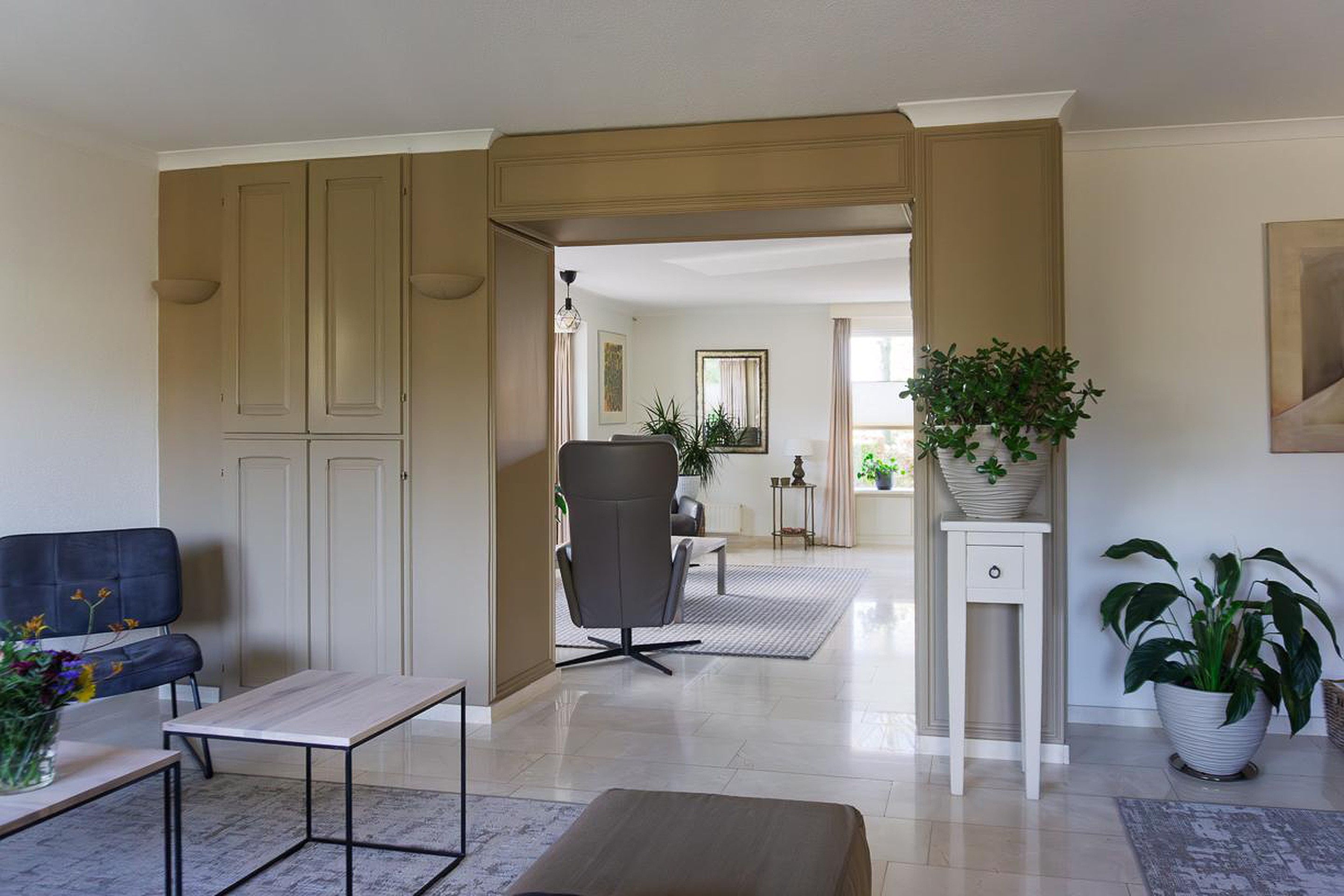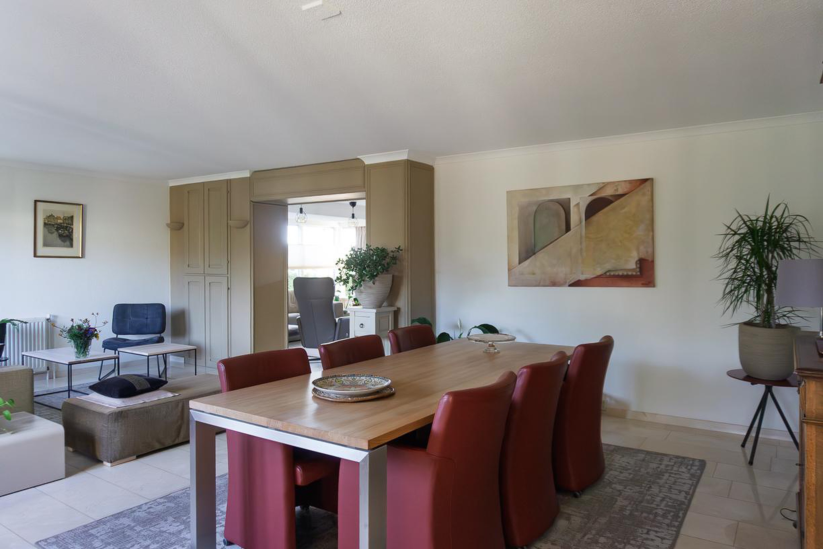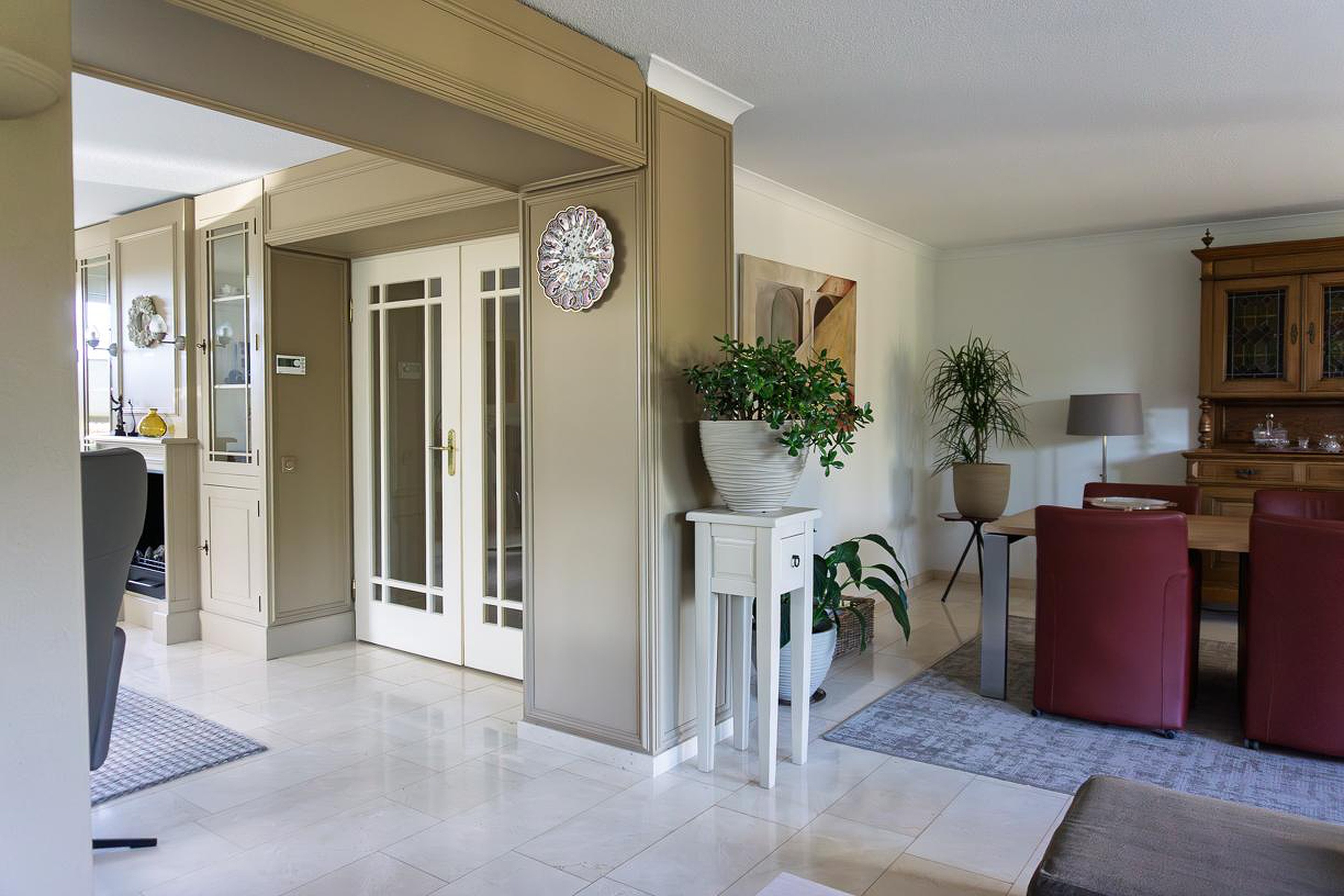 Vanuit de hal wordt via dubbele, beglaasde deuren de woonkamer betreden. De L-vormige woonkamer is royaal te noemen en in een voorkamer en achterkamer ingedeeld. In de voorkamer is aan de zijkant een erker aanwezig en aan de andere zijde een gelhaard met schouw ingebouwd in een vaste kast. Ook geeft de voorkamer toegang tot een naast de woonkamer gelegen studeer-/werkkamer. Door de vele raampartijen is er veel lichtinval in de voorkamer. De achterkamer is ruim te noemen met een zithoek voor de schuifpui waardoor de verbinding met de prachtige achtertuin kan worden gemaakt. Aan de andere kant van de achterkamer kan een grote eethoek worden geplaatst tegenover de sfeervolle gashaard. Hier is de deur aanwezig die toegang geeft tot de keuken. De afwerking van de woonkamer bestaat uit gedeeltelijk met hout en met spuitwerk afgewerkte wanden, een gespoten plafond en een marmervloer.
