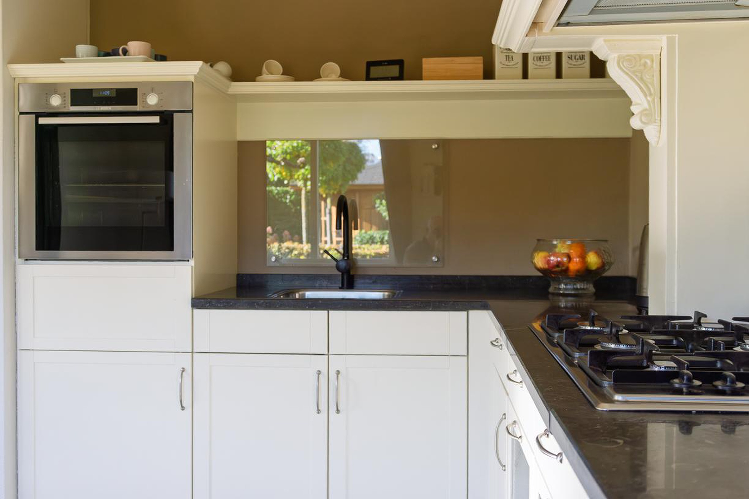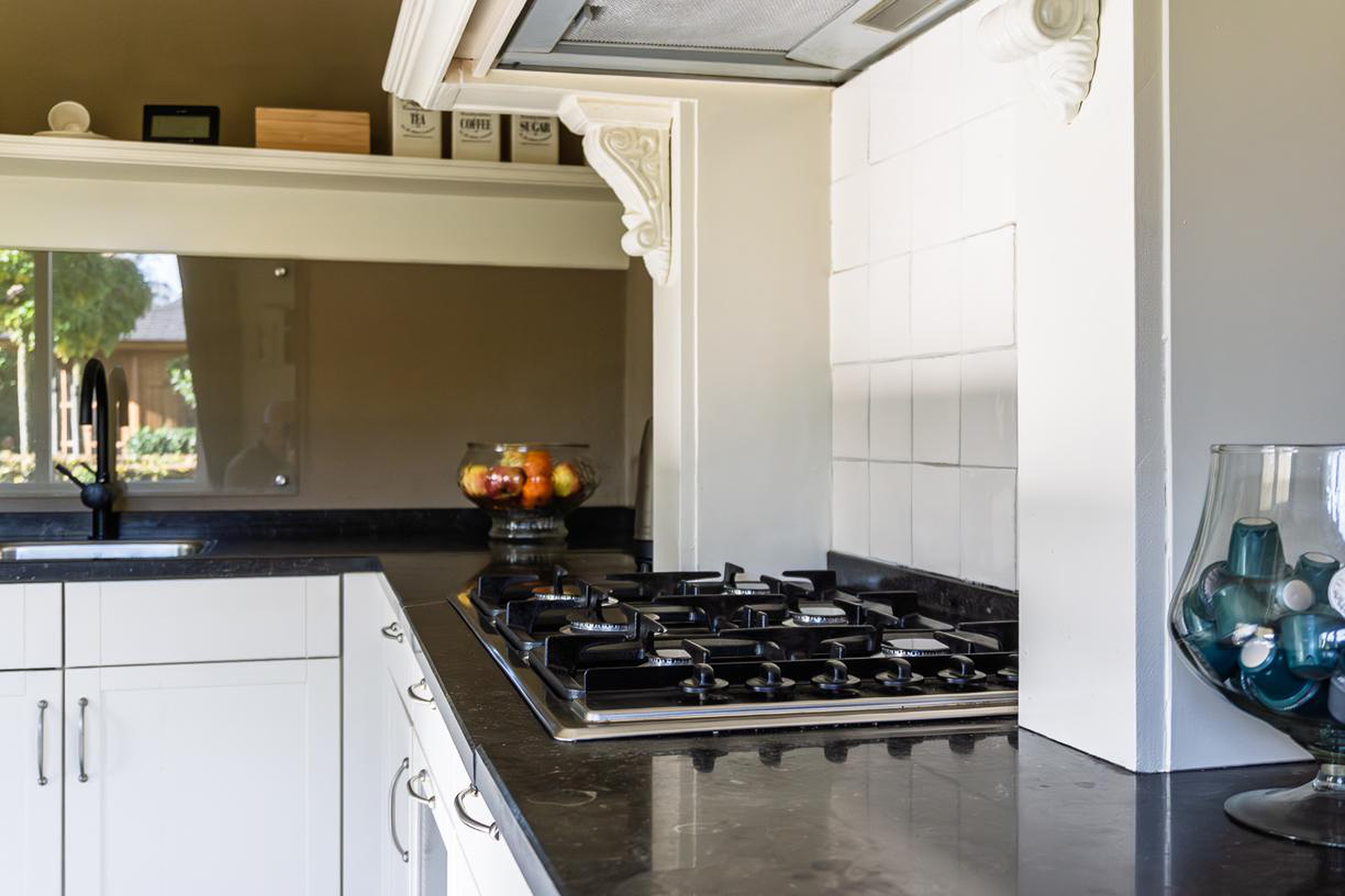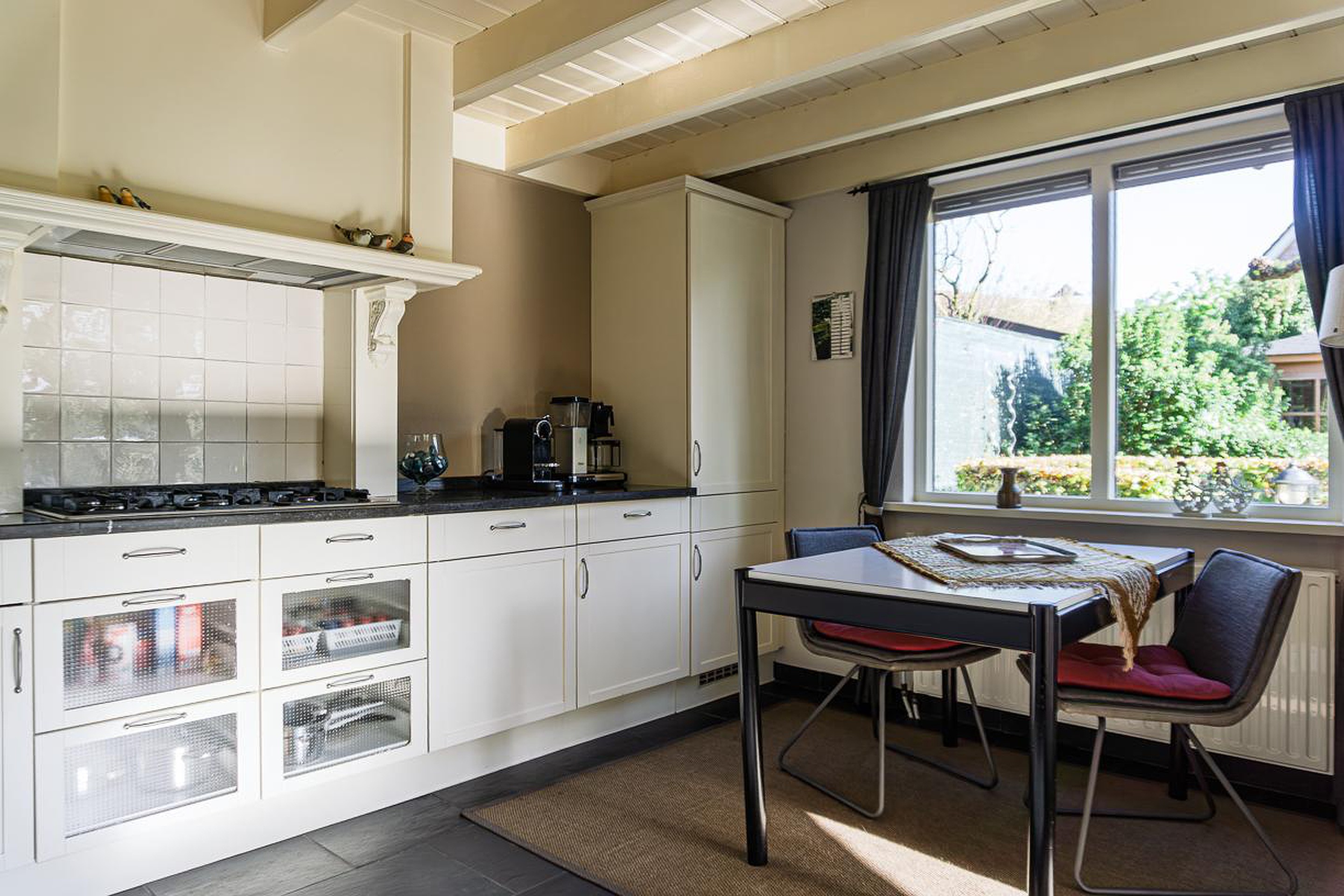 De keuken is gesitueerd in de uitbouw van de woning en toegankelijk vanuit de woonkamer en vanuit de garage. De L-vormige keukenopstelling beschikt over een natuurstenen werkblad met spoelbak en mengkraan. Onder het werkblad zijn voldoende lades en kasten aanwezig. Onder de schouw is het 6-pits gaskooktoestel ingebouwd in het werkblad met in de schouw de afzuigkap. Verder zijn ingebouwd een vaatwasser, een combi-oven/grill en een koel-/vriescombinatie. De keuken geeft toegang tot de veranda in de achtertuin en is afgewerkt met gespoten wanden, een houten balkenplafond en een leisteenvloer.