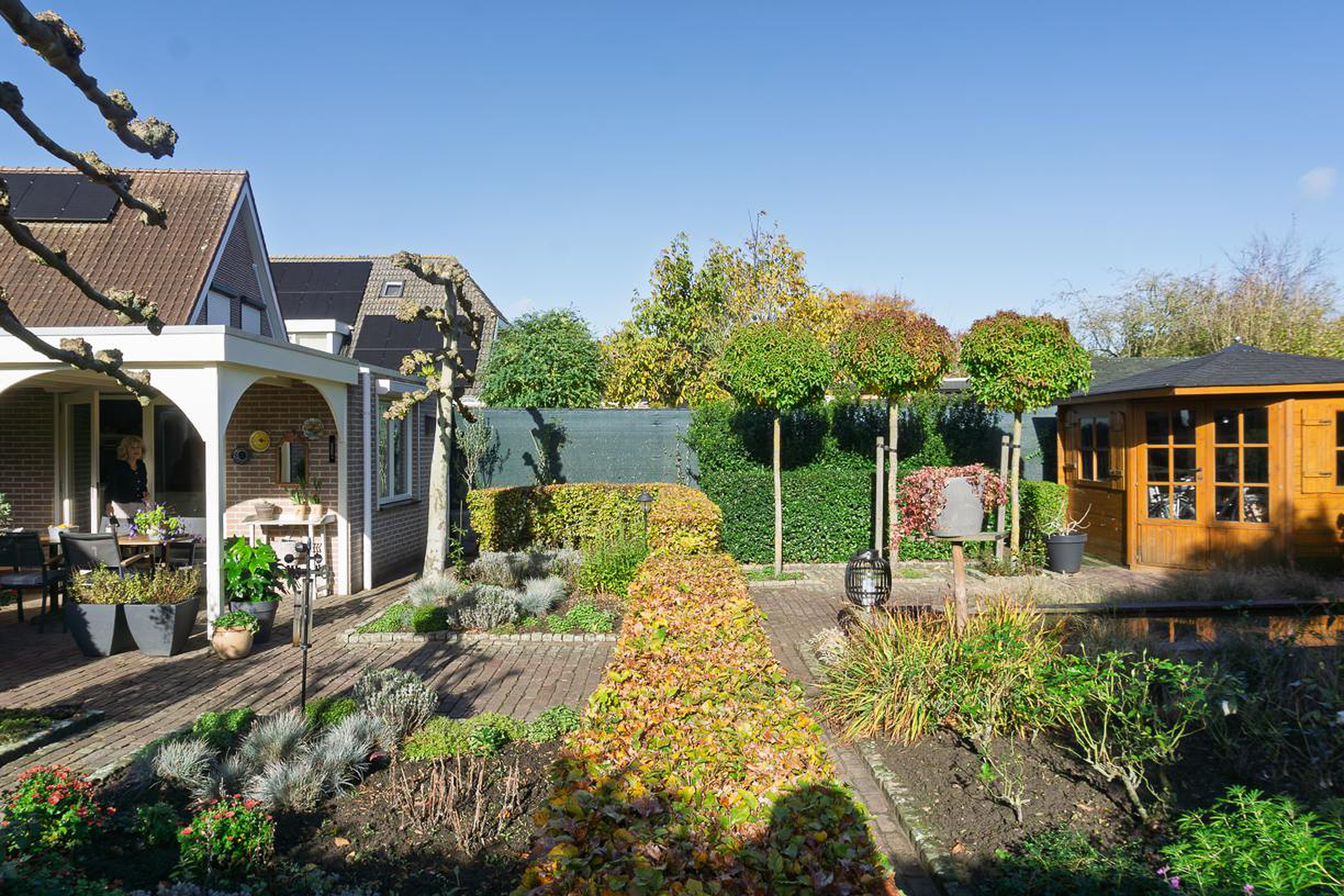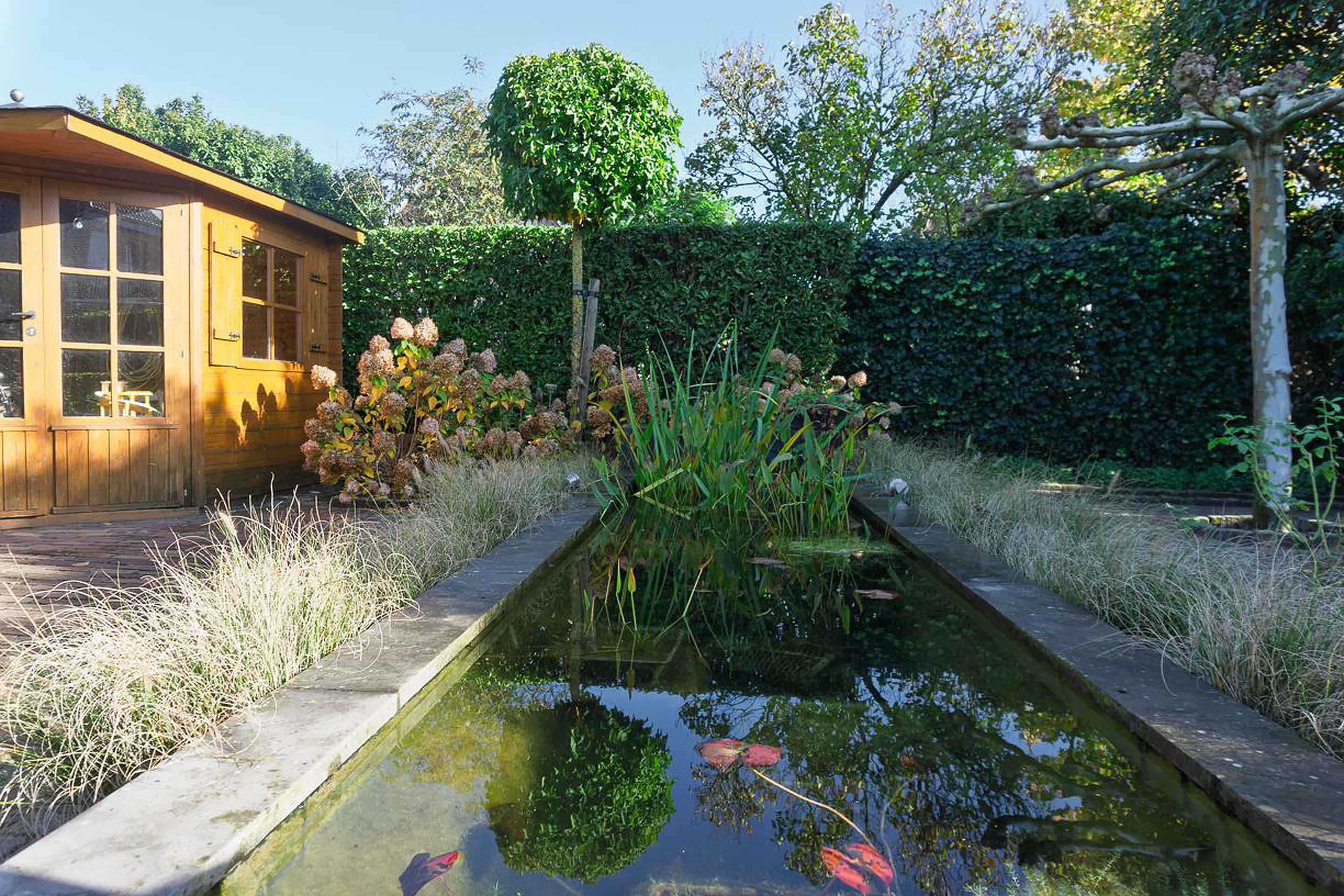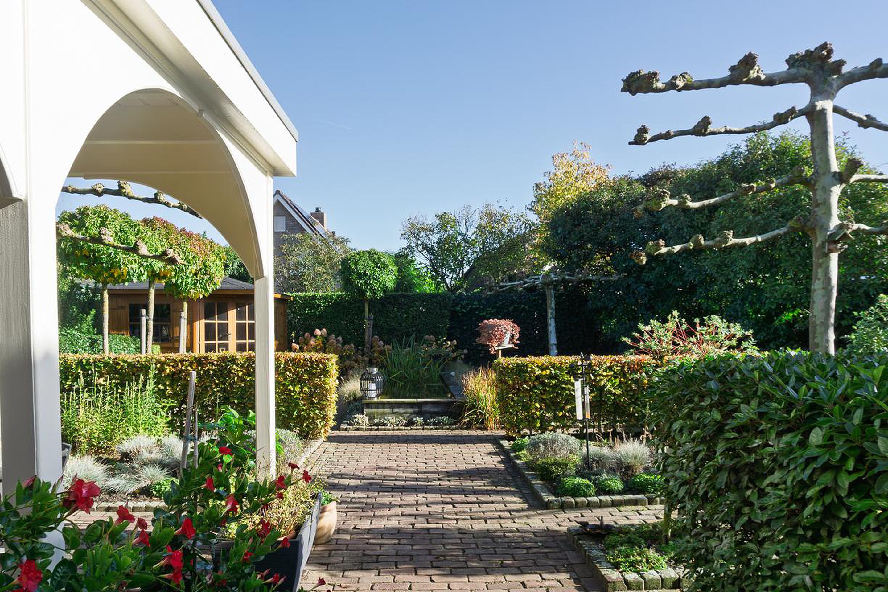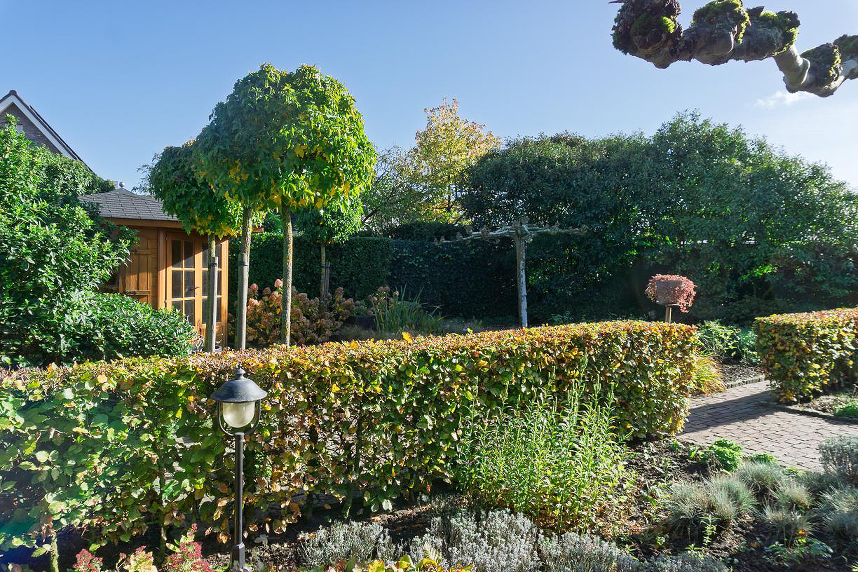 Tuin De tuin bij deze woning is een plaatje. De achtertuin is op het noordoosten gesitueerd waardoor er altijd een plaatsje is te vinden in de zon of in de schaduw. Voor de keuken staat een veranda waardoor het ook met minder weer hier fijn zitten is. De achtertuin is aangelegd in ‘kamers’ met klinkerbestrating, plantenborders, hagen, bomen en een verhoogde vijverpartij. Achter in de tuin staat een houten tuinberging voor onder andere de tuinspullen. De tuin is volledig omheind en grotendeels begroeid met hedera. In de omheining zit richting de zij-/voortuin een poort. De voortuin is aangelegd met hagen, platanen en bestrating. Voor de garage ligt de oprit waar 2 auto’s kunnen worden geparkeerd.