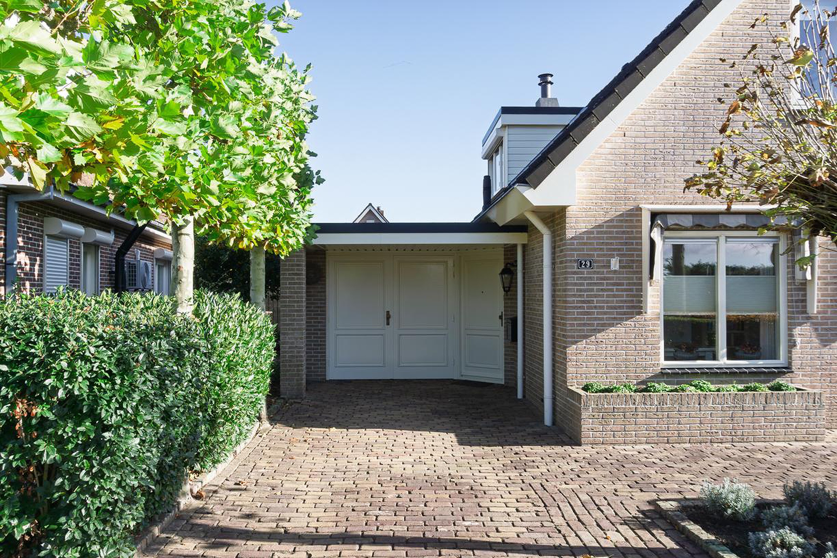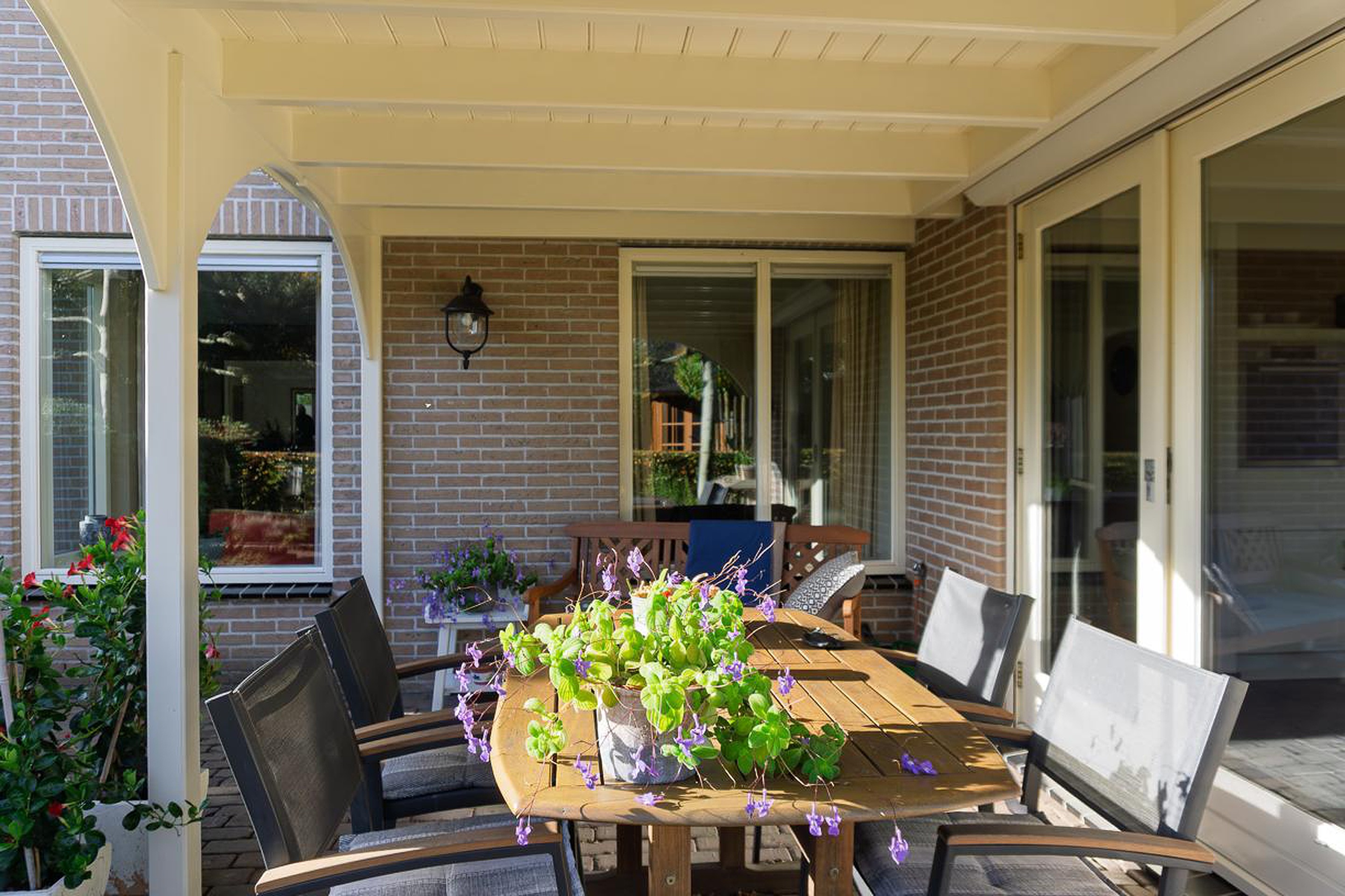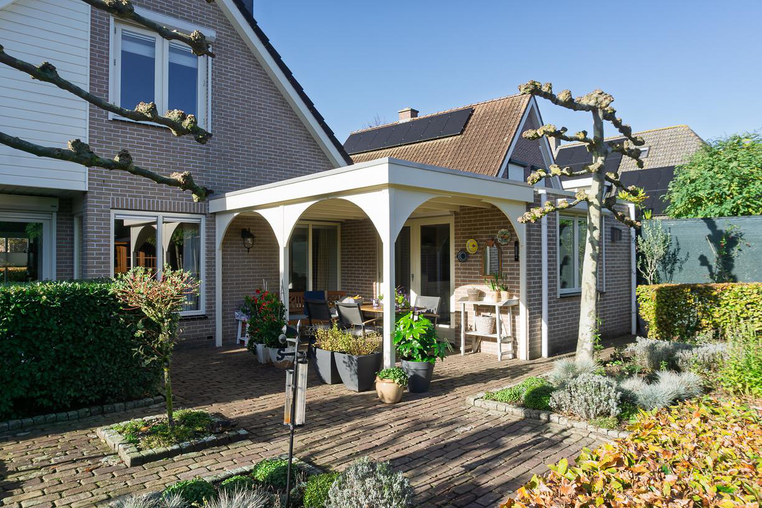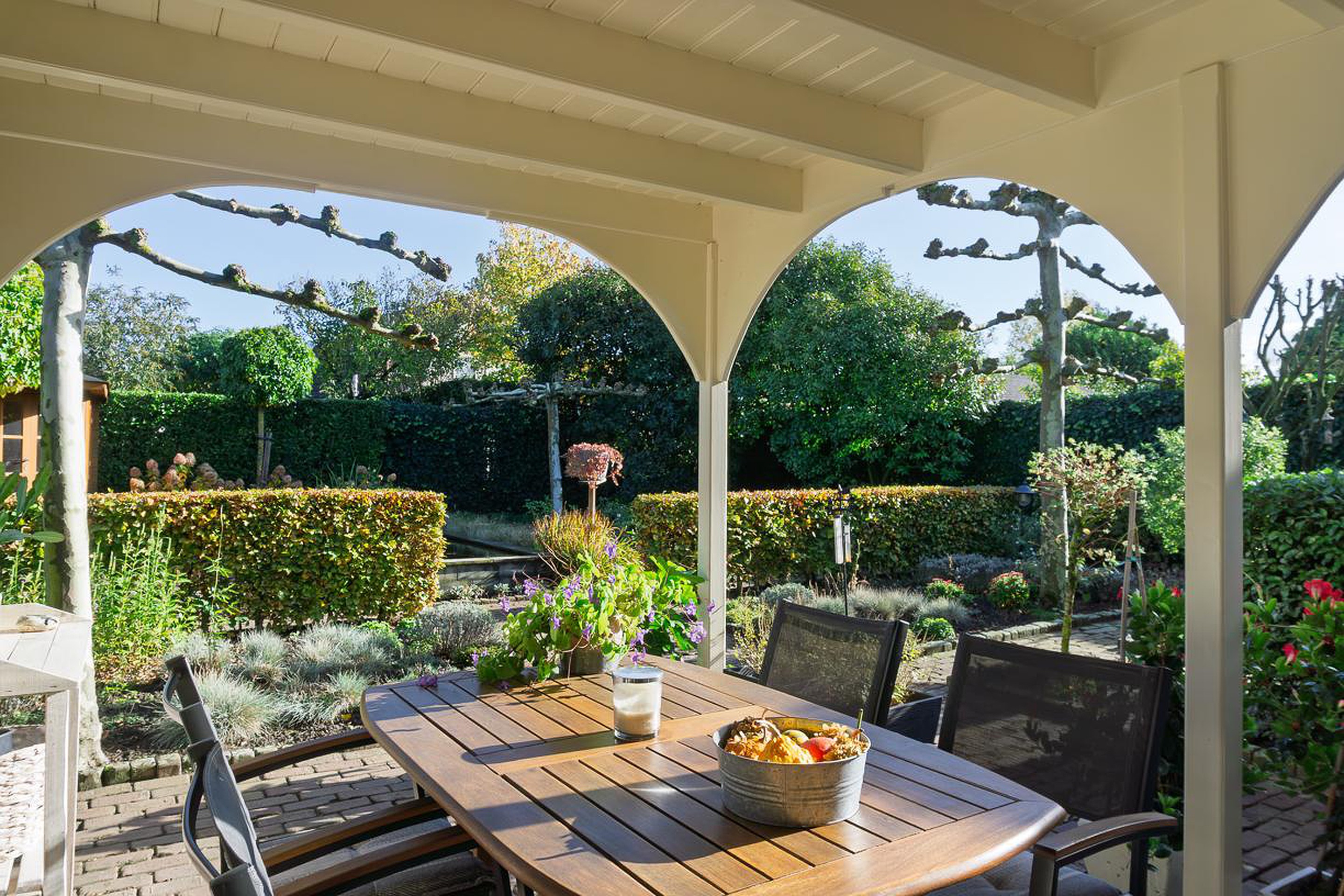 Tuin De tuin bij deze woning is een plaatje. De achtertuin is op het noordoosten gesitueerd waardoor er altijd een plaatsje is te vinden in de zon of in de schaduw. Voor de keuken staat een veranda waardoor het ook met minder weer hier fijn zitten is. De achtertuin is aangelegd in ‘kamers’ met klinkerbestrating, plantenborders, hagen, bomen en een verhoogde vijverpartij. Achter in de tuin staat een houten tuinberging voor onder andere de tuinspullen. De tuin is volledig omheind en grotendeels begroeid met hedera. In de omheining zit richting de zij-/voortuin een poort. De voortuin is aangelegd met hagen, platanen en bestrating. Voor de garage ligt de oprit waar 2 auto’s kunnen worden geparkeerd.