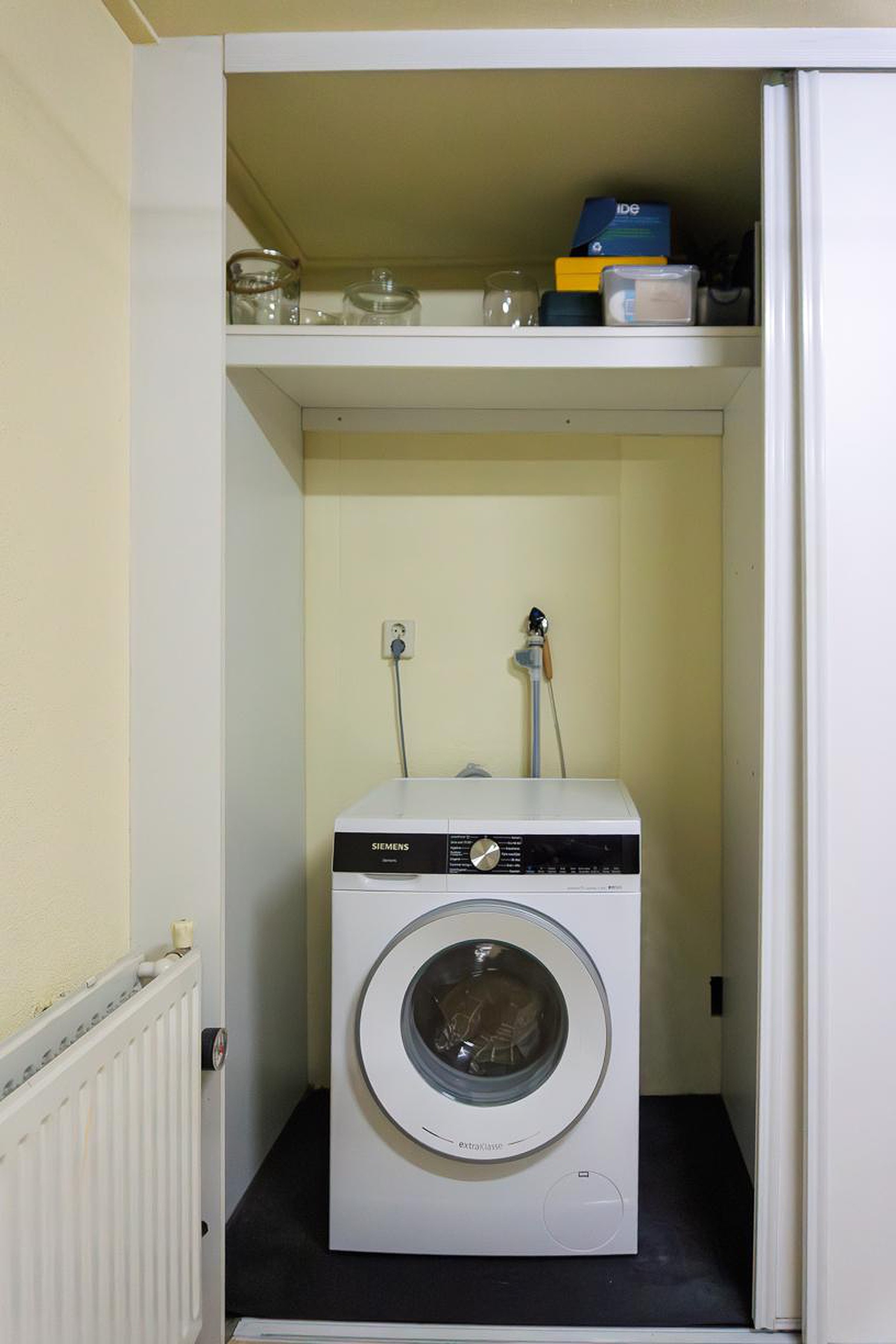 De garage kan zowel via de hal van de woning alsook via de keuken worden betreden. De verwarmde garage beschikt over een vaste bergkast waarin zijn weggewerkt de aansluitingen voor de wasmachine en wasdroger. In de garage is een uitgietbak aanwezig en hangt de cv-ketel. Dit betreft een Nefit trendline CW5 van het bouwjaar 2014. De garage is afgewerkt met vinyl op de betonvloer en een gipsplaten plafond.