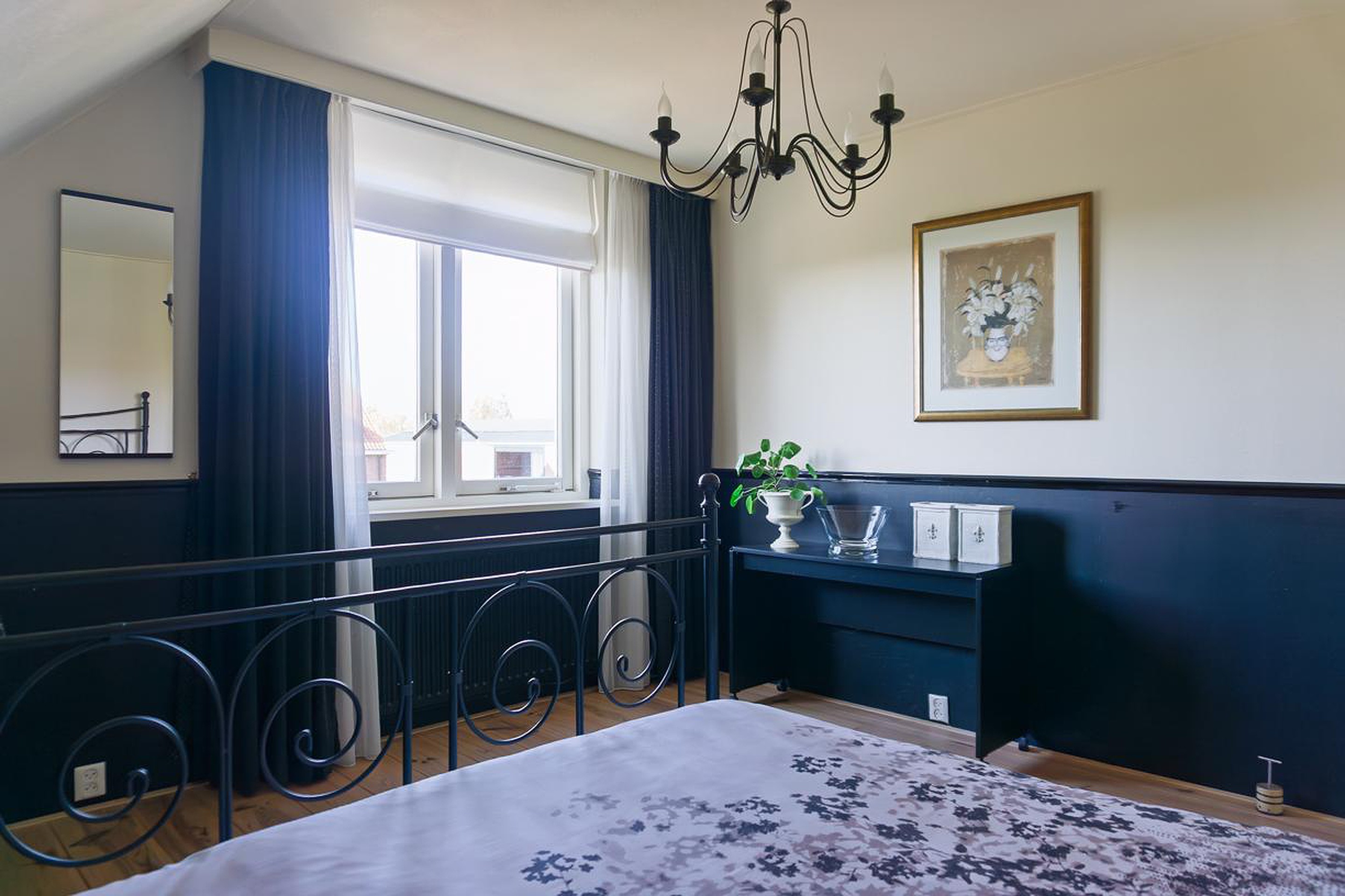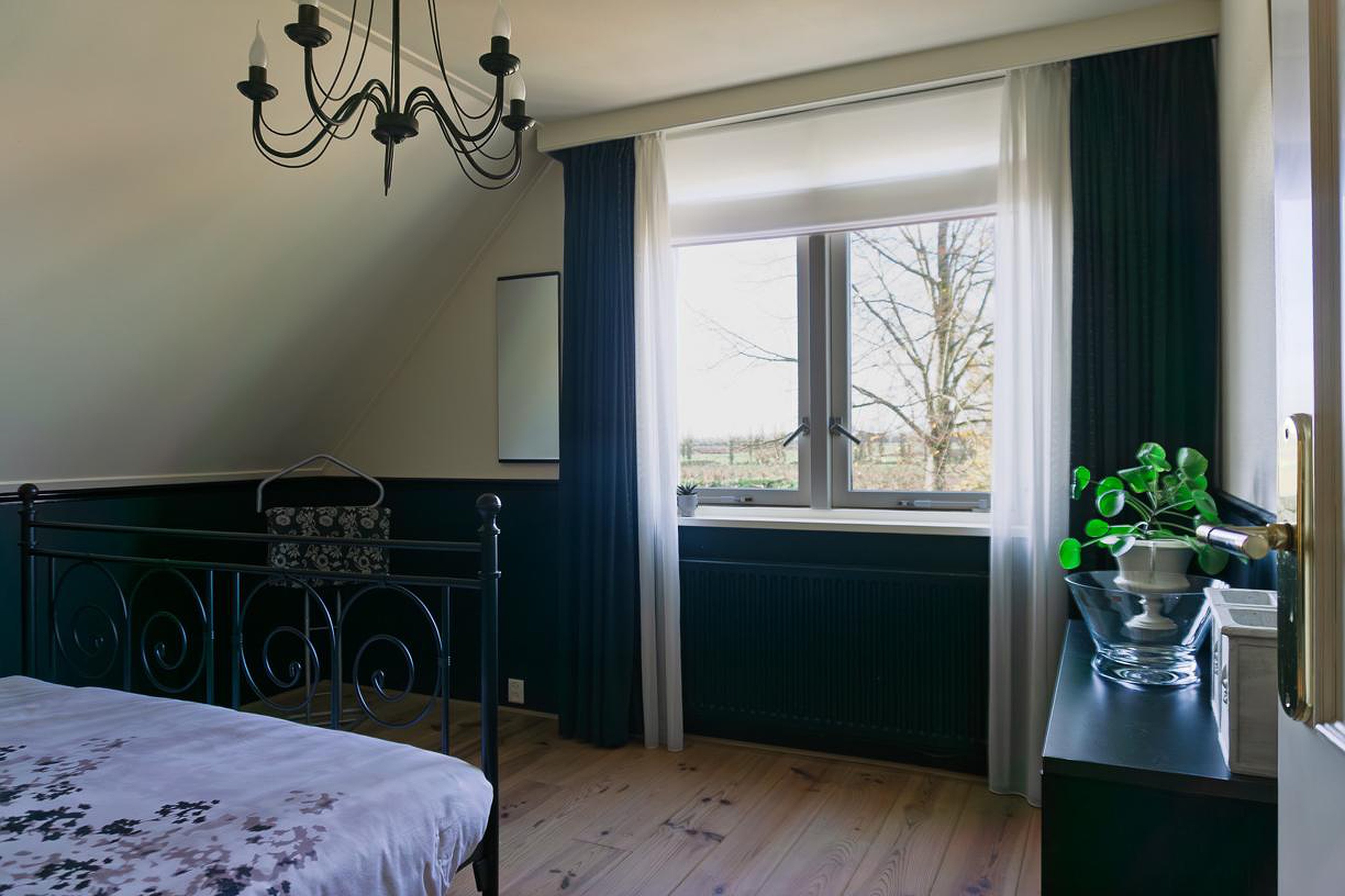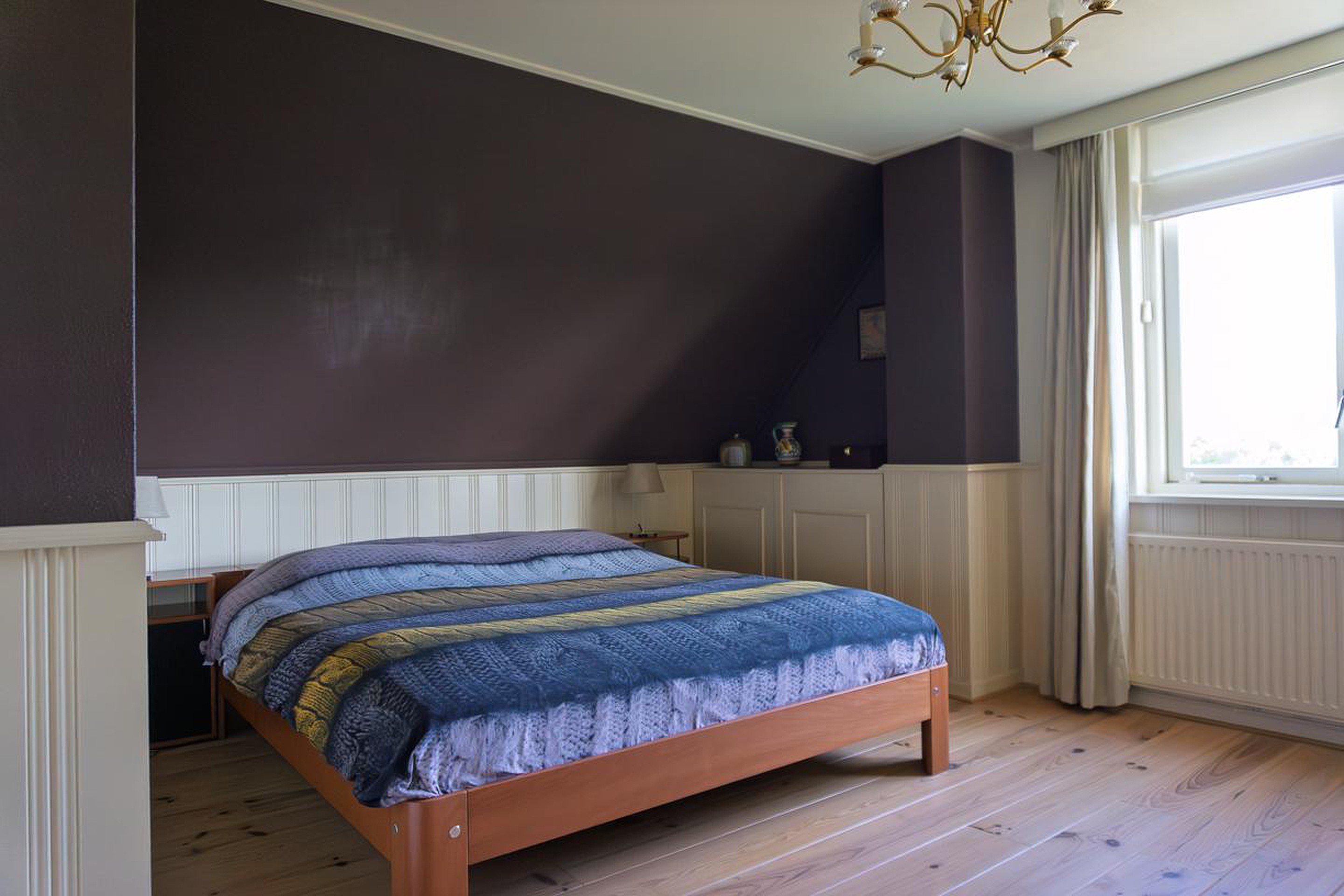 Deze slaapkamer is aan de achterzijde van de woning gelegen en heeft via het raam een mooi uitzicht over de achtertuin. In de hoek van de slaapkamer zijn in een nis vaste (kleding)kasten aanwezig. De afwerking van de slaapkamer bestaat uit lambrisering op de wanden met hierboven spuitwerk. Het plafond is eveneens afgewerkt met spuitwerk en op de vloer liggen grenen vloerdelen.