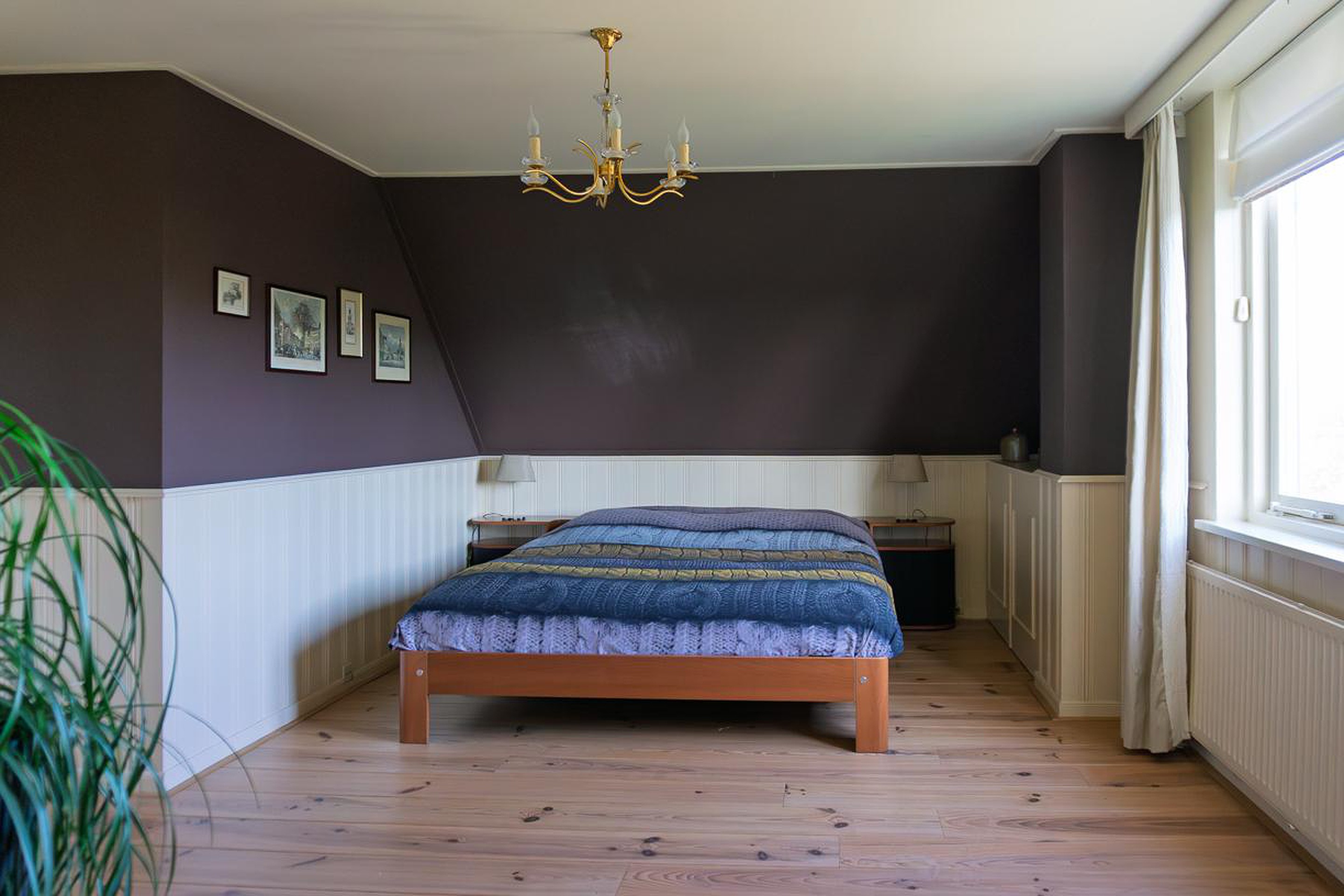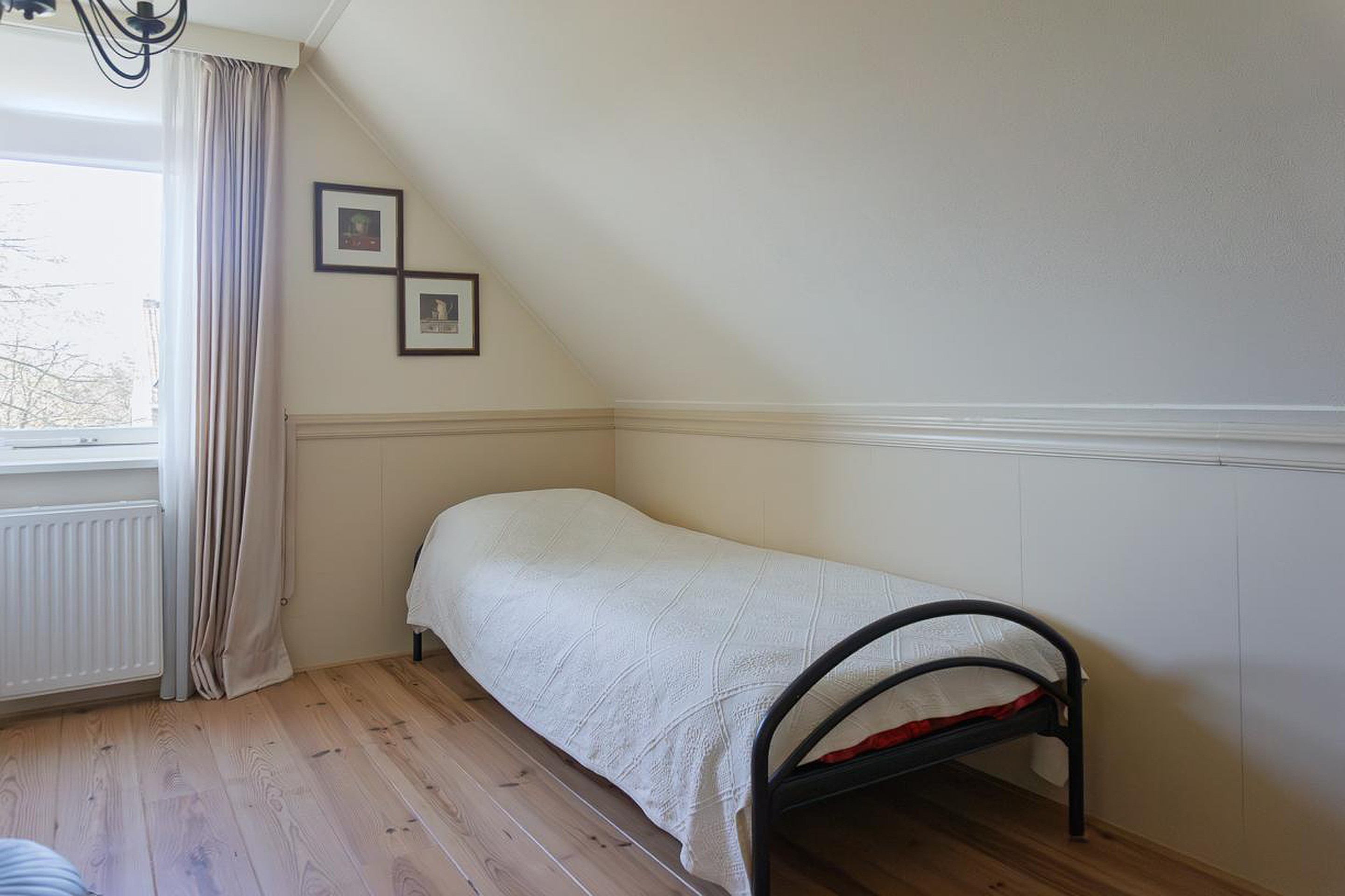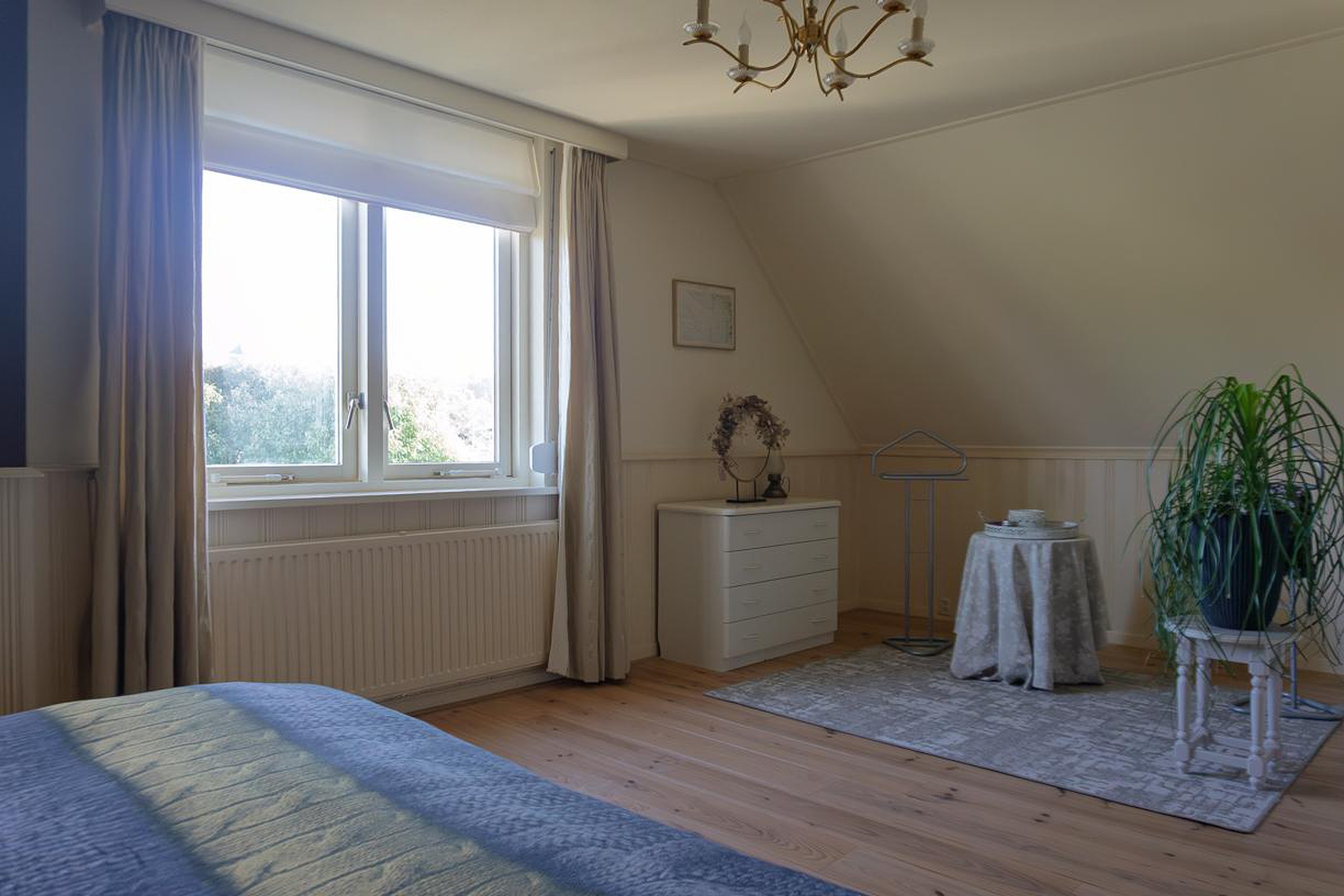 Deze slaapkamer is aan de achterzijde van de woning gelegen en heeft via het raam een mooi uitzicht over de achtertuin. In de hoek van de slaapkamer zijn in een nis vaste (kleding)kasten aanwezig. De afwerking van de slaapkamer bestaat uit lambrisering op de wanden met hierboven spuitwerk. Het plafond is eveneens afgewerkt met spuitwerk en op de vloer liggen grenen vloerdelen.