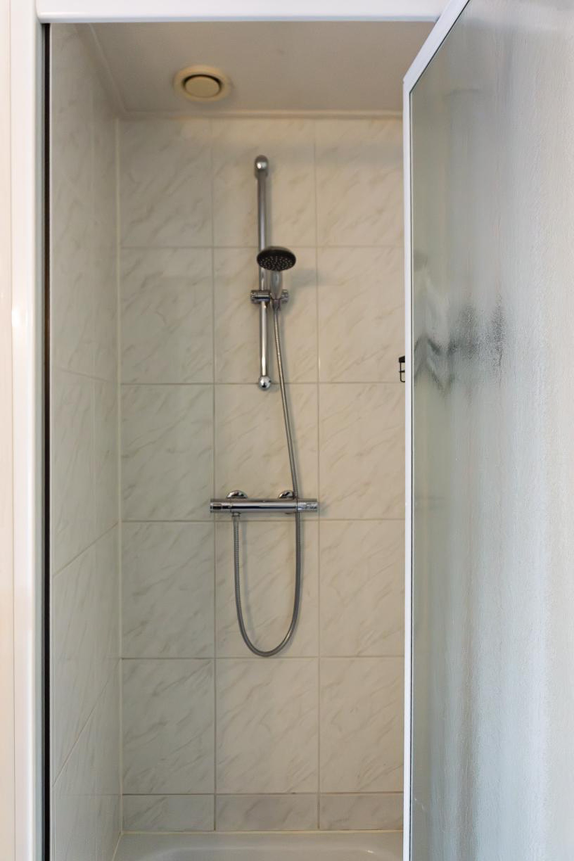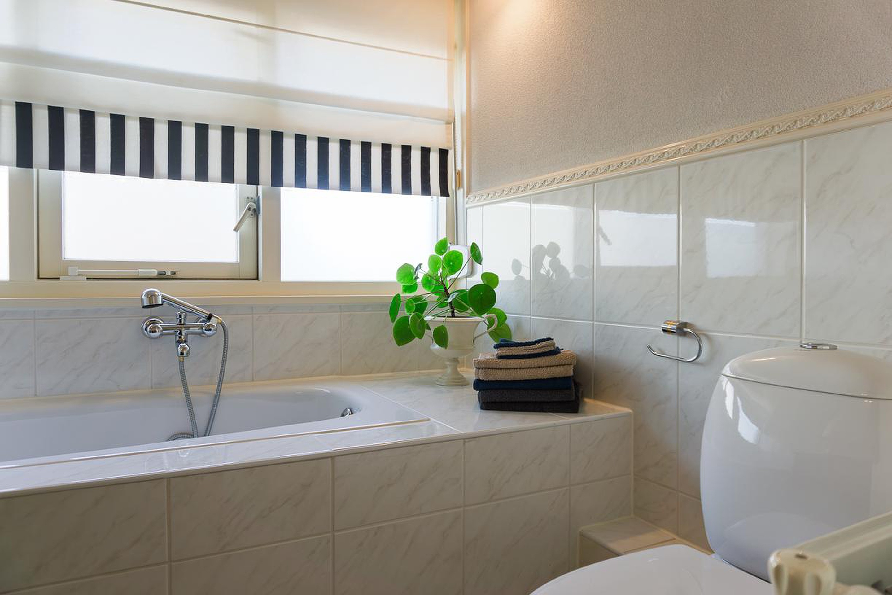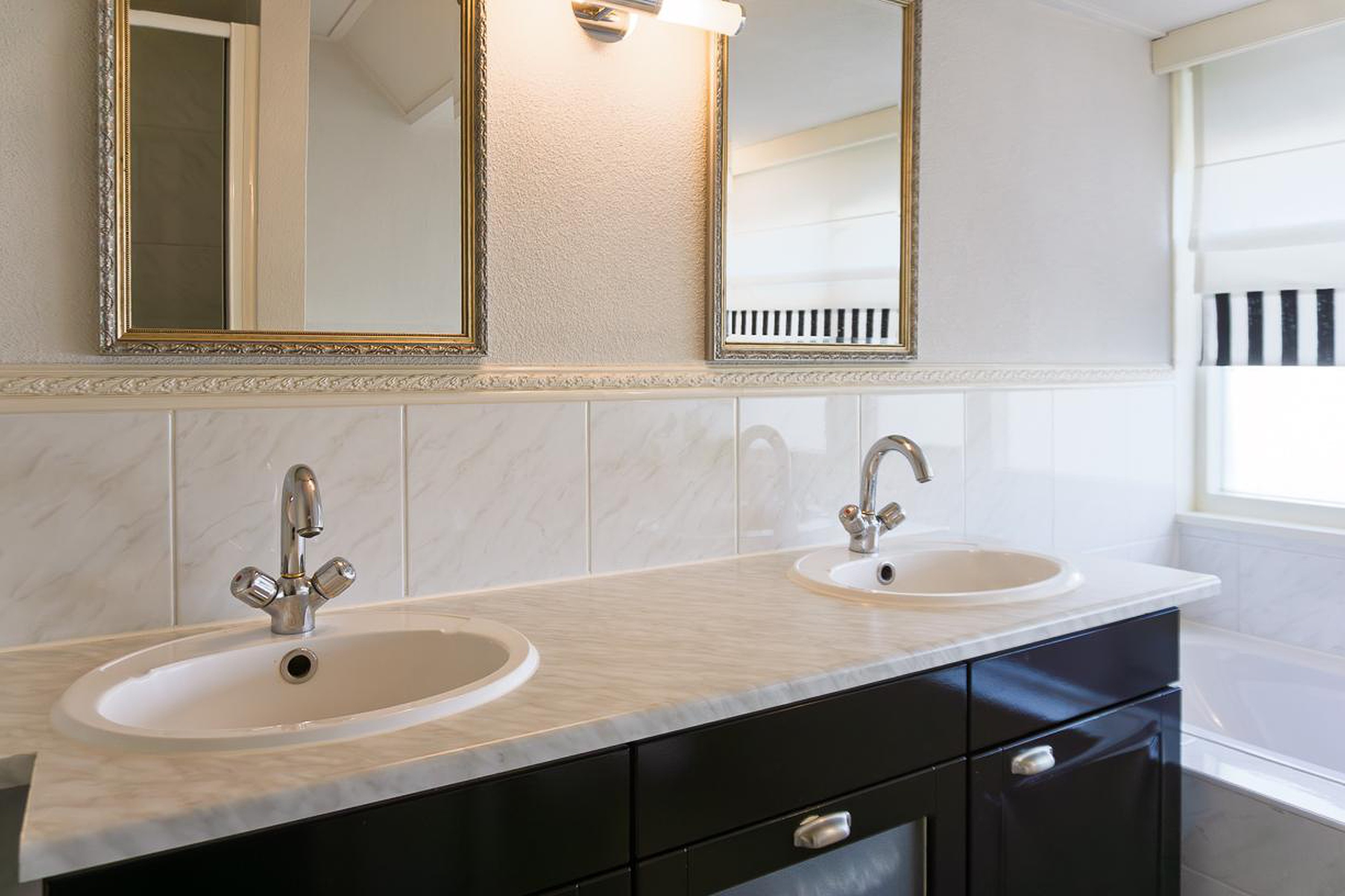 De badkamer heeft een dakkapel waardoor de beloopbare ruimte aanzienlijk is vergroot. De badkamer beschikt over een ligbad, een instapdouche, een duoblok toilet en een dubbele wastafel ingebouwd in een badmeubel. De afwerking van de badkamer bestaat uit een betegelde vloer en tot halfhoog betegelde wanden met hierboven spuitwerk. De wanden van de douche zijn volledig betegeld.