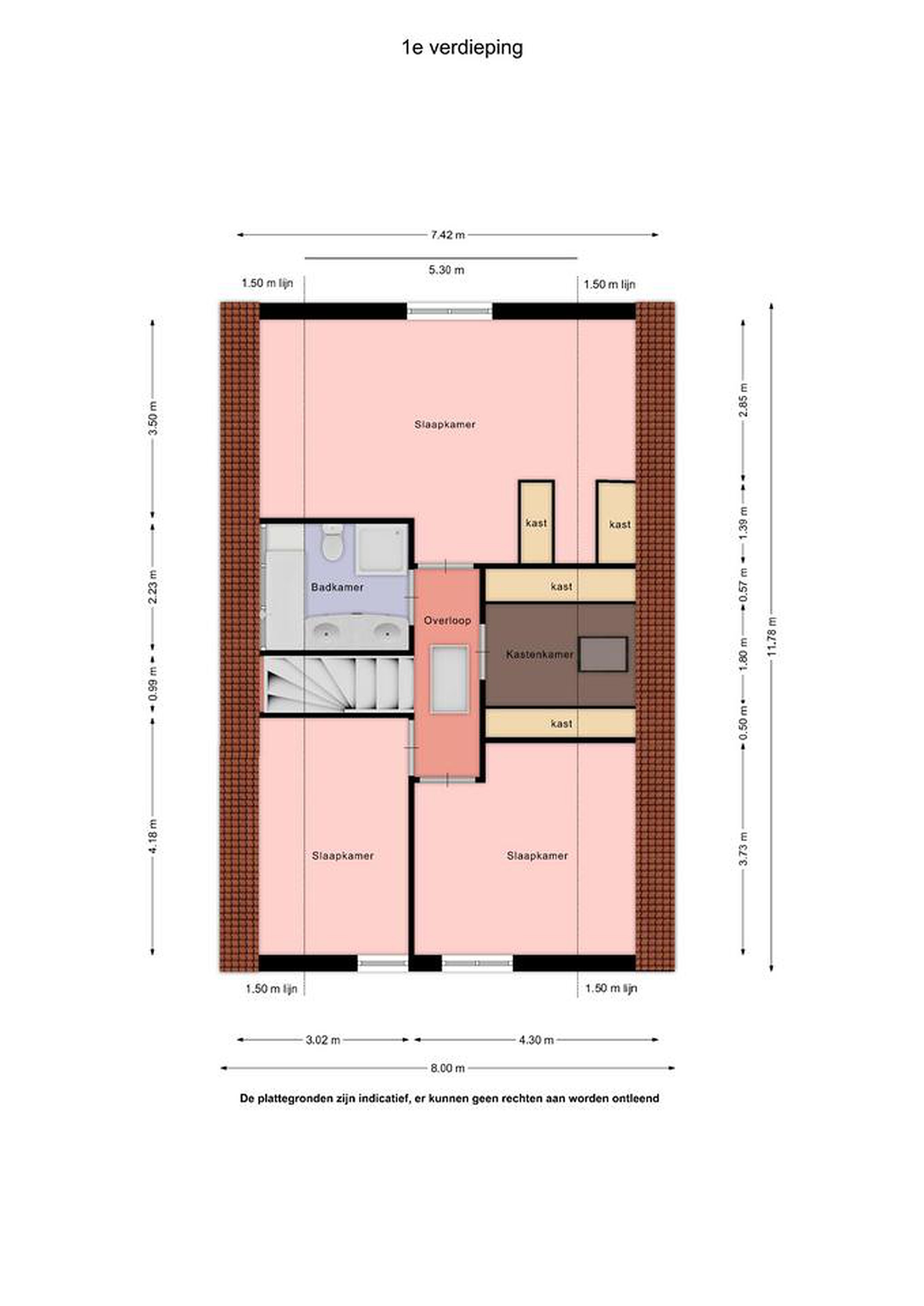 Eerste verdieping Via de trapopgang in de hal wordt de overloop van de 1e verdieping bereikt. De overloop geeft toegang tot 3 slaapkamers, een kastenkamer en een badkamer. In de schuinten van het dakvlak zijn over de hele verdieping knieschotten aangebracht waarachter veel bergruimte schuilgaat.