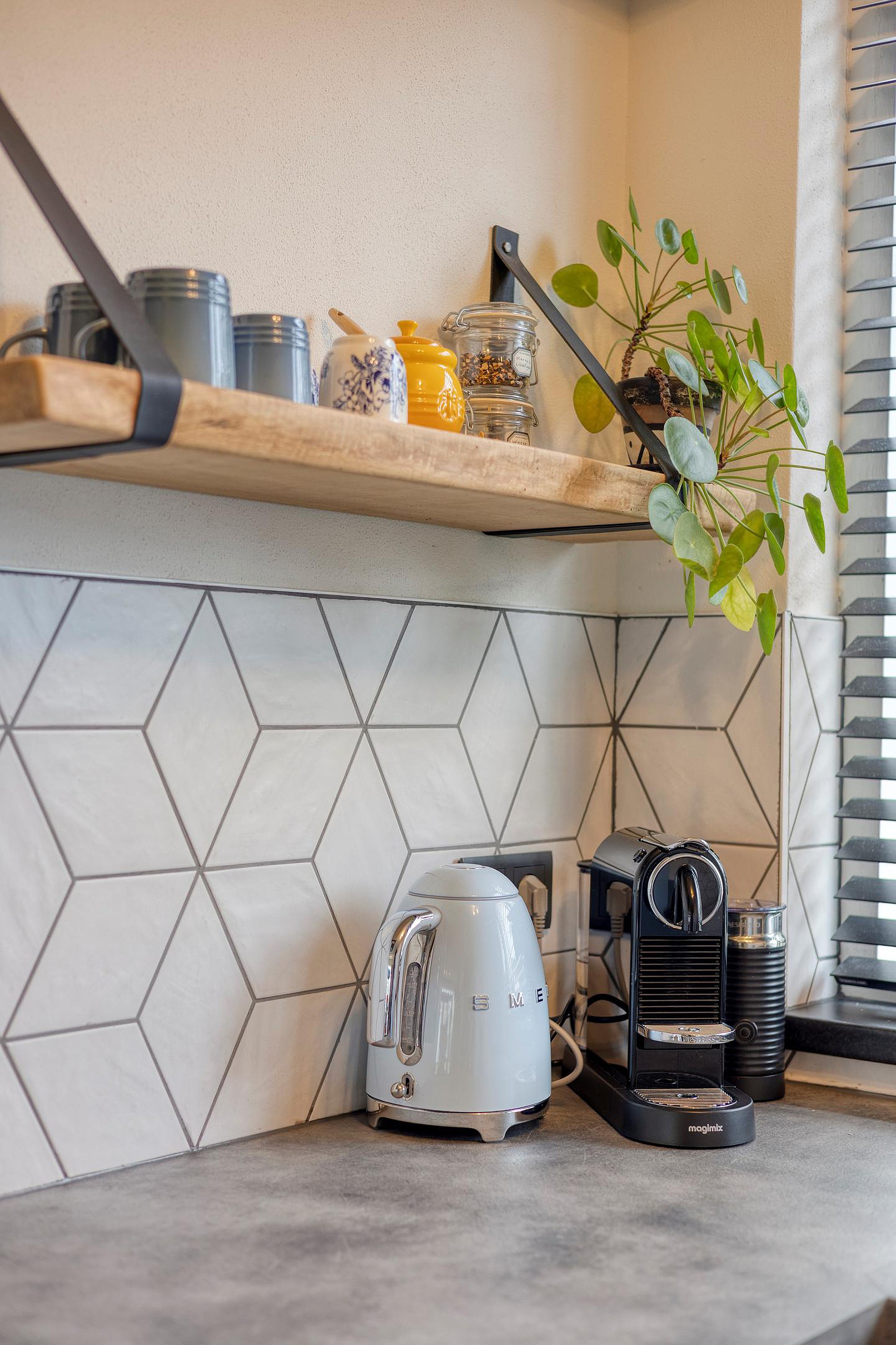 Dankzij de aanbouw is hier een royale, tuingerichte leefruimte ontstaan waar het heerlijk vertoeven is. Via de schuifpui loop je zo de tuin in. De combinatie van vloerverwarming en een sfeervolle houtkachel zorgt voor comfort in elk seizoen. Aan de voorzijde bevindt zich de moderne zwarte hoekkeuken (2021), voorzien van onder andere een inductiekookplaat, oven en vaatwasser. Fijn dat hier een raam is, zodat je, al lekker kokkerellend de straat kunt inzien.
