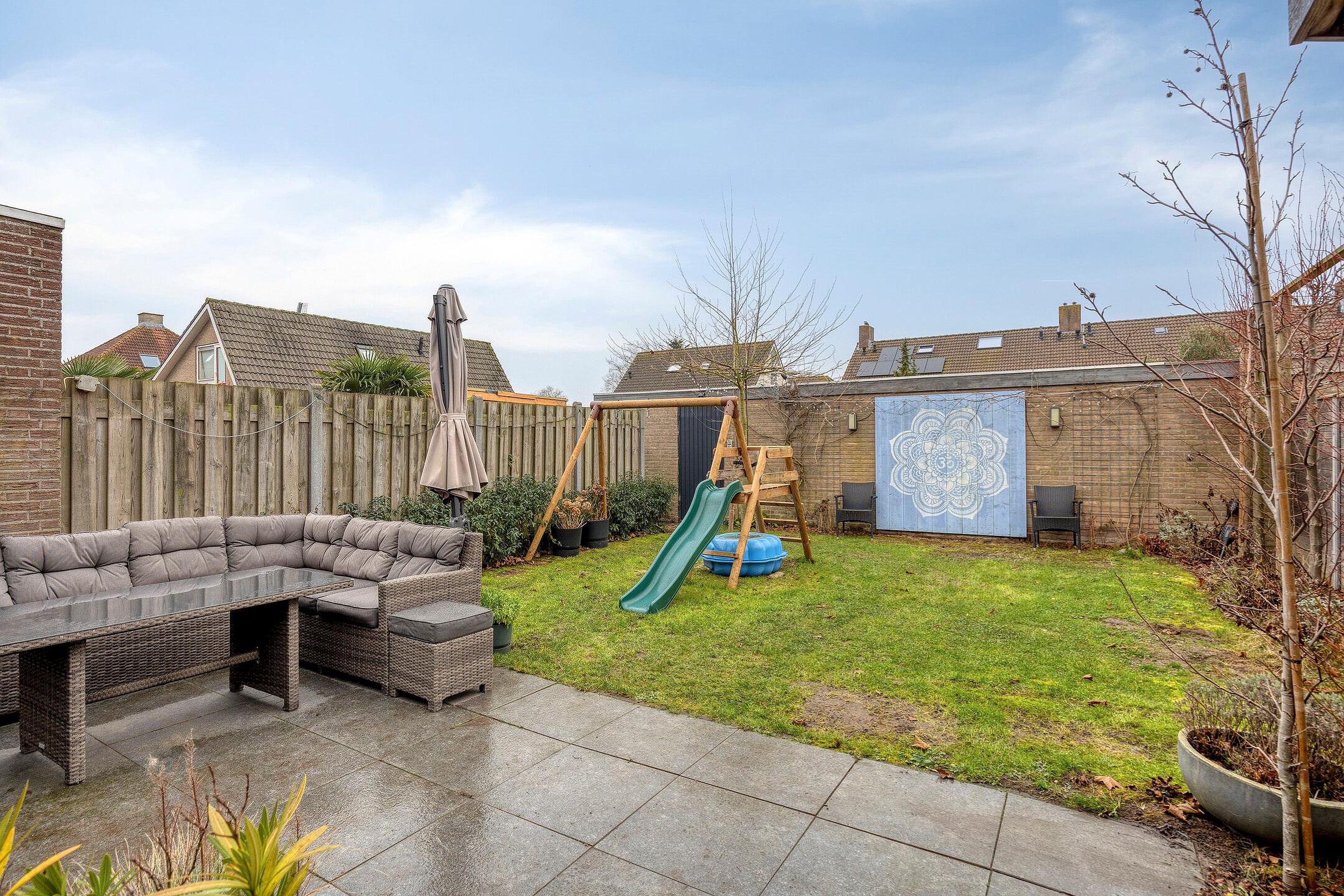 Tuin De achtertuin is gelegen op het westen en biedt, als de zon schijnt, de hele dag zon. De tuin is volledig omsloten, wat zorgt voor veel privacy en een veilige speelplek voor kinderen en huisdieren. Direct naast de woning is garage nummer één, achterin de tuin is de tweede garage. Deze garage heeft de ontsluiting naar de Minnaarhof. De vrije achterom komt ook hierop uit.