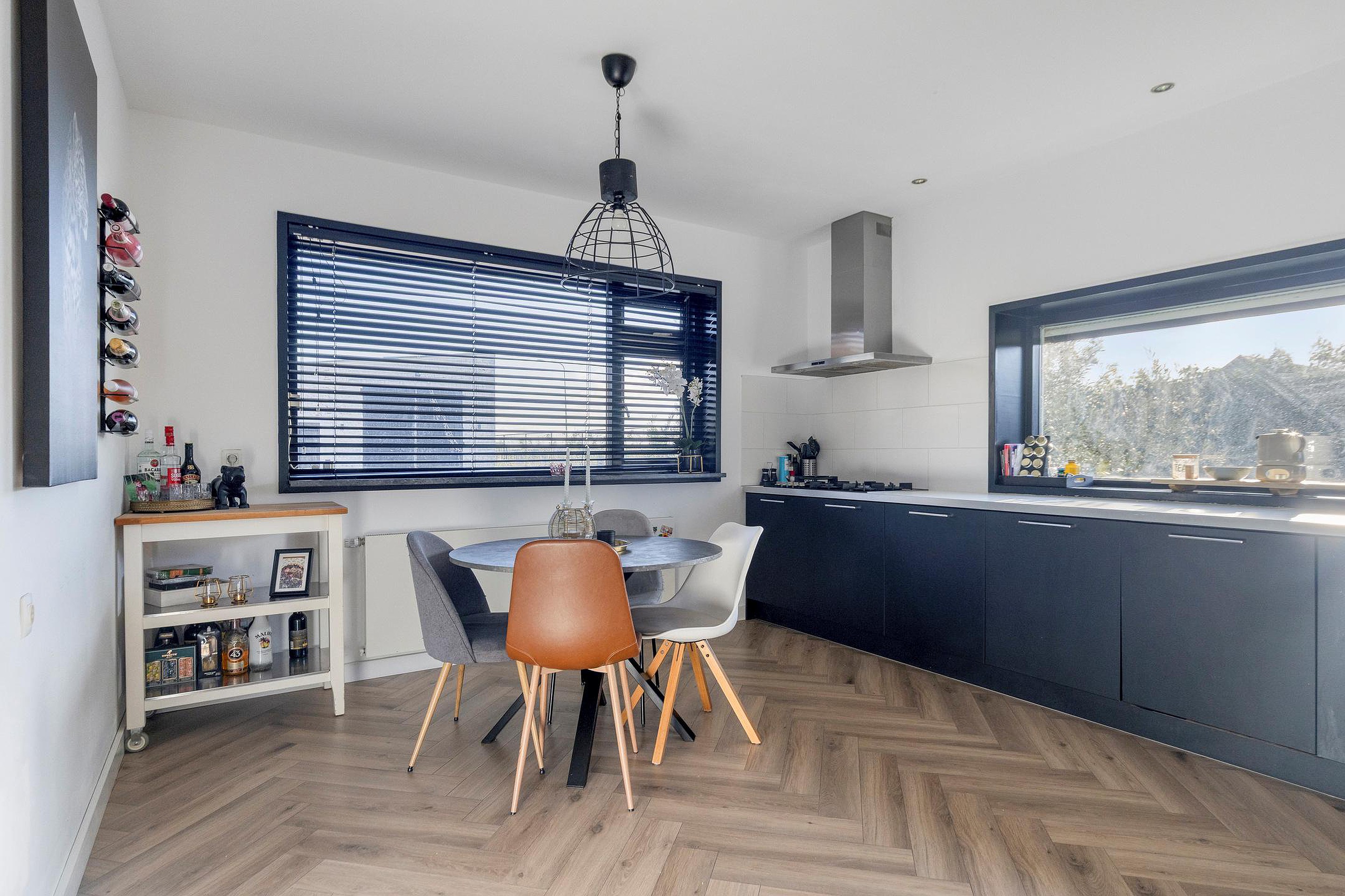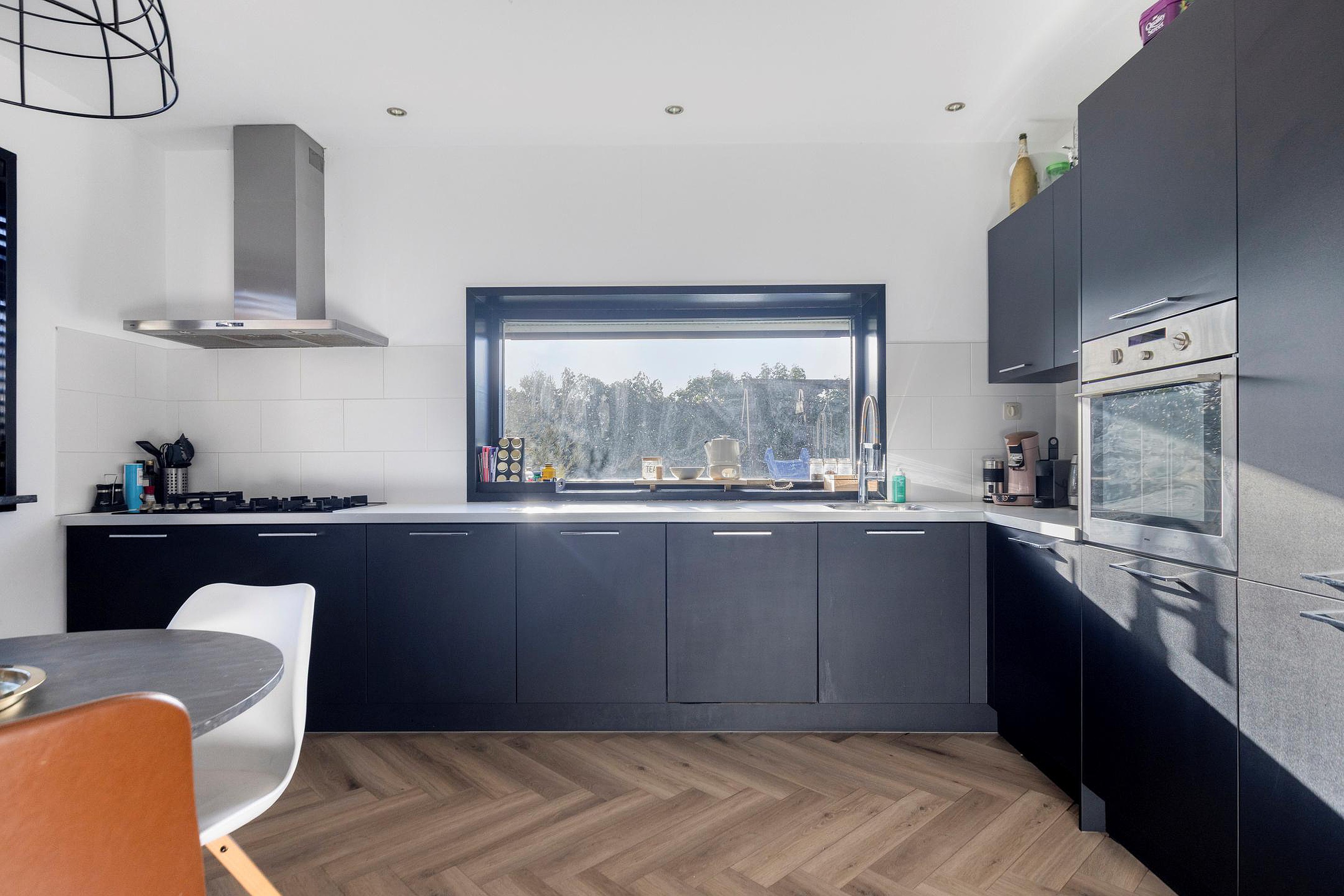 De open woonkeuken is uitgevoerd in een hoekopstelling en voorzien van diverse inbouwapparatuur, waaronder een oven, 5-pits gasfornuis, afzuigkap, vaatwasser, koelkast en vriezer. Via de kelderkast is de kelder bereikbaar, met een oppervlakte van circa 12 m2, geschikt voor opslag of provisie.