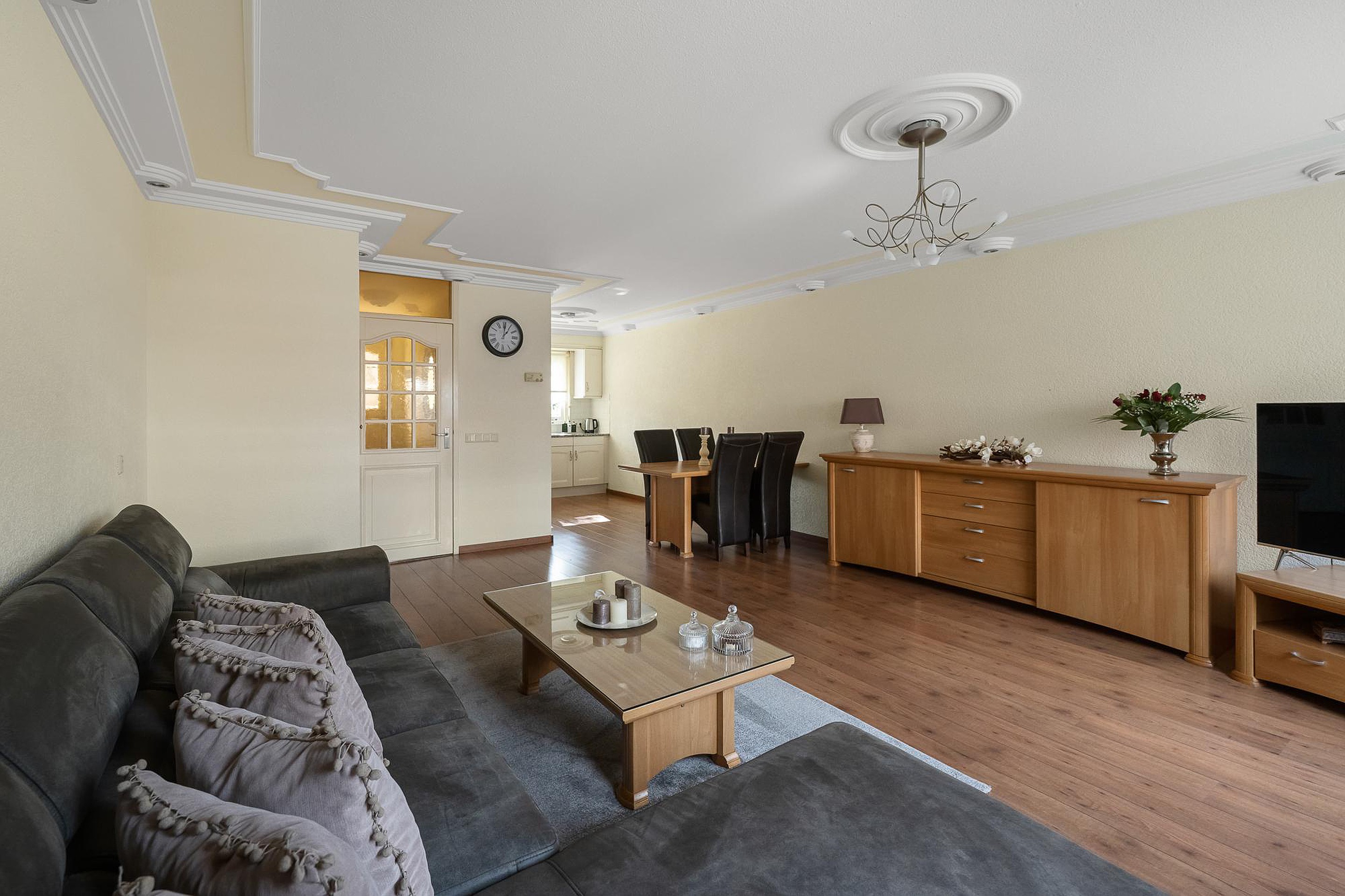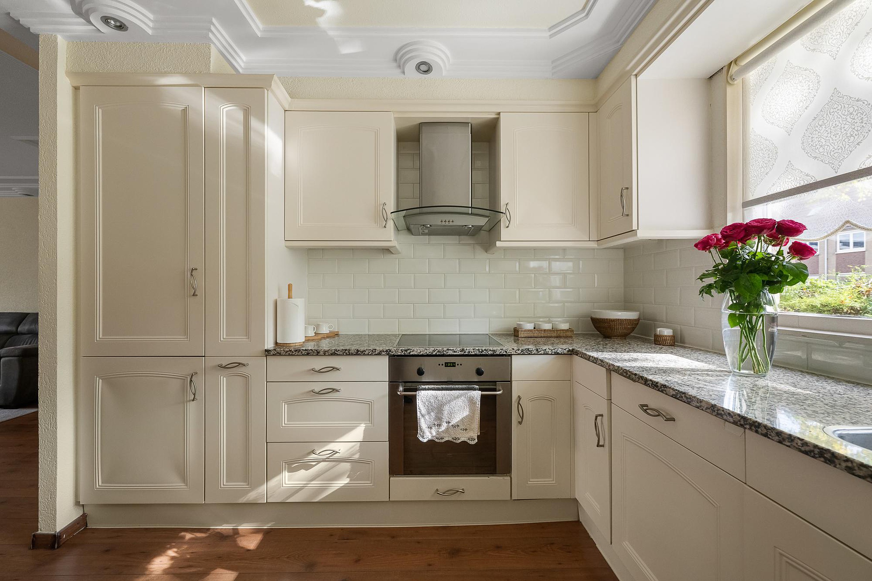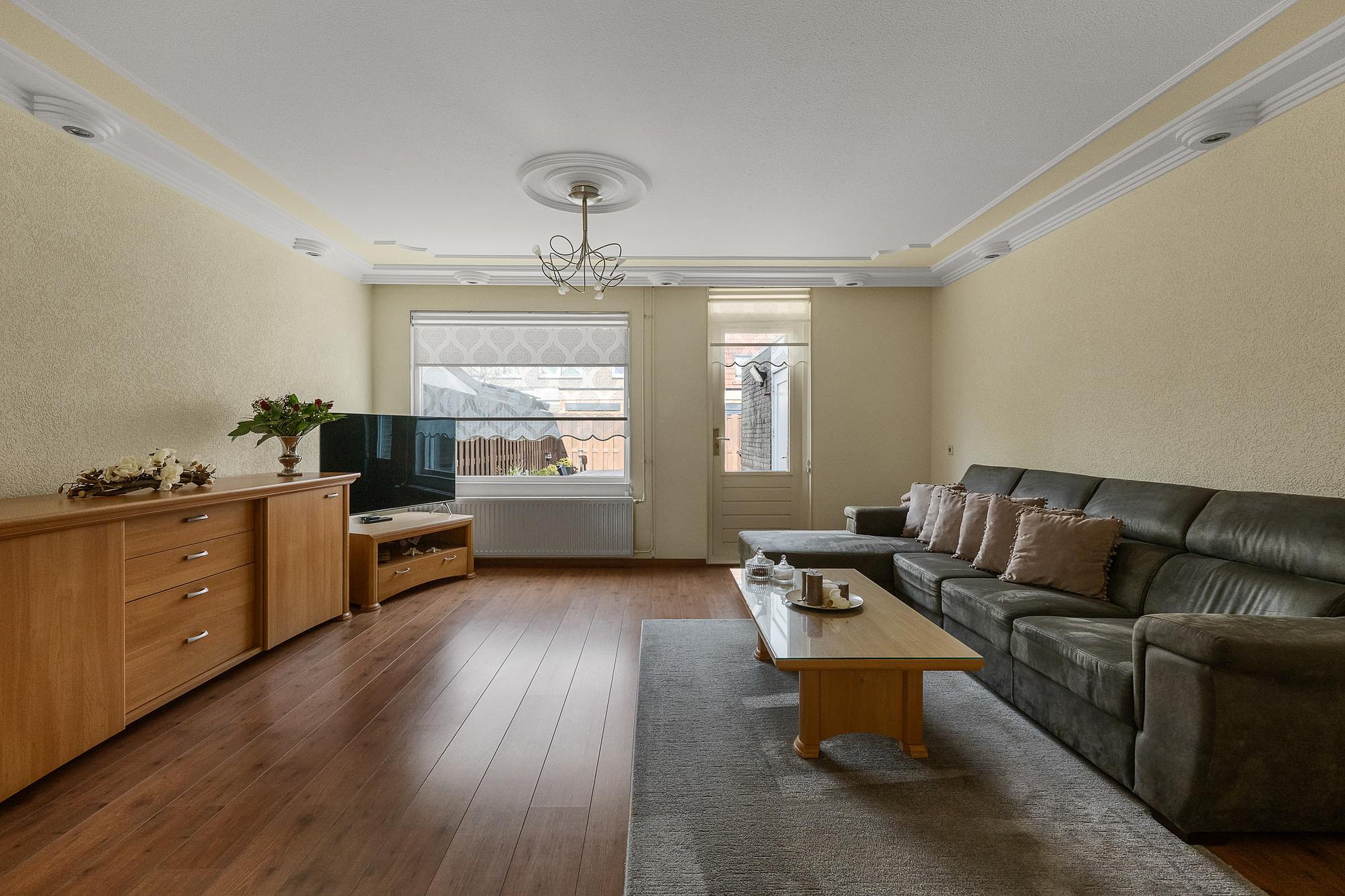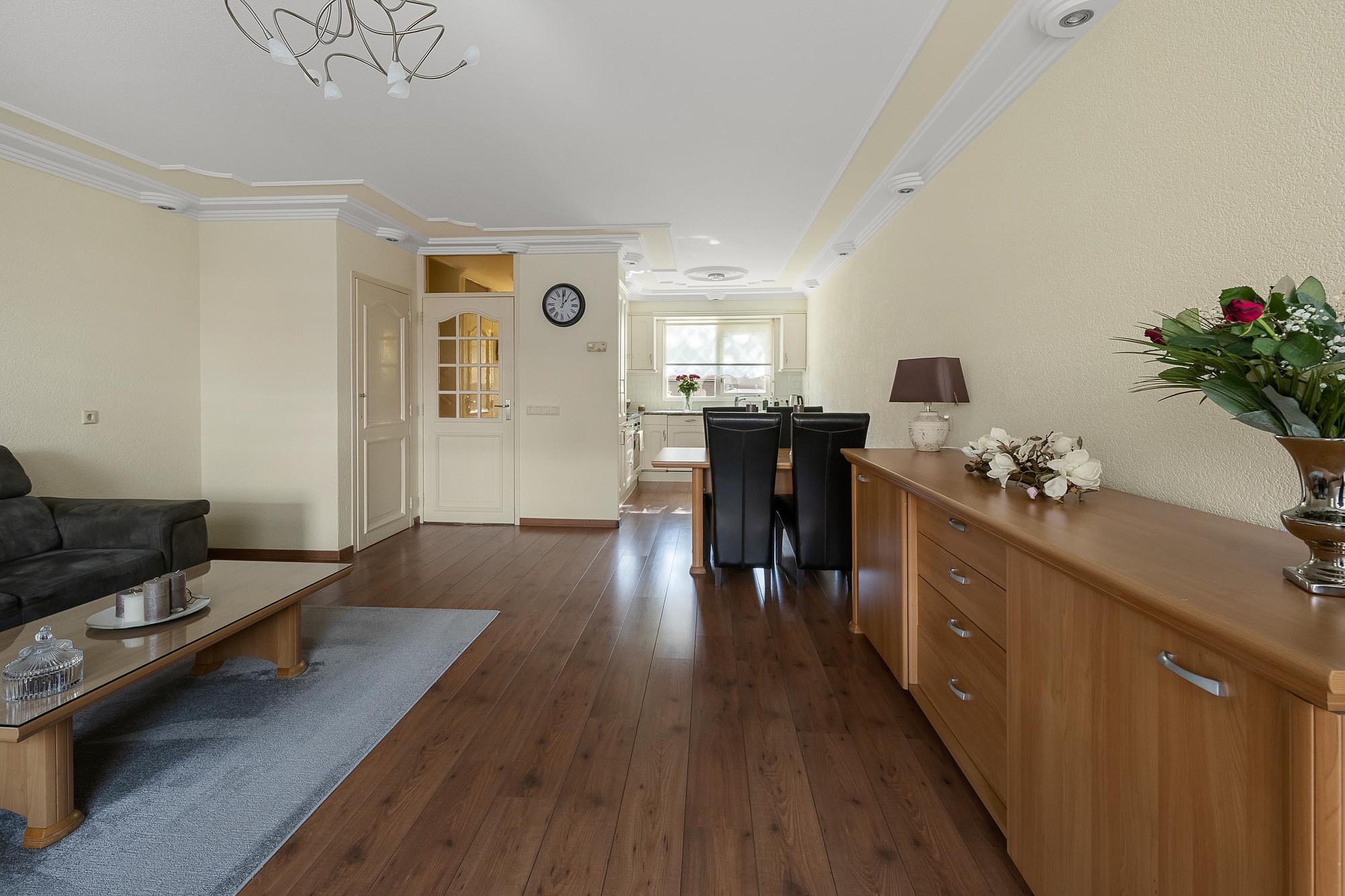 De tuingerichte woonkamer heeft een laminaatvloer met een groot raam en een deur aan de zonnige noordwestkant. Onder de trap is een handige bergkast De open keuken staat in hoekopstelling aan de straatkant is rond 2005 geplaatst, met een graniet kleurig aanrechtblad en diverse inbouwapparatuur: een inductiekookplaat, afzuigkap, oven, koelkast met vriezer en een vaatwasser.