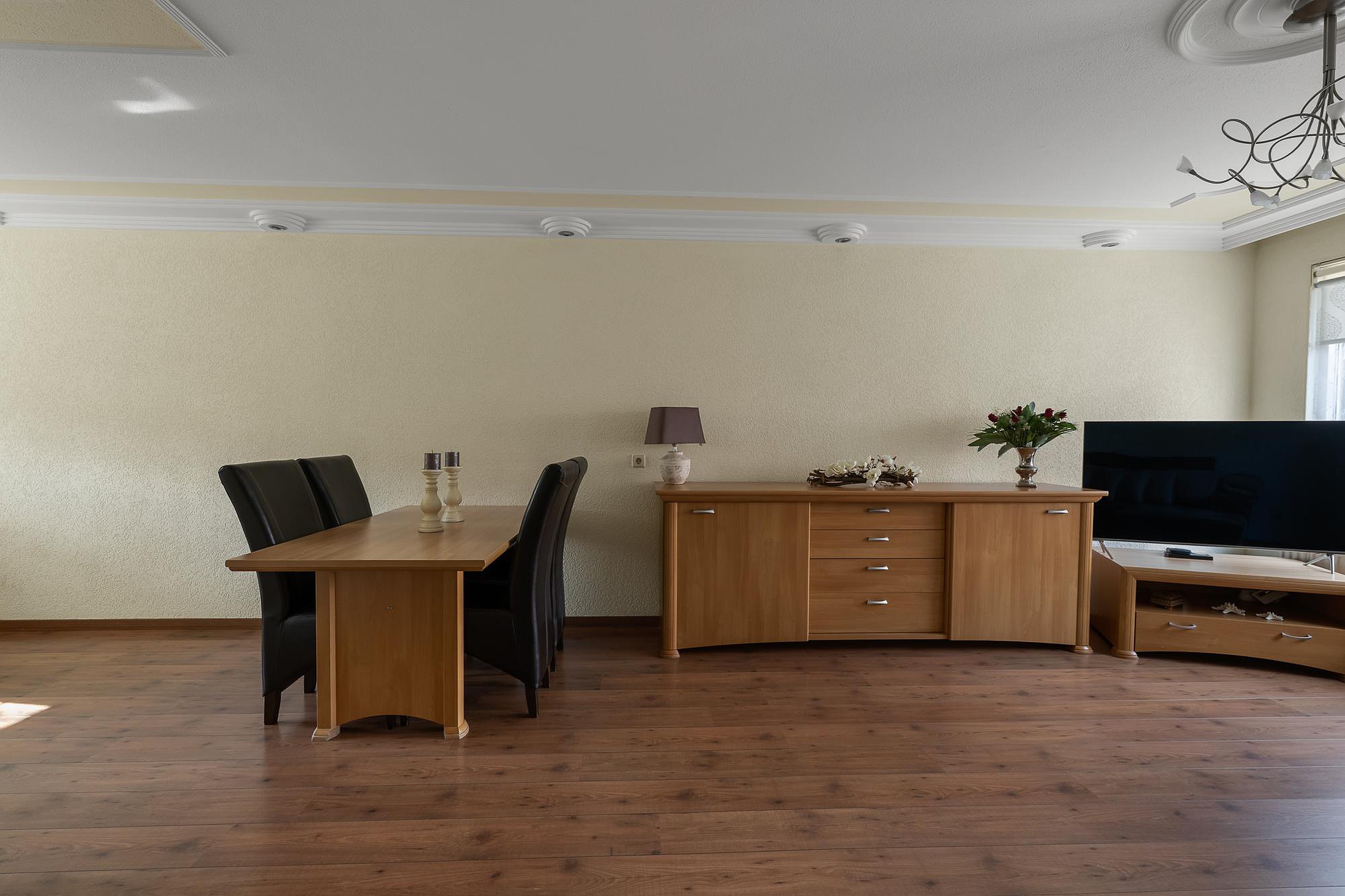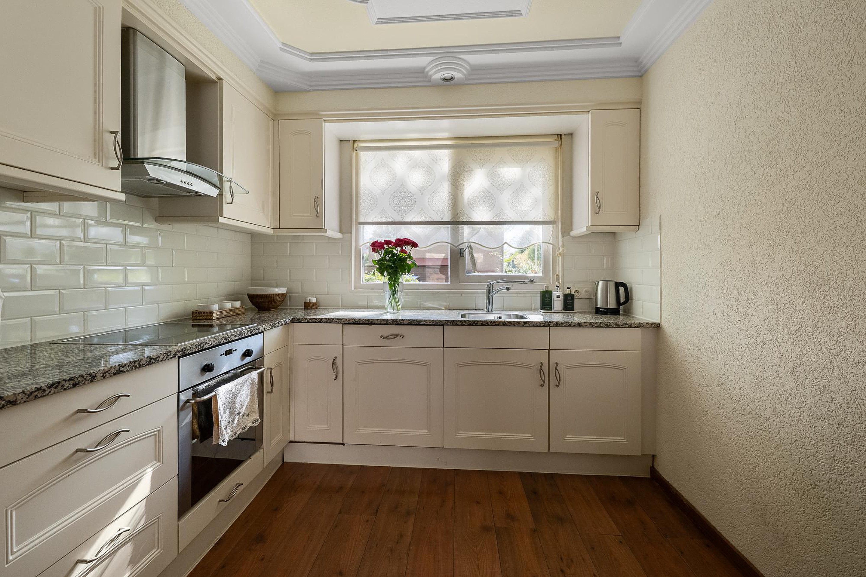 Ground floor: Through the front garden to the front door, you enter the hall, which has a light tiled floor and plasterwork on the long wall. On the right side are the meter cupboard, the toilet with a small sink, and the stairs to the first floor. The garden-facing living room has a laminate floor, a large window, and a door on the sunny northwest side. Under the stairs is a handy storage cupboard. The open kitchen is arranged in a corner layout on the street side and was installed around 2005, with a granite-colored countertop and various built-in appliances: an induction hob, extractor hood, oven, fridge with freezer, and dishwasher.
