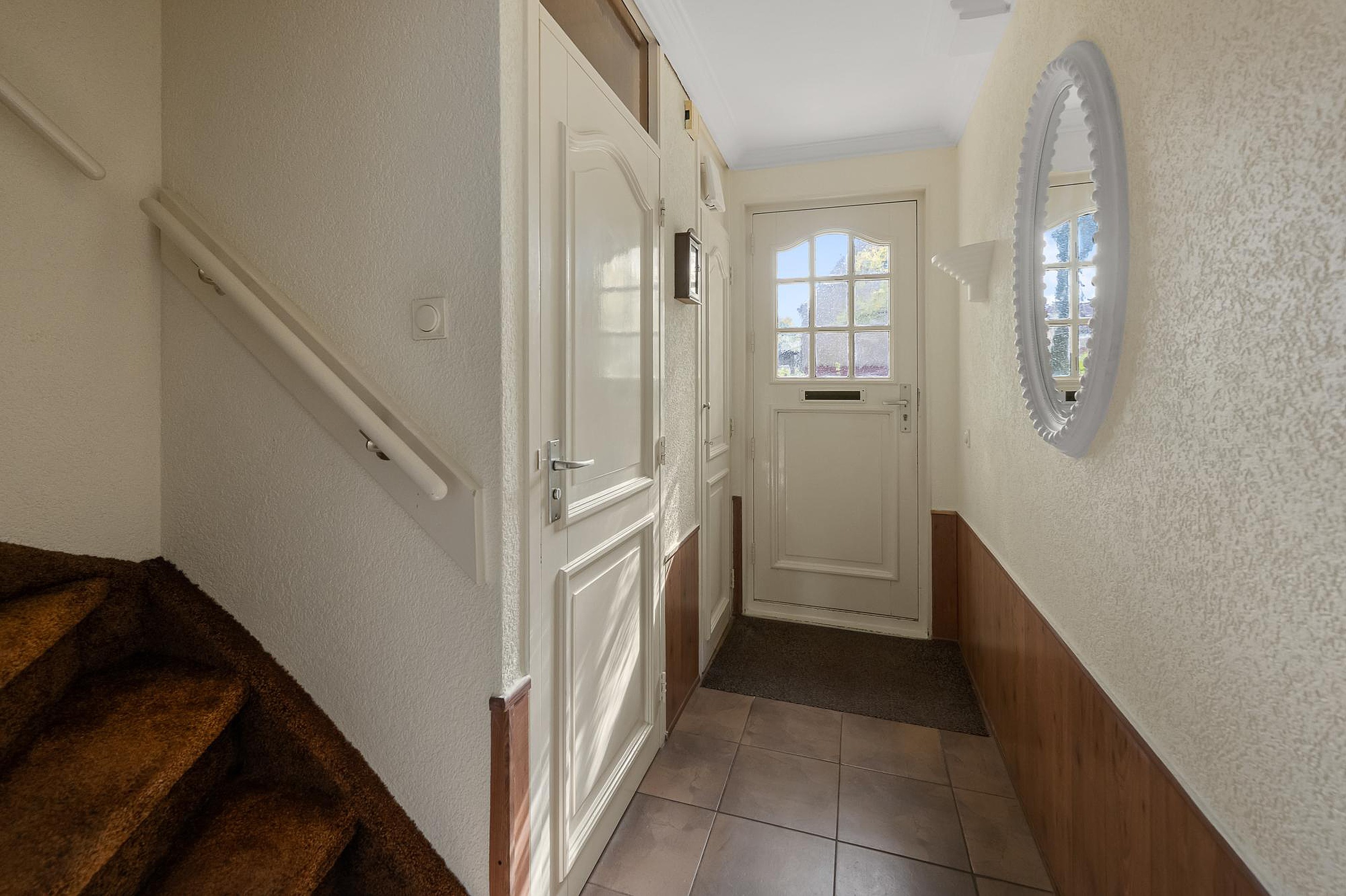 Via de voortuin naar de voordeur loop je de hal in, met een lichte plavuizen vloer en stucwerk op de lange muur. Aan de rechterzijde zijn de meterkast, de toiletruimte met fonteintje en de trap naar de eerste verdieping.