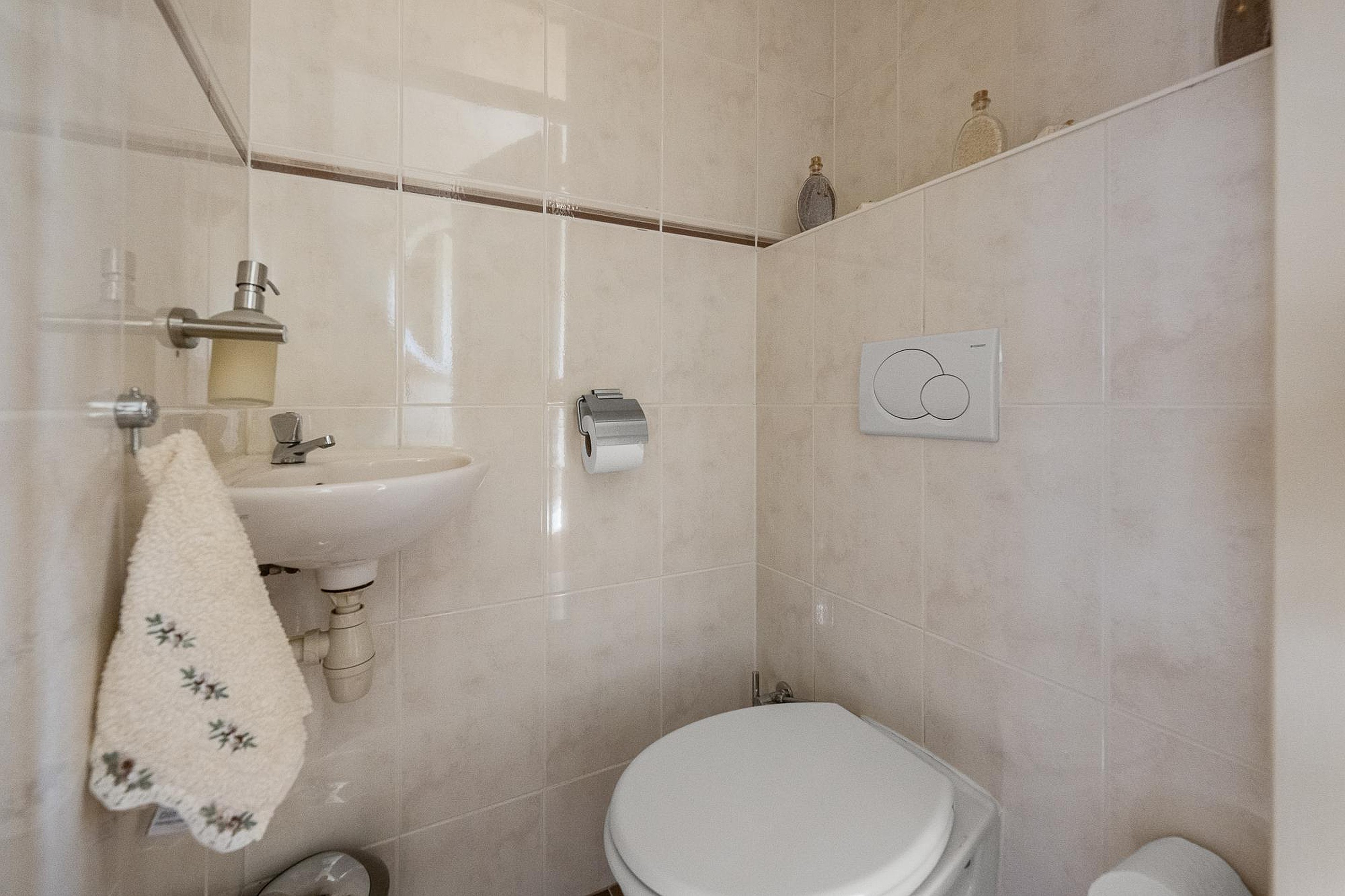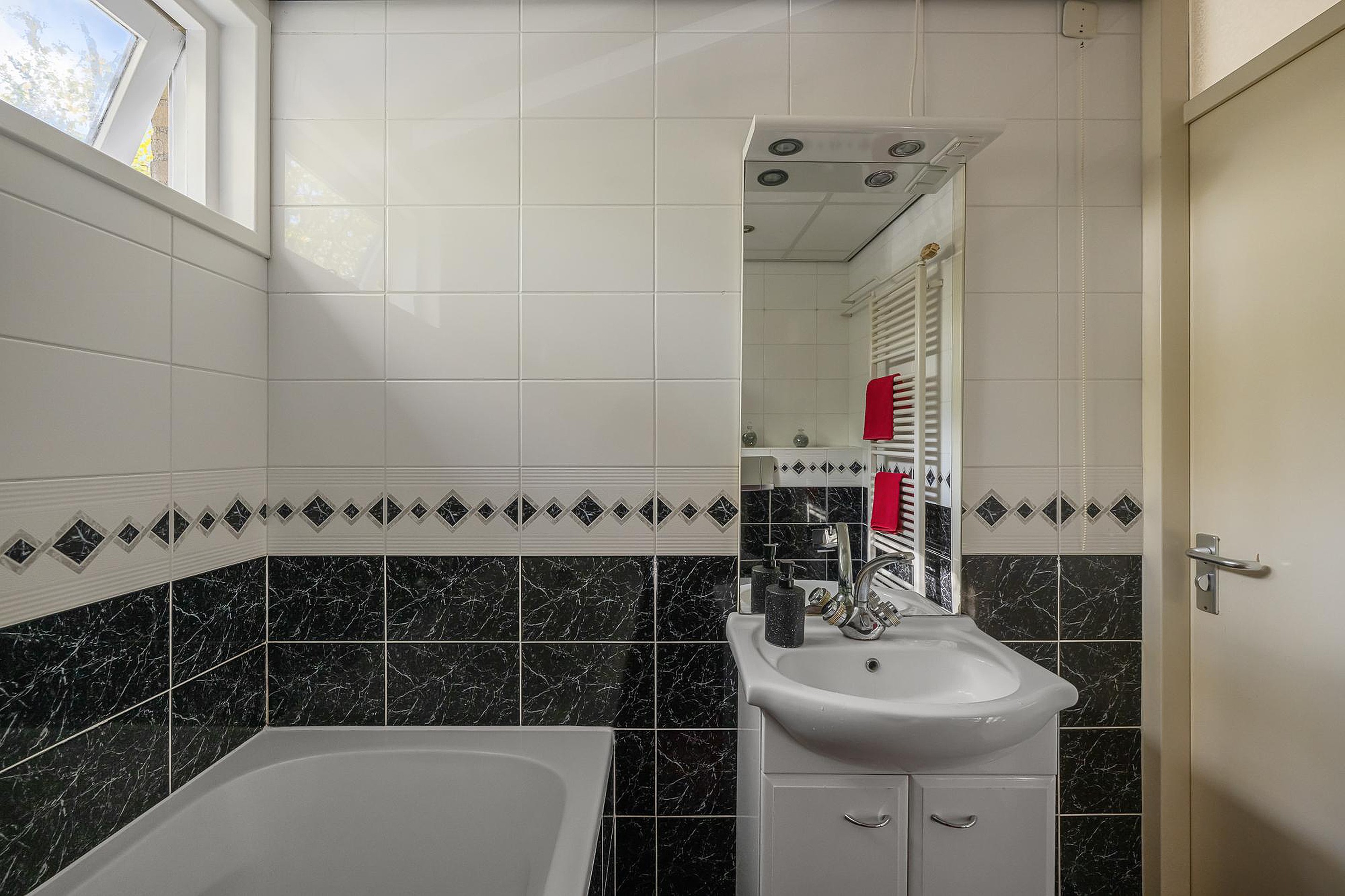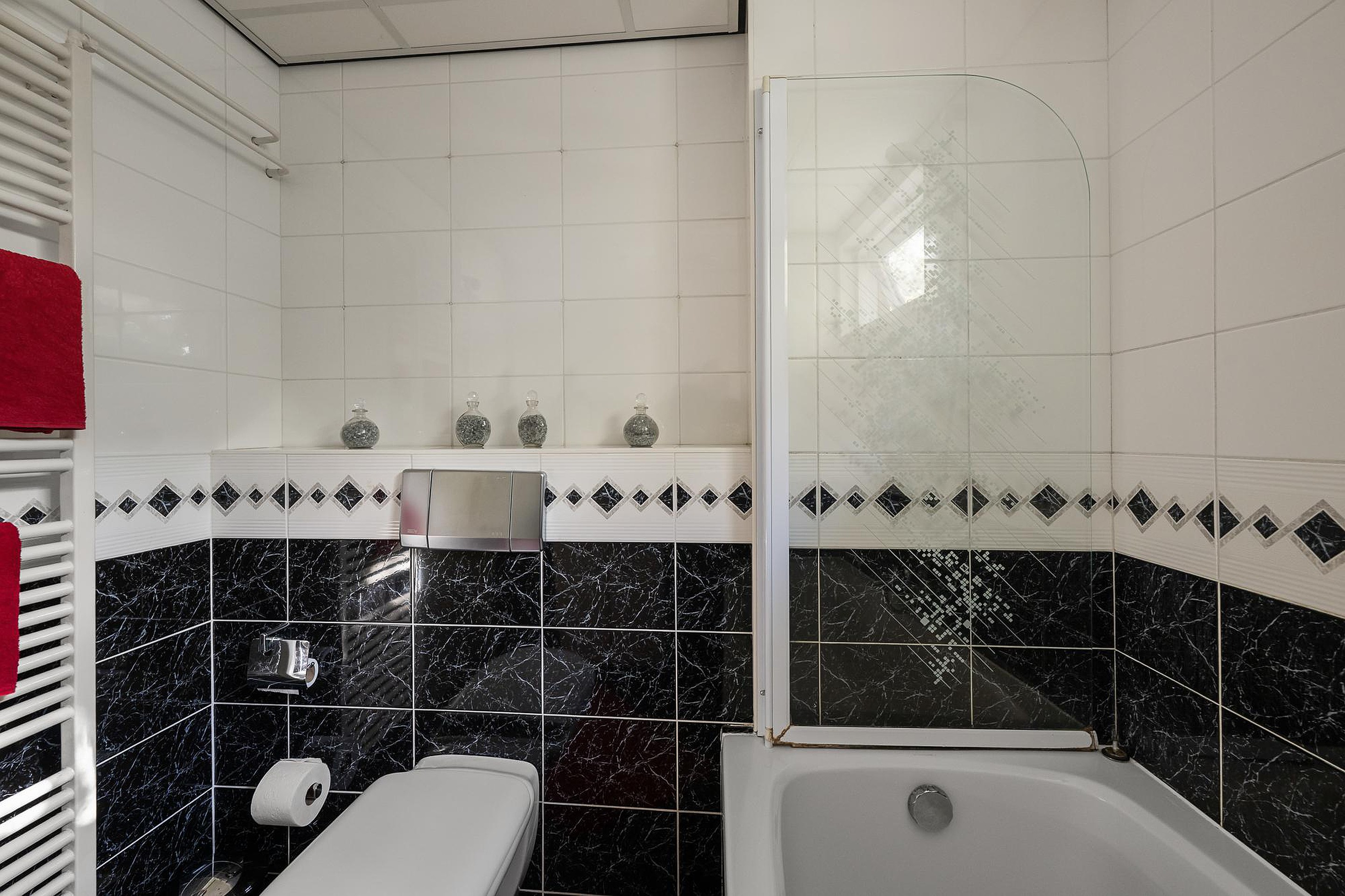 The bathroom is equipped with a bathtub, a second toilet, a towel radiator, and a vanity unit.