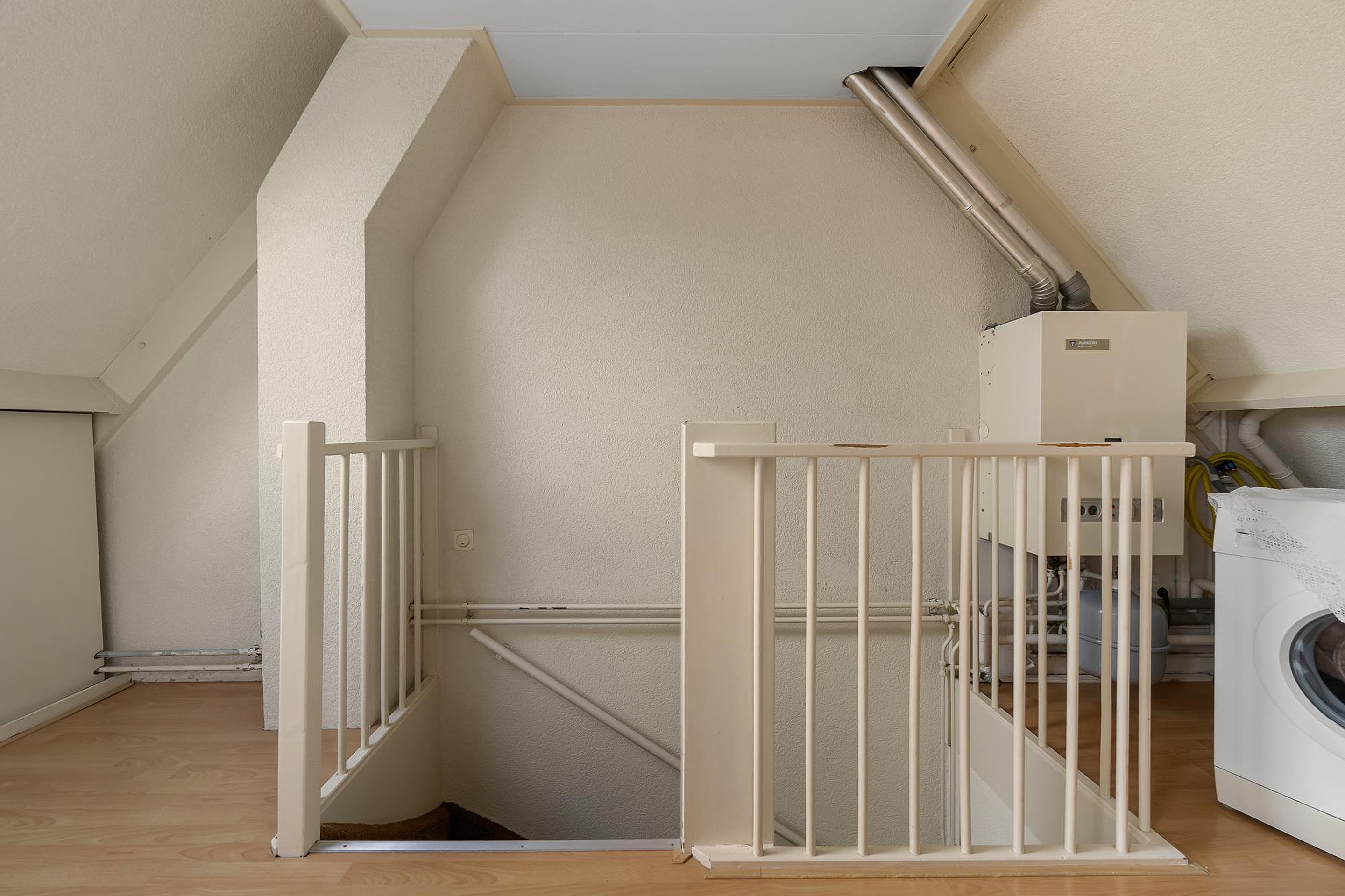 Een vaste trap geeft toegang tot de tweede verdieping, waar de vierde (slaap) kamer is.