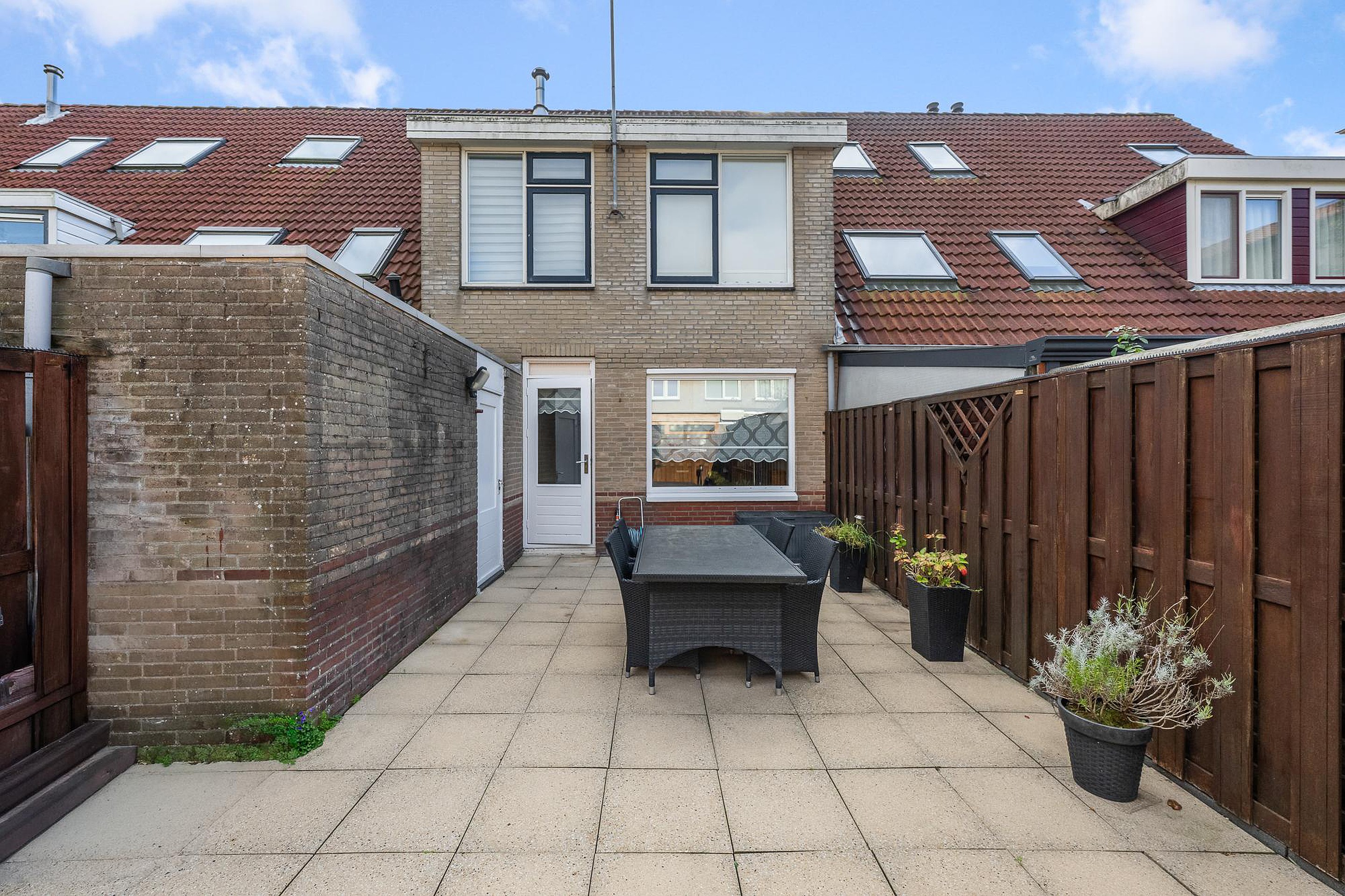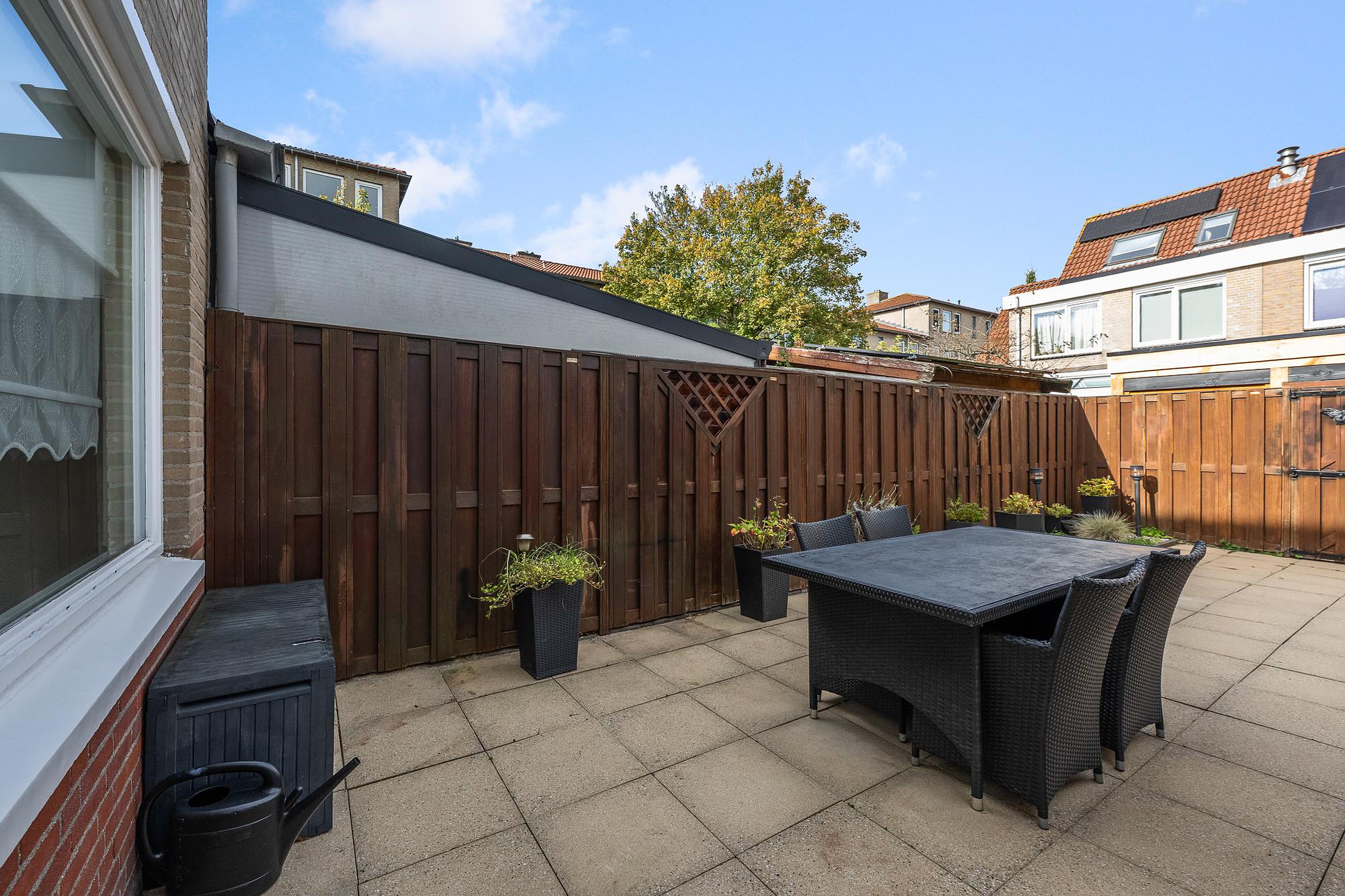 When the weather is nice, you can enjoy sitting outside. The garden, approximately 10 meters deep, is situated on the northwest and mostly paved. A shed can be placed in the corner of the garden as there is a gate to the alley.