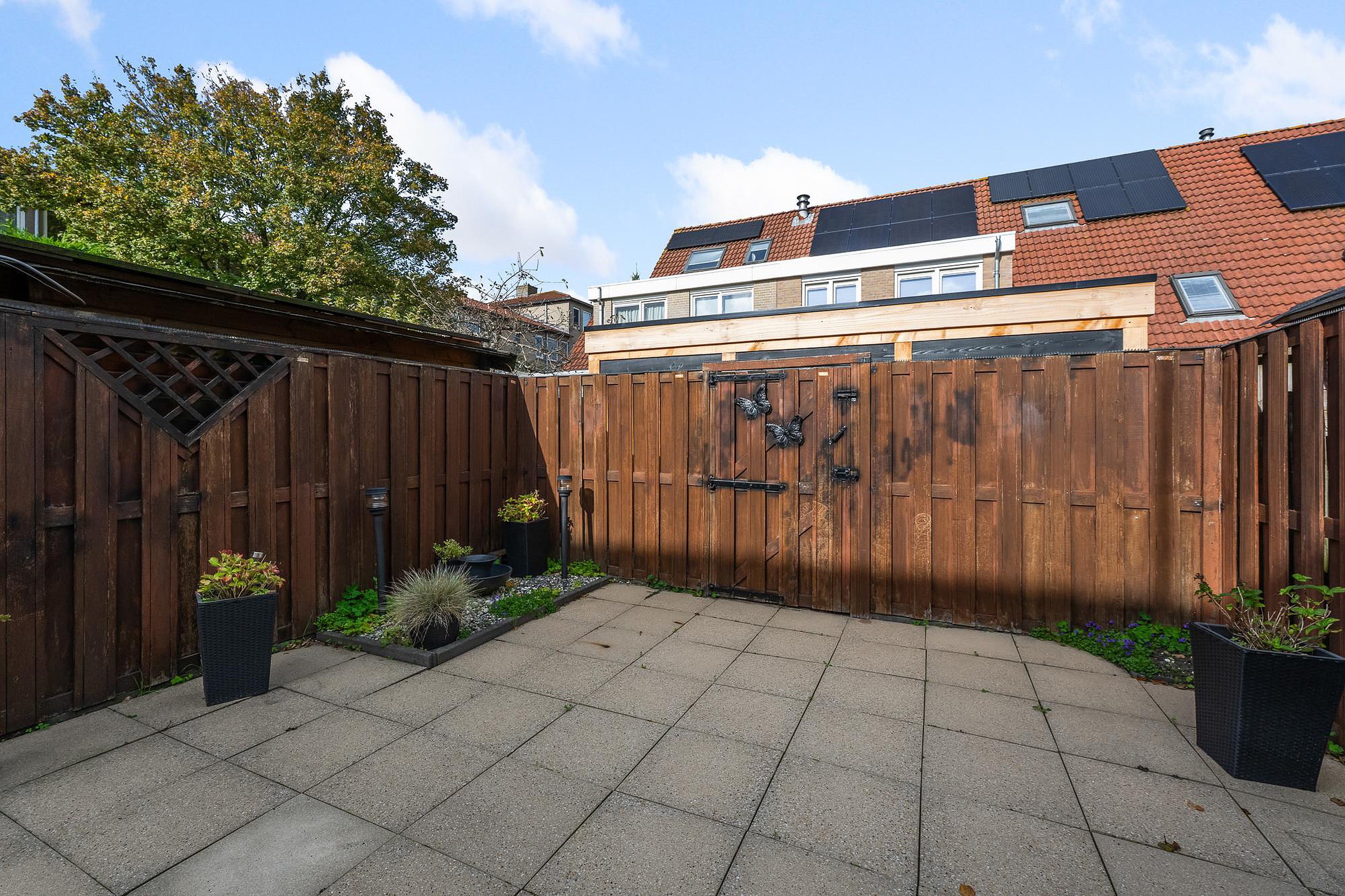 In de hoek van de tuin kan een berging geplaatst worden aangezien er een poort is naar de steeg.