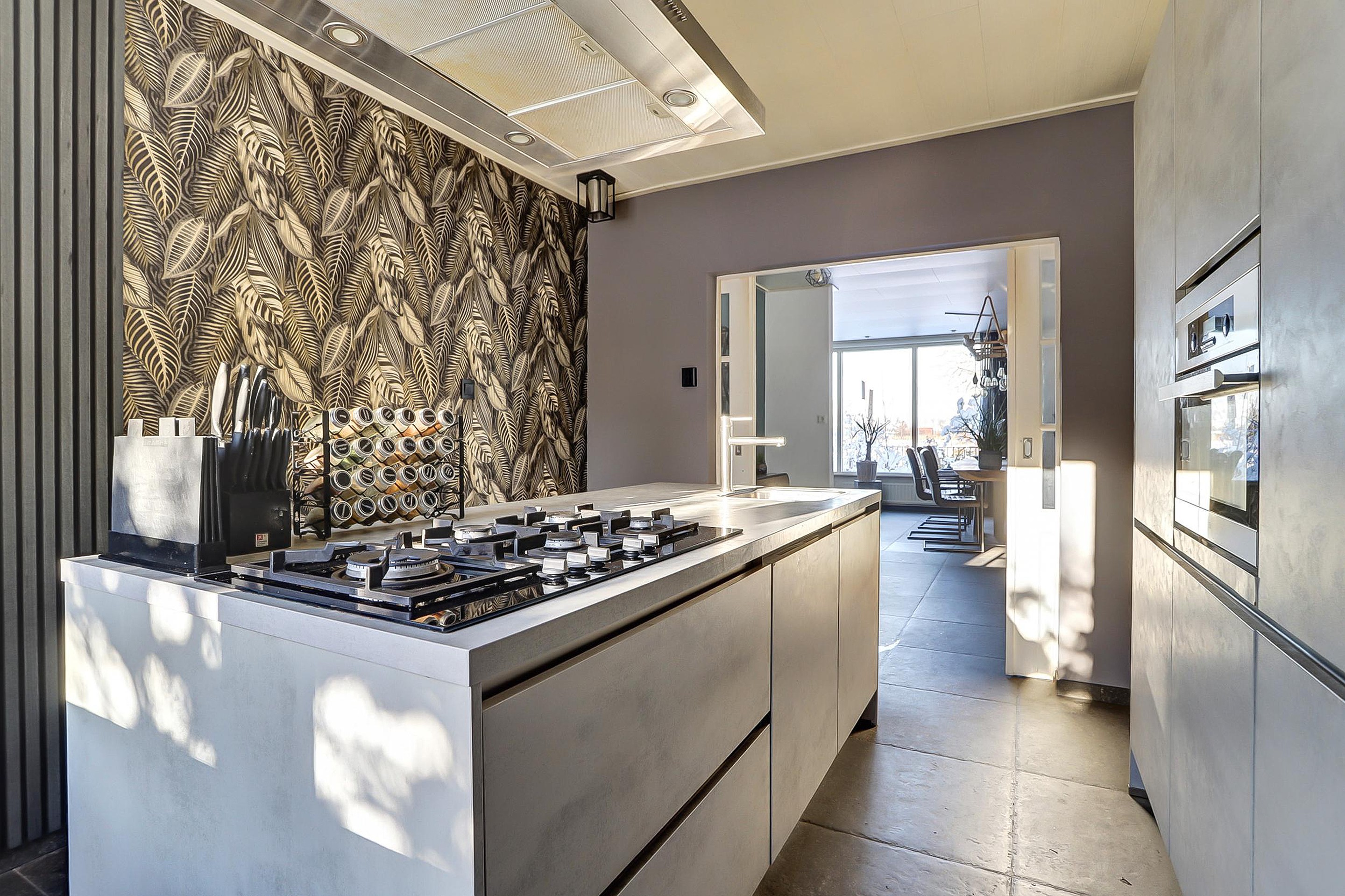 De keuken is modern en strak uitgevoerd en voorzien van een kookeiland. De