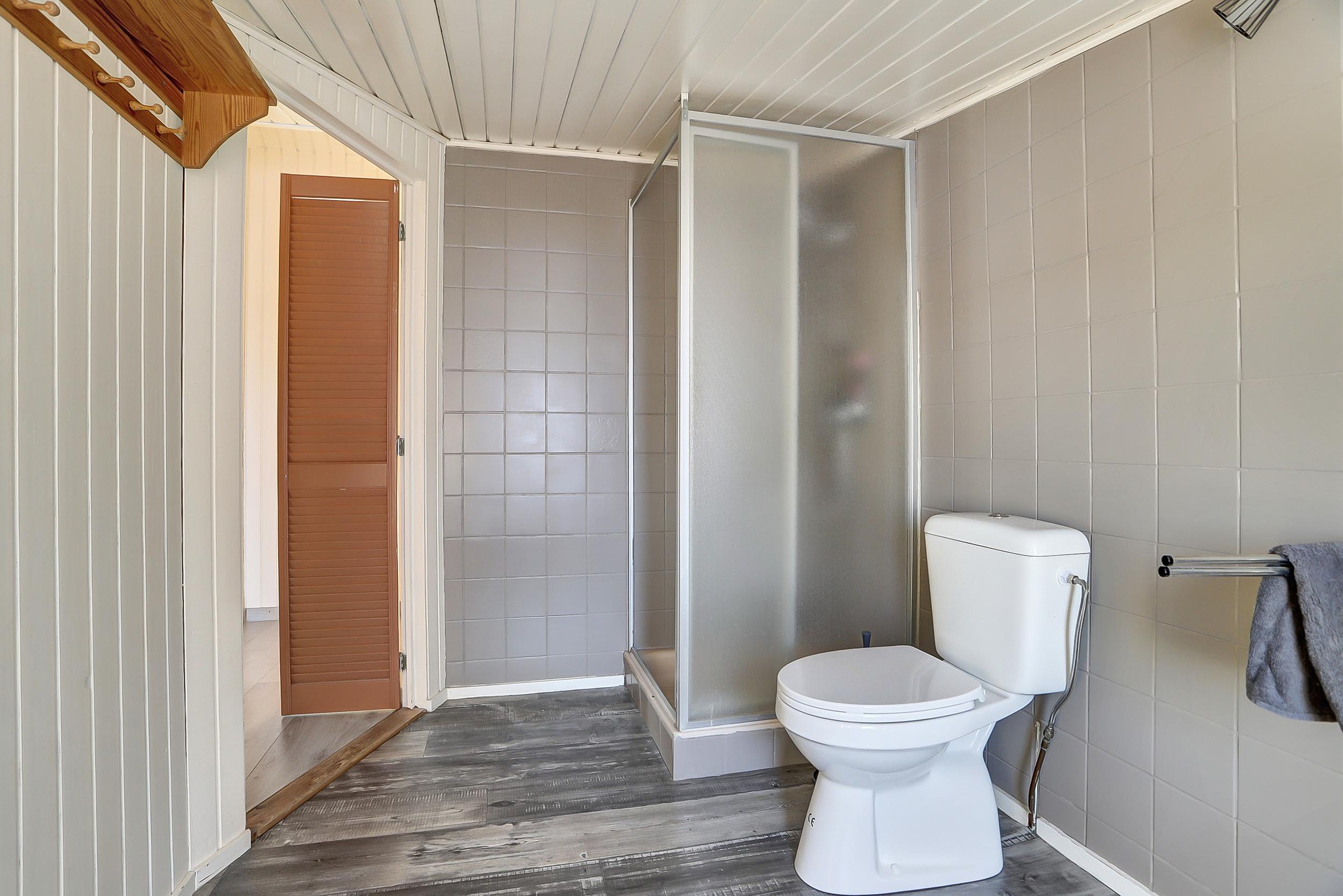 De badkamer op deze verdieping is praktisch ingericht met een douche, toilet en