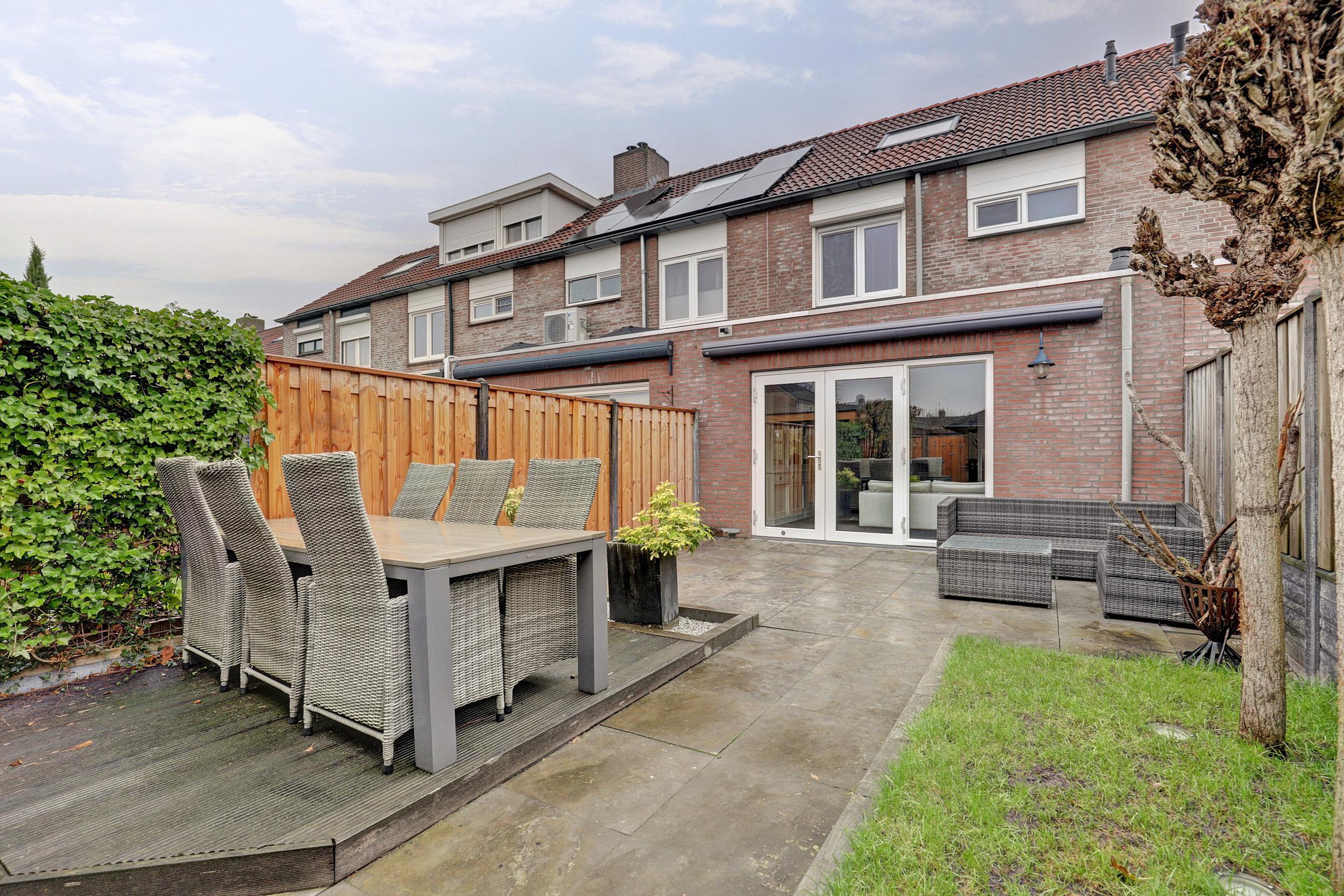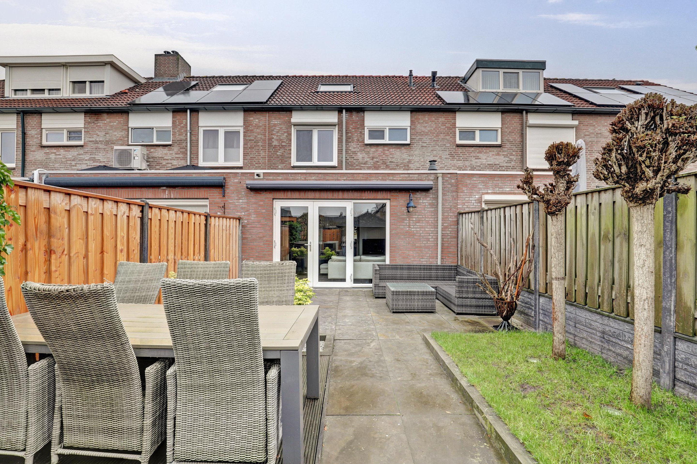 De onderhoudsvriendelijke achtertuin is een heerlijke plek om buiten te ontspannen en vormt een natuurlijke verlenging van de leefruimte.