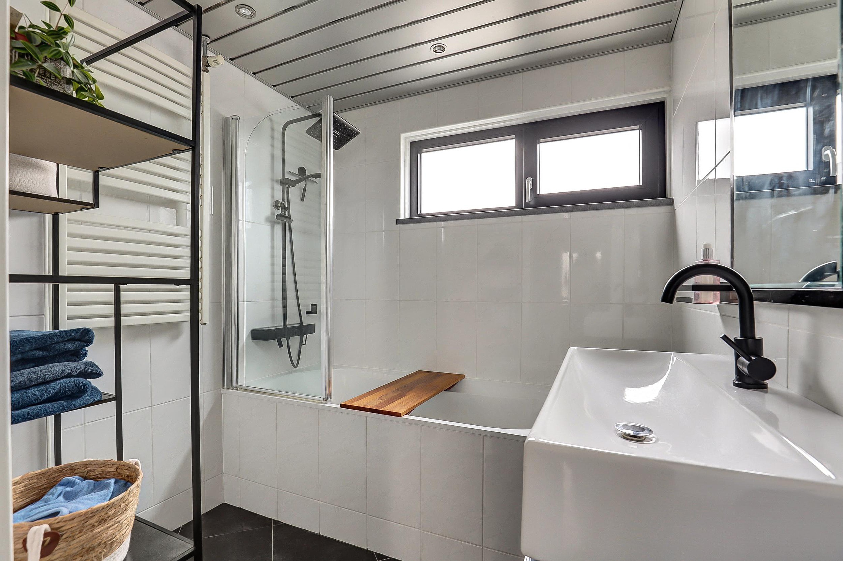 De moderne badkamer is stijlvol afgewerkt en beschikt over een comfortabel ligbad met douchefunctie en een luxe wastafelmeubel. Hier geniet je van optimaal gemak en een moment voor jezelf.