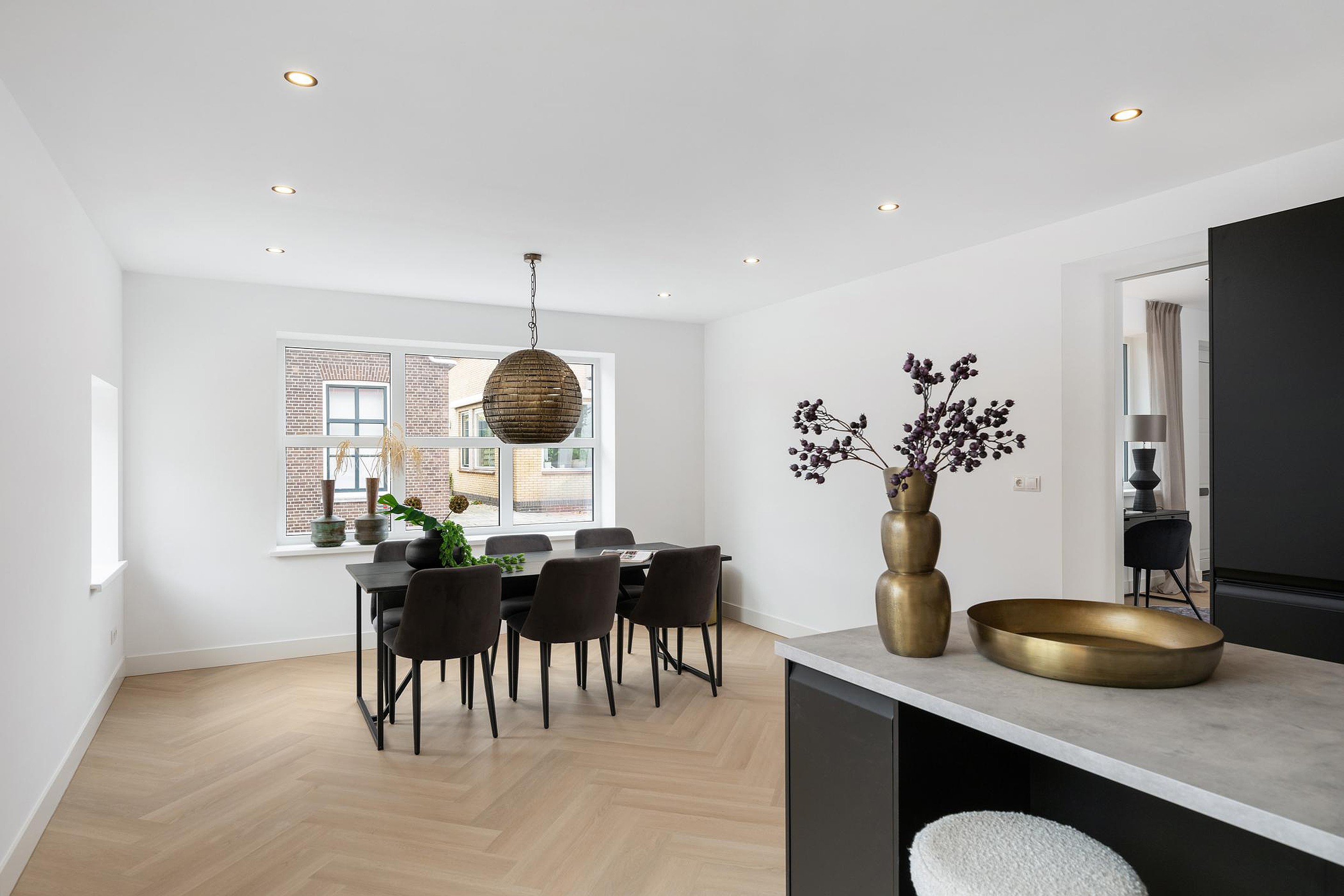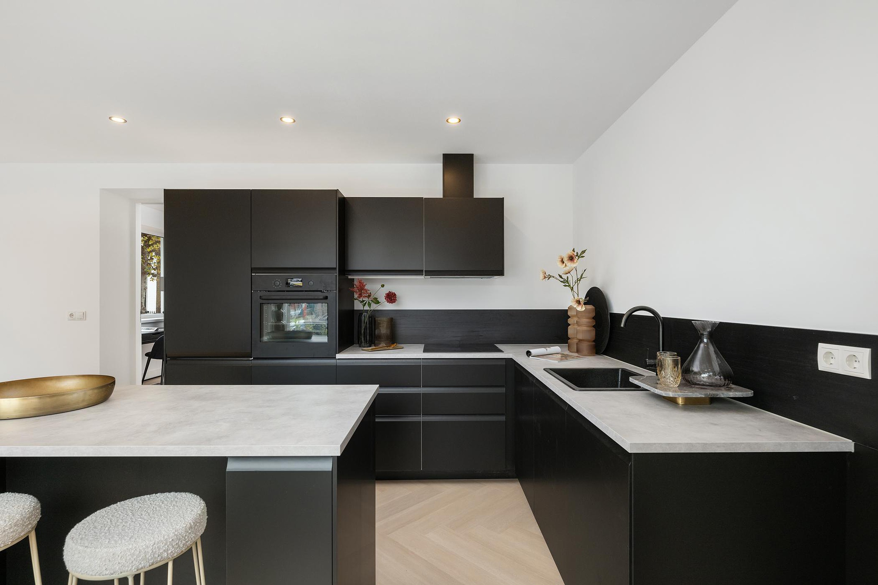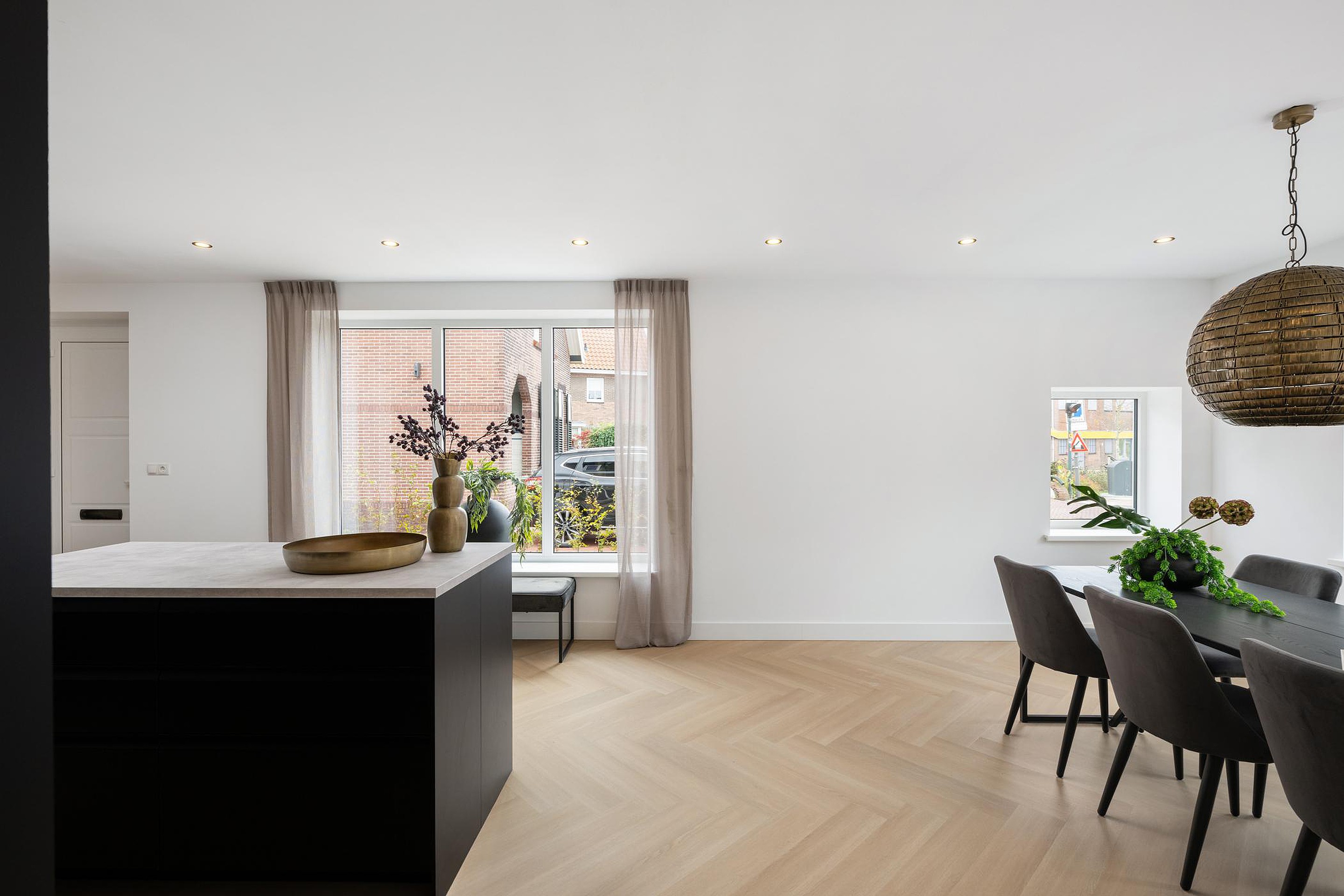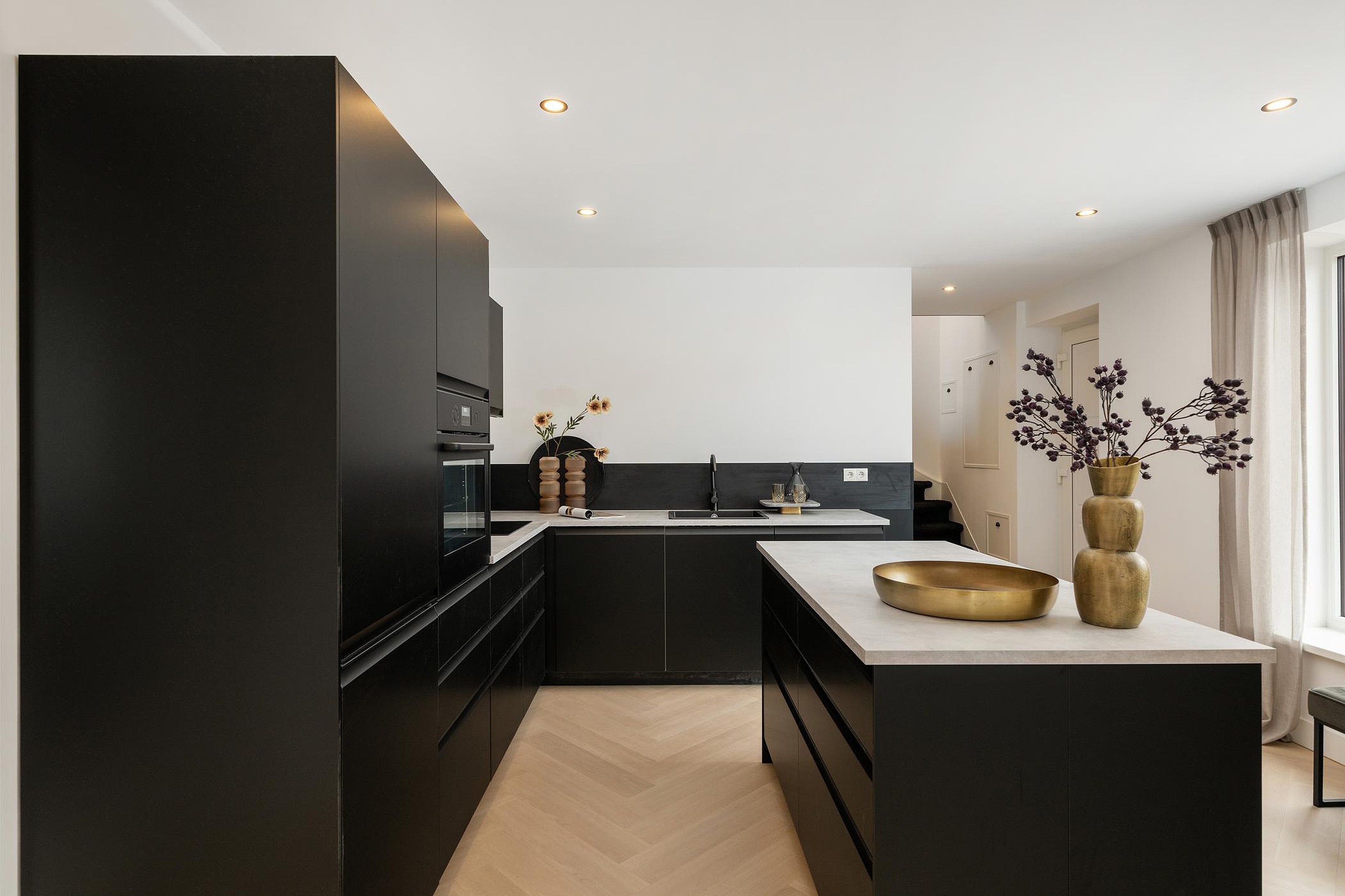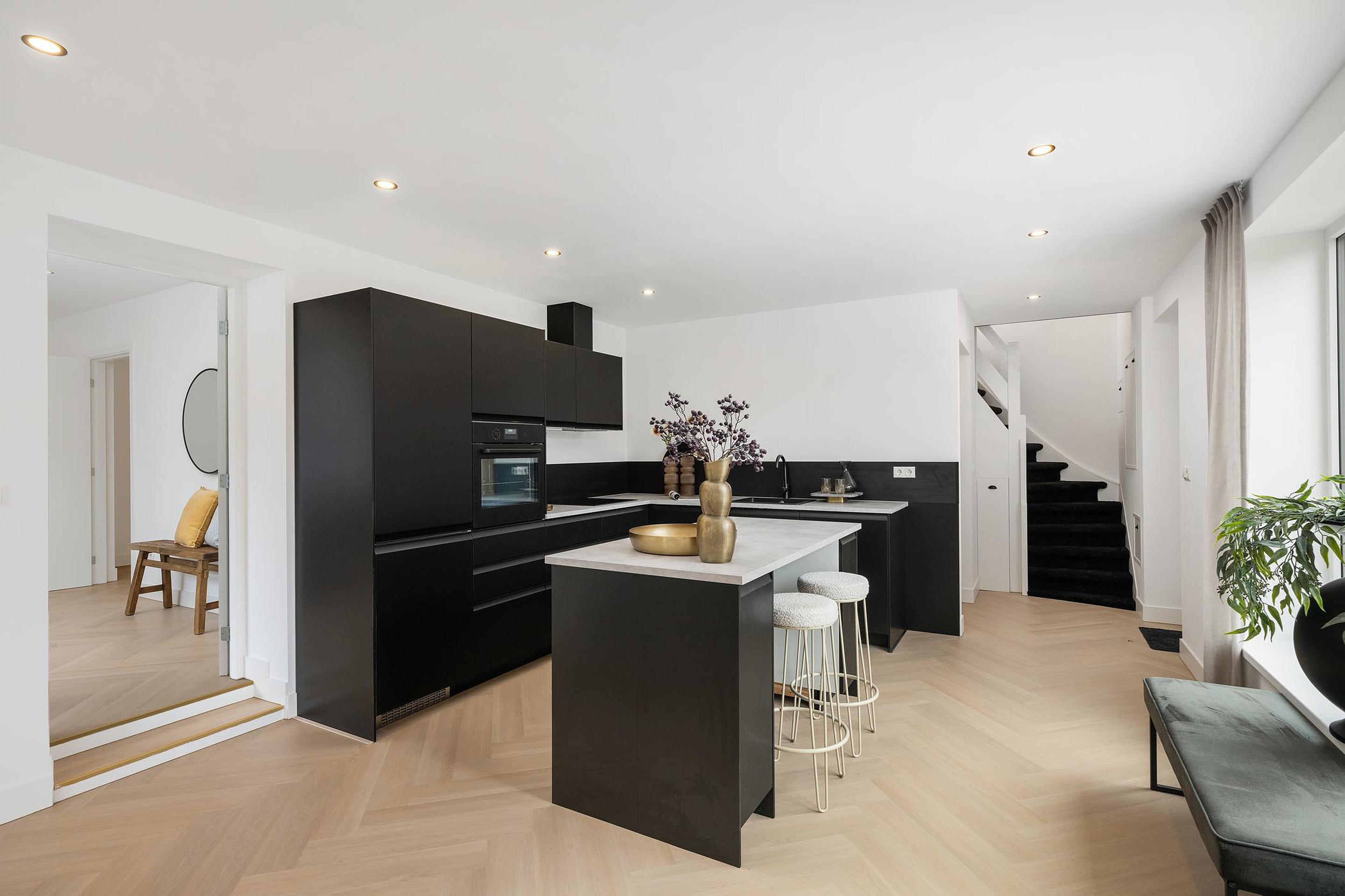Begane grond Bij binnenkomst komt u direct in de sfeervolle woonkeuken: het hart van het huis. Hier is gekozen voor een moderne zwarte keuken met alle gewenste inbouwapparatuur, waaronder een oven, koel-vriescombinatie, vaatwasser, inductie kookplaat en afzuigkap. De ruimte voelt licht en uitnodigend aan door de vele raampartijen, perfect om samen te koken en te tafelen.