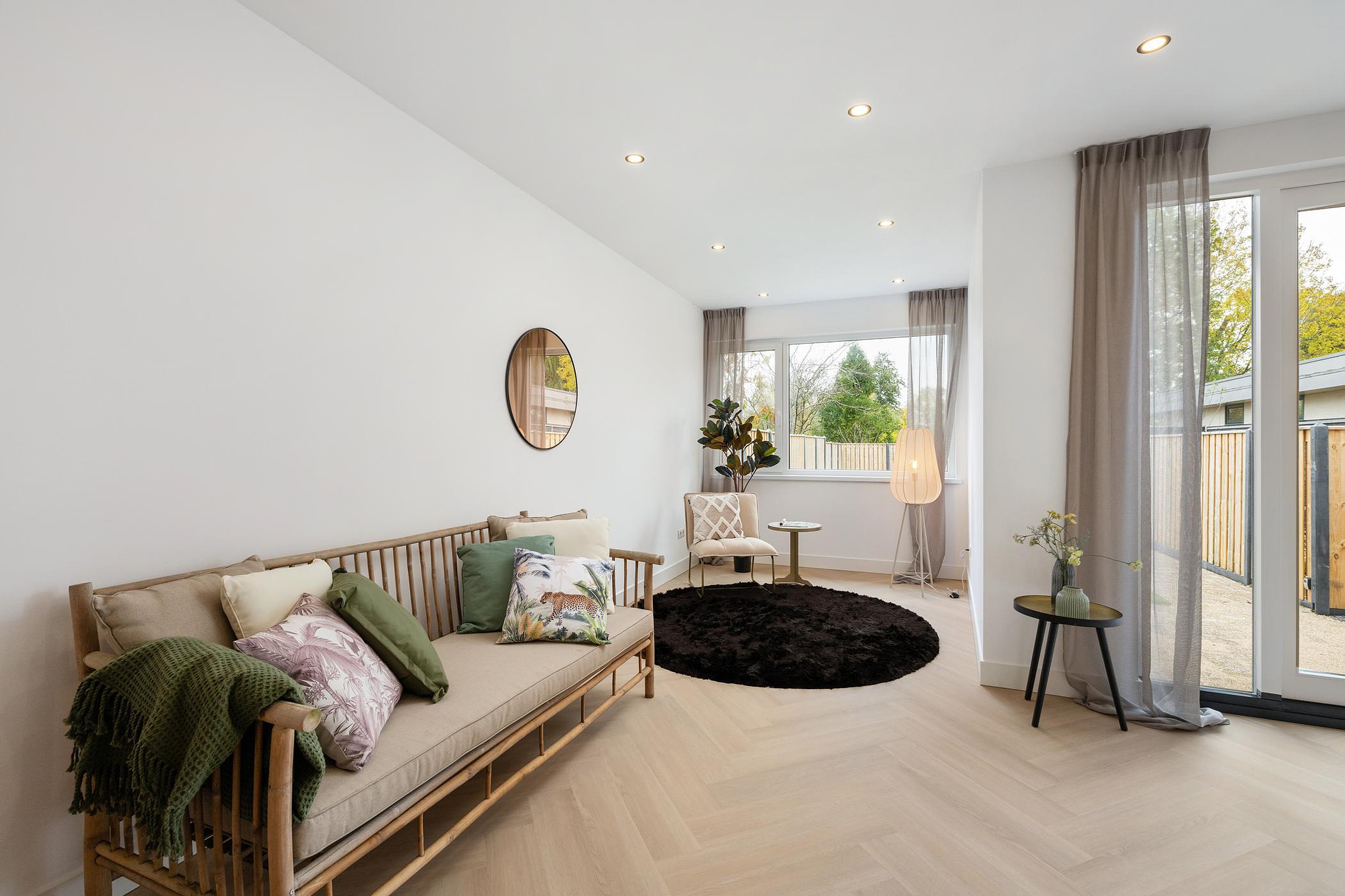 Vanuit deze ruimte loopt u door naar de royale uitgebouwde woonkamer met vrij zicht op de tuin aan het water. De grote ramen en openslaande deuren naar de tuin zorgen voor een zee aan licht. In deze ruimte bevindt zich de inpandige garage, die eenvoudig kan worden omgebouwd tot kantoor, extra kamer of hobbyruimte.