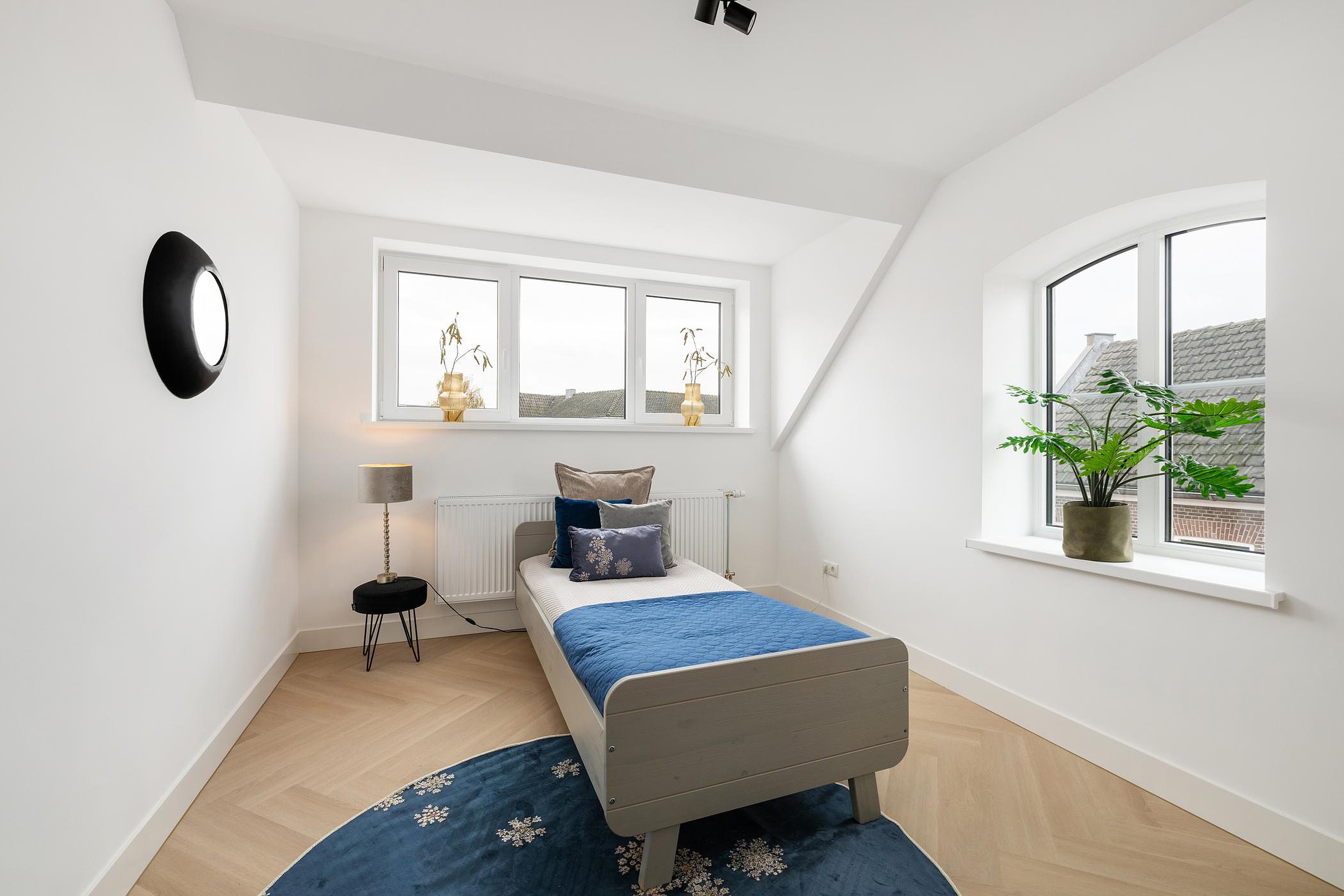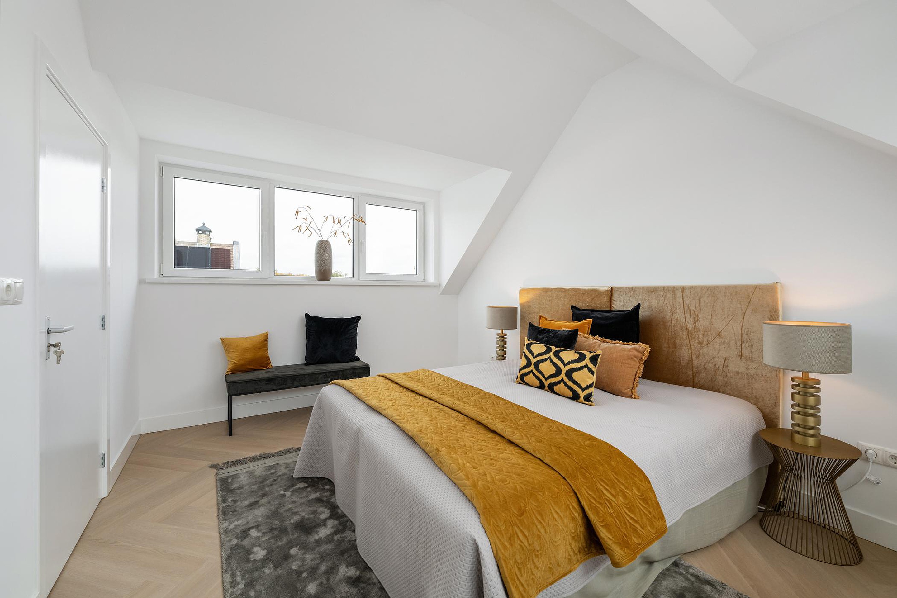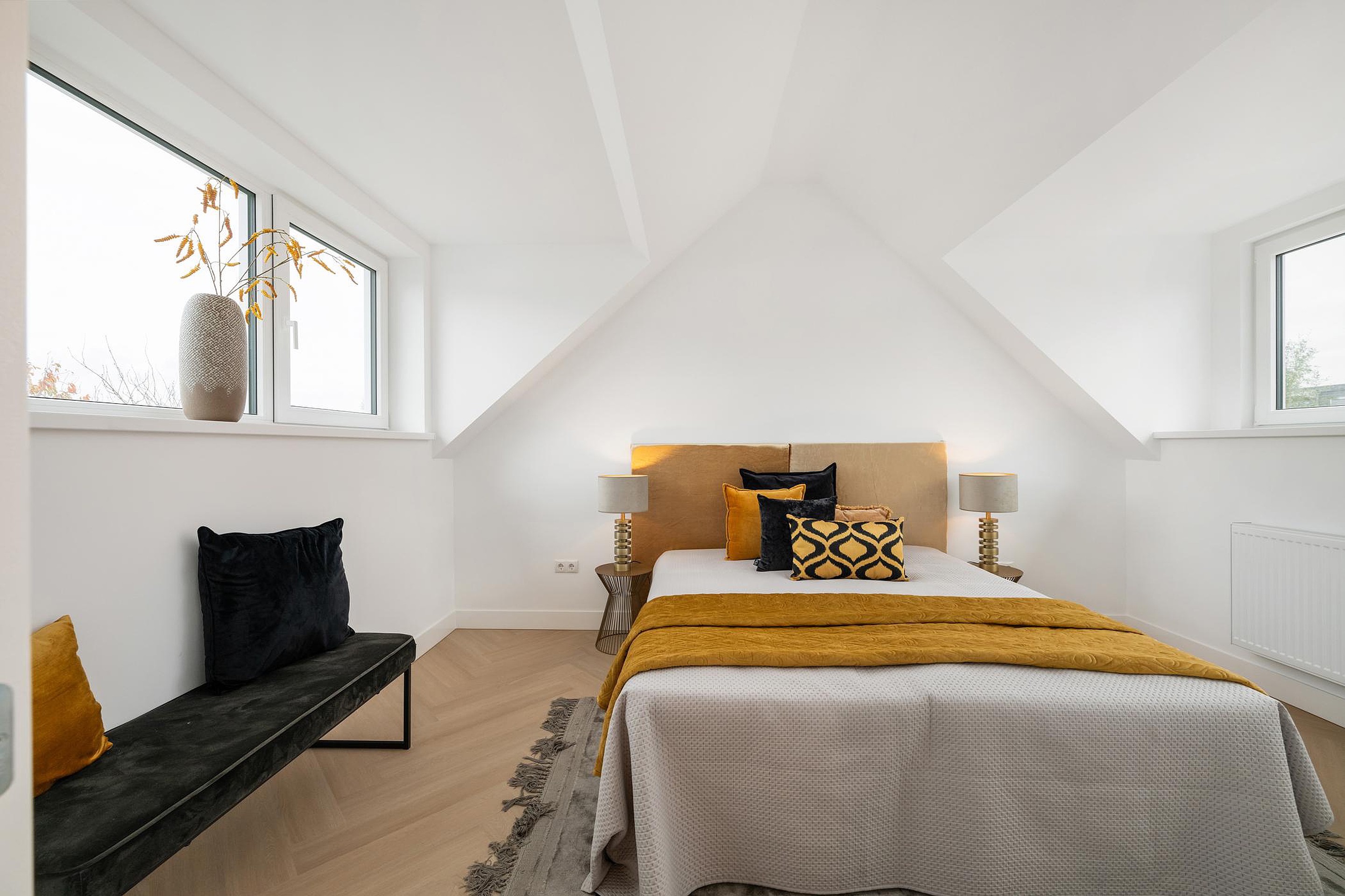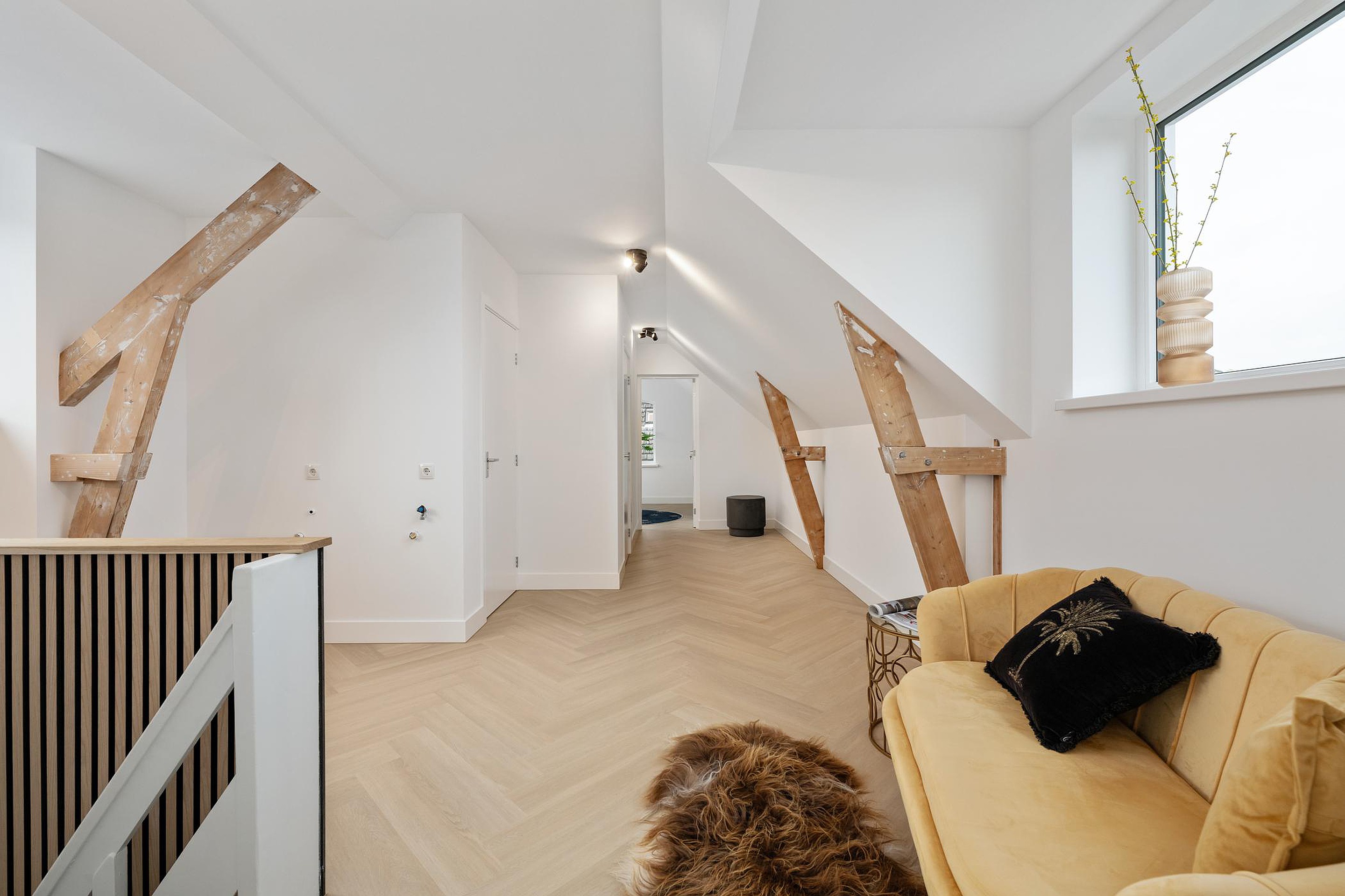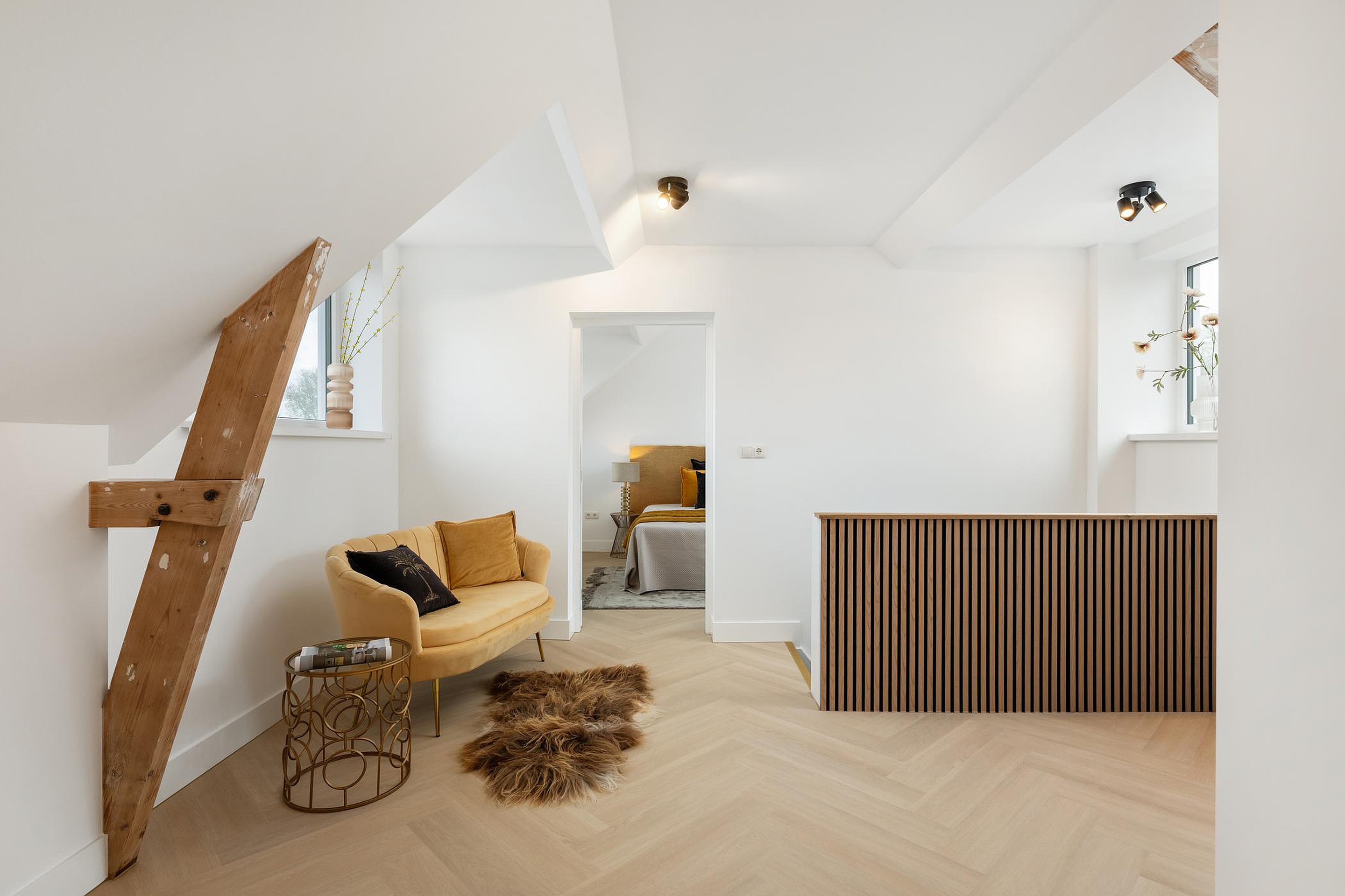 Eerste verdieping Op de eerste verdieping geven twee brede dakkapellen extra ruimte en licht aan de twee ruime slaapkamers. De kamers zijn bereikbaar via de royale overloop, voorzien van de originele houten balken en de aansluiting voor de wasmachine. De luxe badkamer heeft een inloopdouche en wasmeubel met dubbele kraan en heeft ook een tweede aansluiting voor de wasmachine. Daarnaast is er een separaat toilet aanwezig. Ook de verdieping heeft een strakke afwerking door de PVC vloer en afgewerkte wanden.