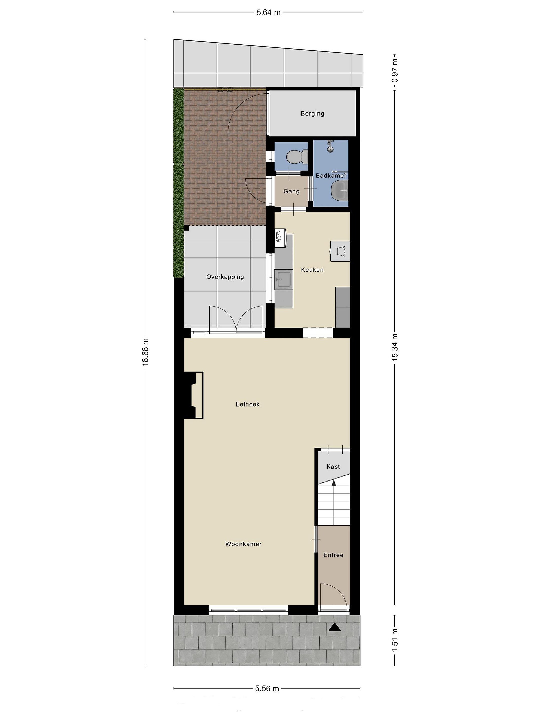 Via de authentieke voordeur betreedt u de hal. Vanuit deze hal heeft u toegang tot de woonkamer en middels de een trap tot de 1ste verdieping. Onder de trap is een trapkast gesitueerd welke vanuit de woonkamer bereikbaar is. De woonkamer is voorzien van een lambrisering, een houten vloer, een openhaard en openslaande deuren naar de op het zuid-westen gelegen achtertuin. Vanuit de woonkamer heeft u toegang tot eenvoudige keuken. Aansluitend aan de keuken treft u een kleine tussenhal met achterdeur naar de tuin en toegang tot het toilet en de badkamer. In de achtertuin, met achterom, bevindt zich een kleine berging.
