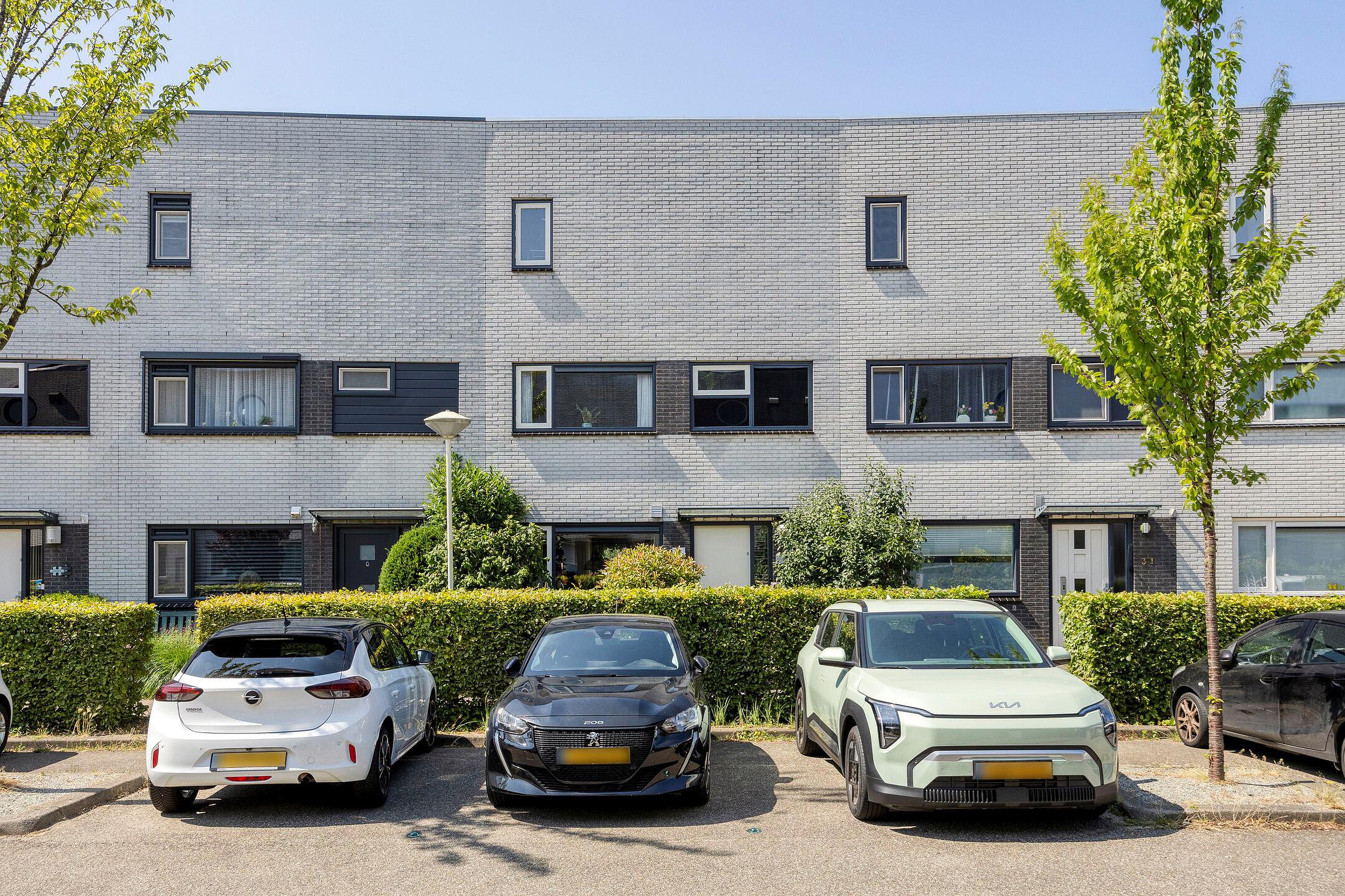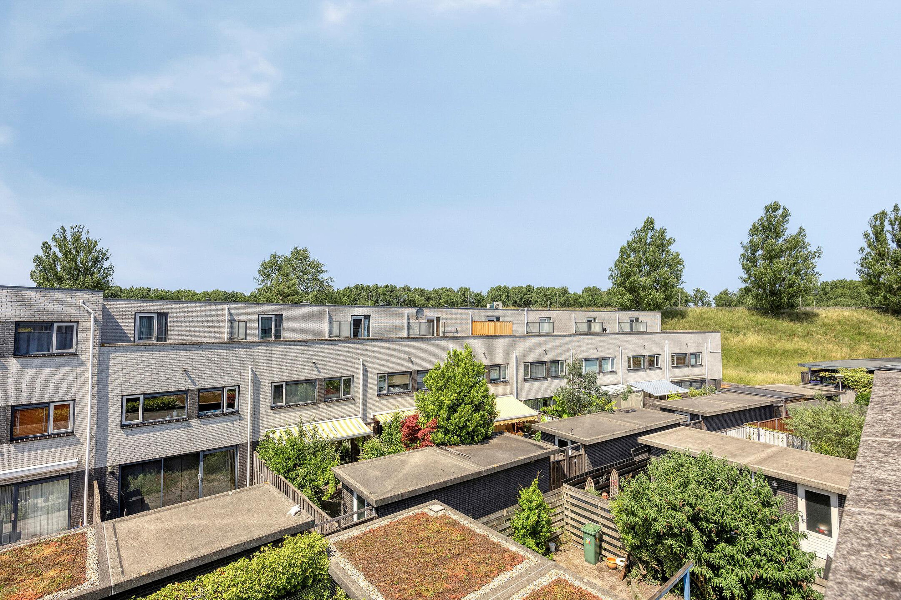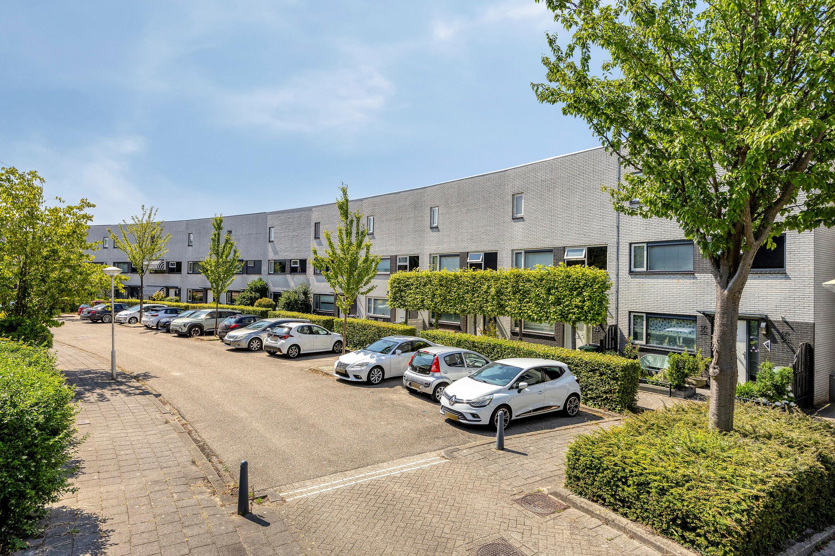Met een plat dak en zonnepanelen heeft het huis een moderne uitstraling en parkeren doe je gewoon voor de deur. Geen gedoe met zoeken dus. Je kijkt niet uit op een rij auto’s, want er staat een groene haag voor. Die geeft je ook meteen een beetje extra privacy. Ook voor de fiets is in de voortuin voldoende plek of anders achterin de berging van bijna tien vierkante meter.