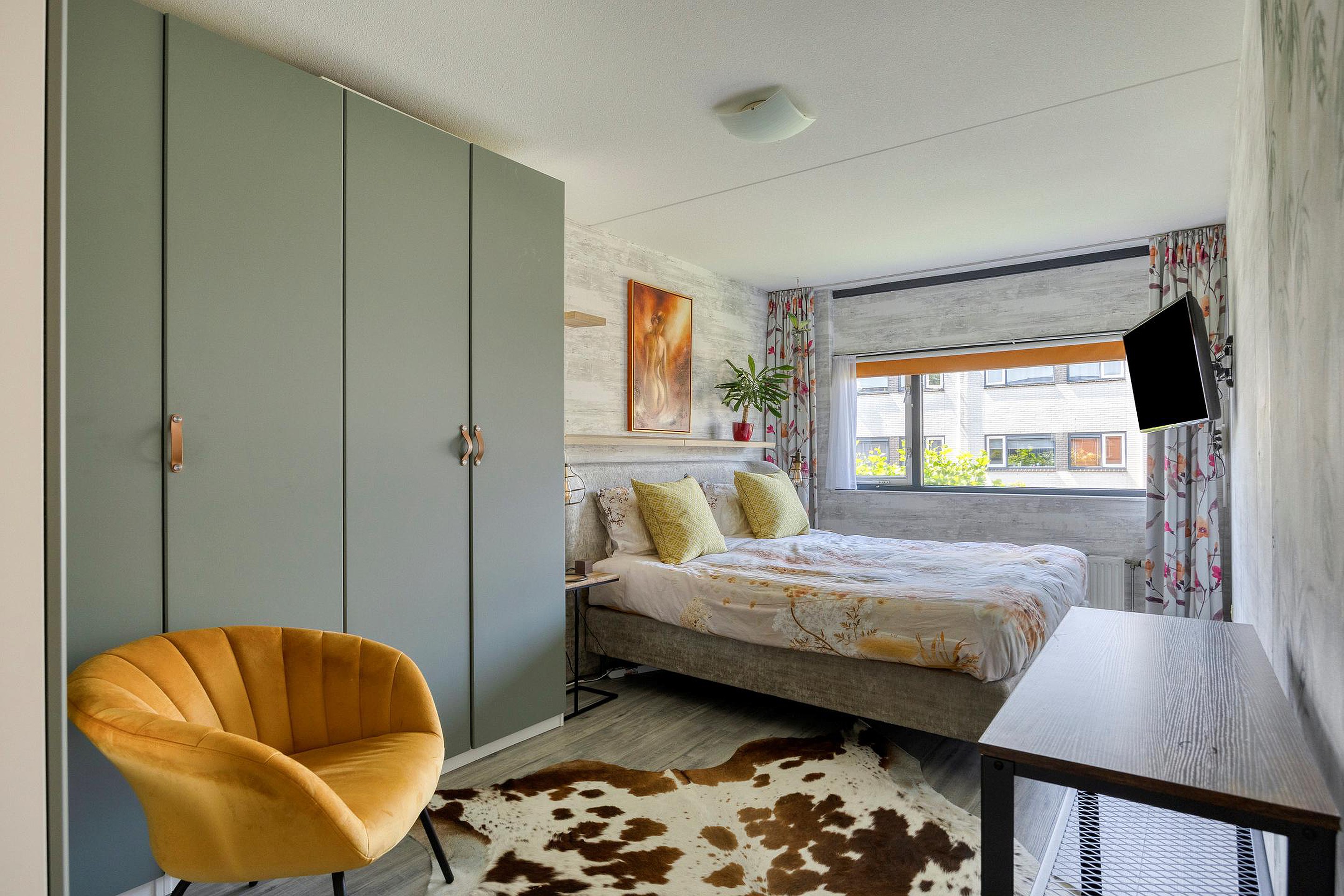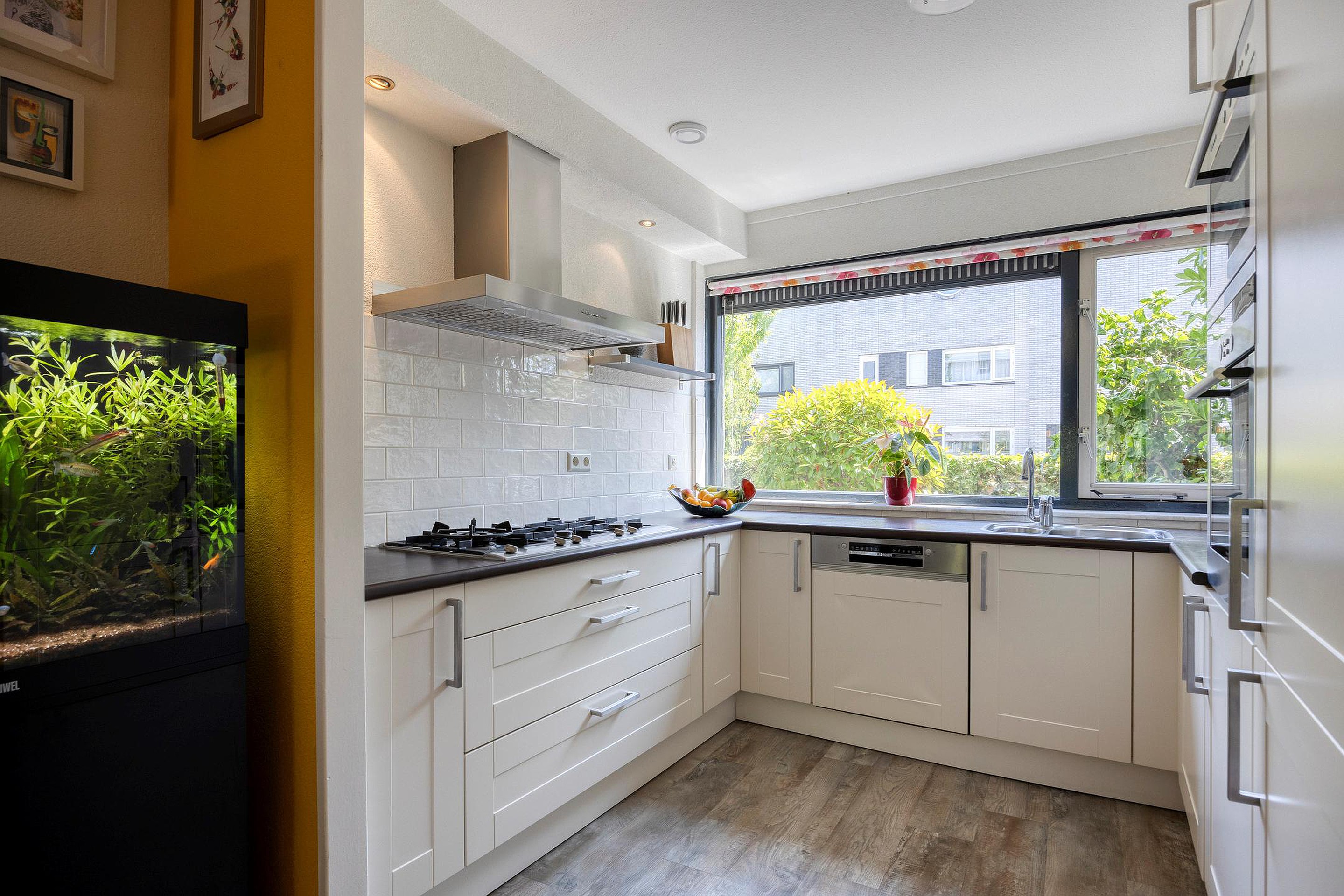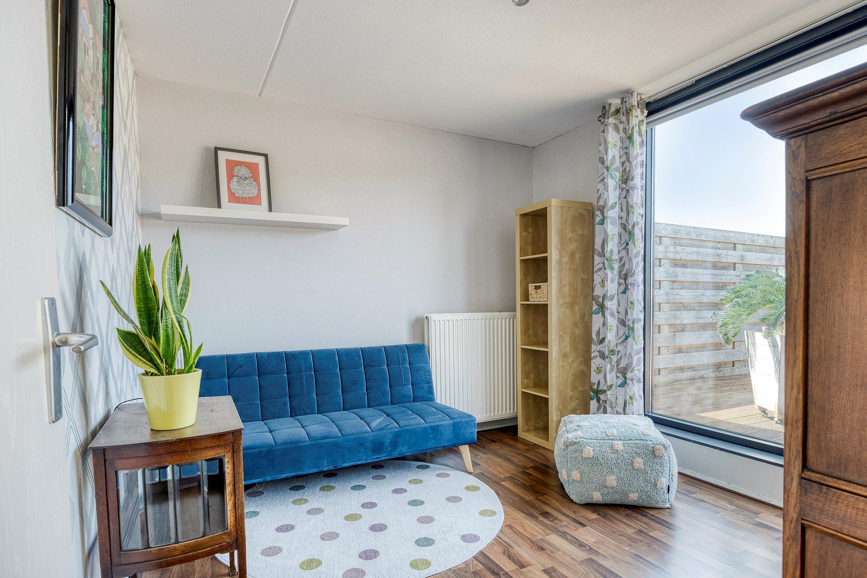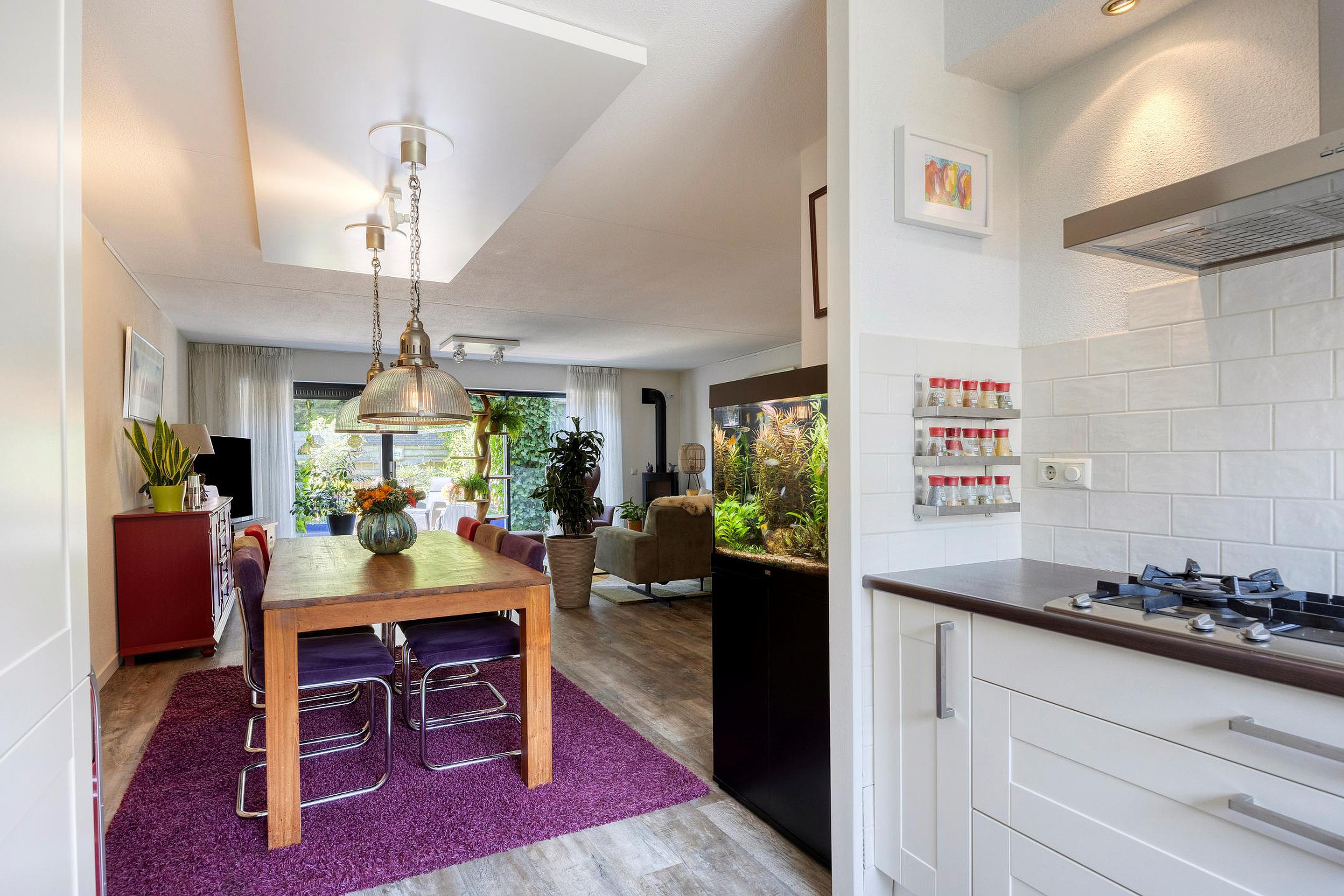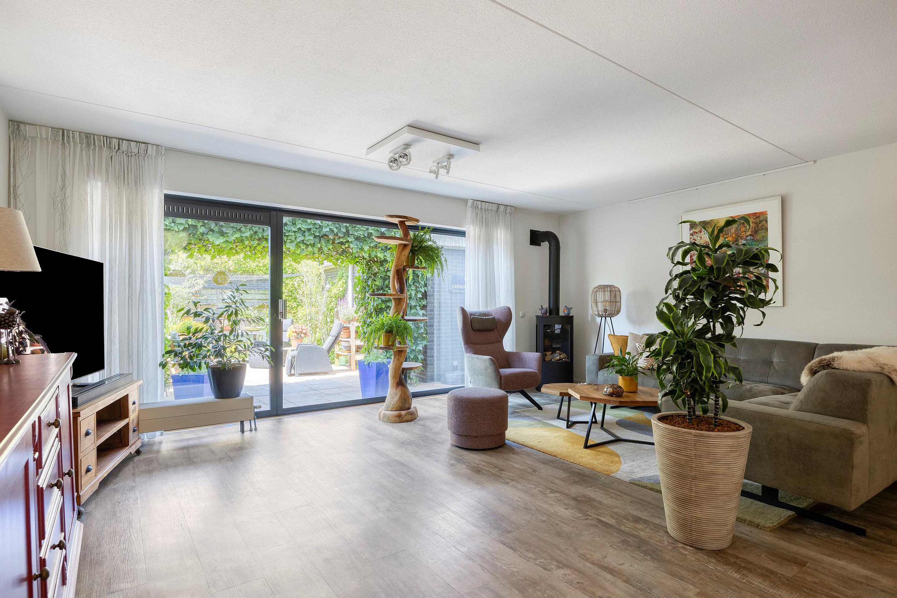 De woonkamer voelt ruim en licht. De brede ramen en schuifpui zorgen voor veel daglicht. Op koudere dagen is het hier lekker warm bij de extra geplaatste gashaard. Als het zonnetje schijnt, schuif je de deuren open en sta je meteen buiten in de tuin. Kortom, zonnig, groen en toch gewoon in de stad.