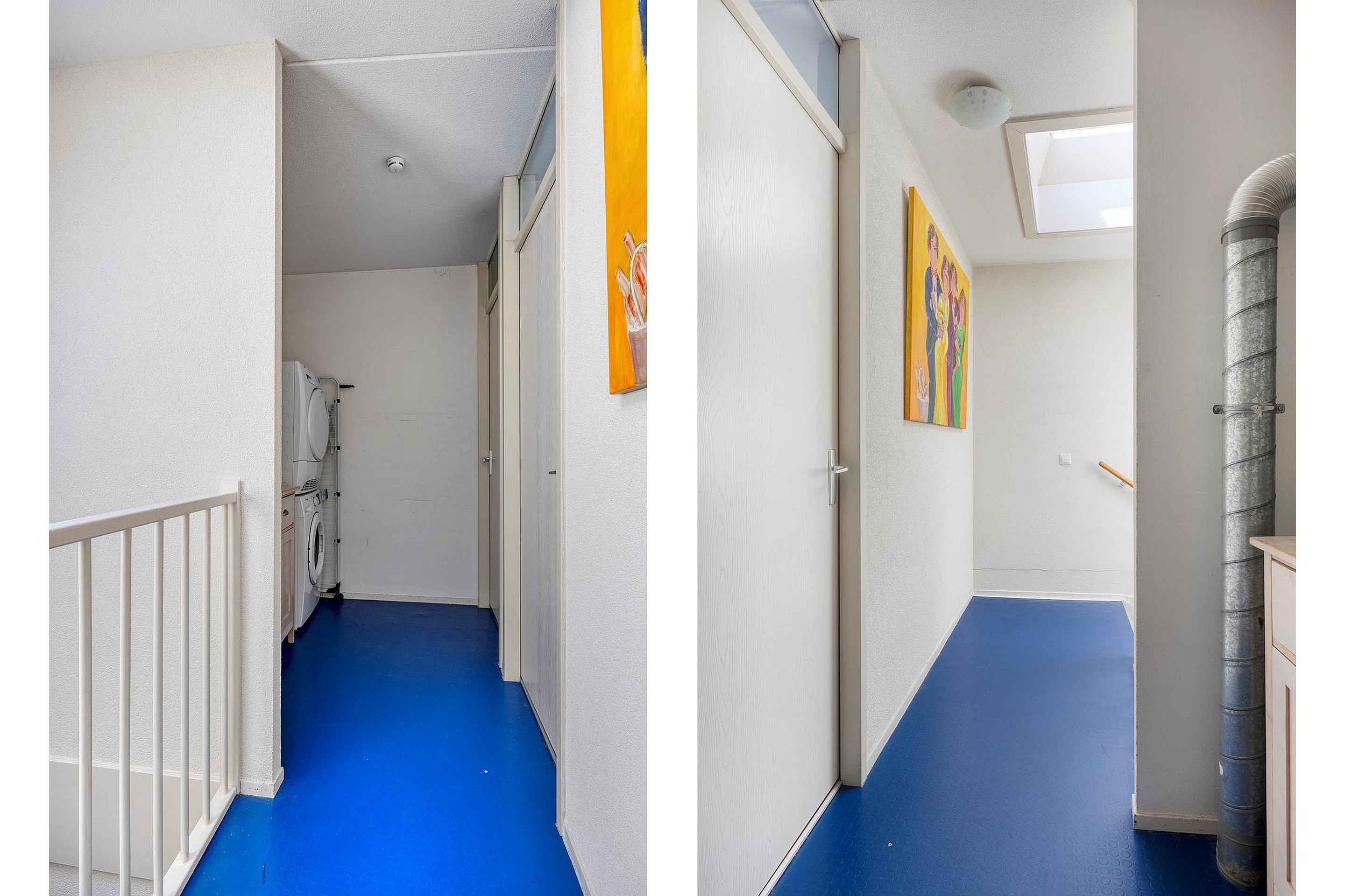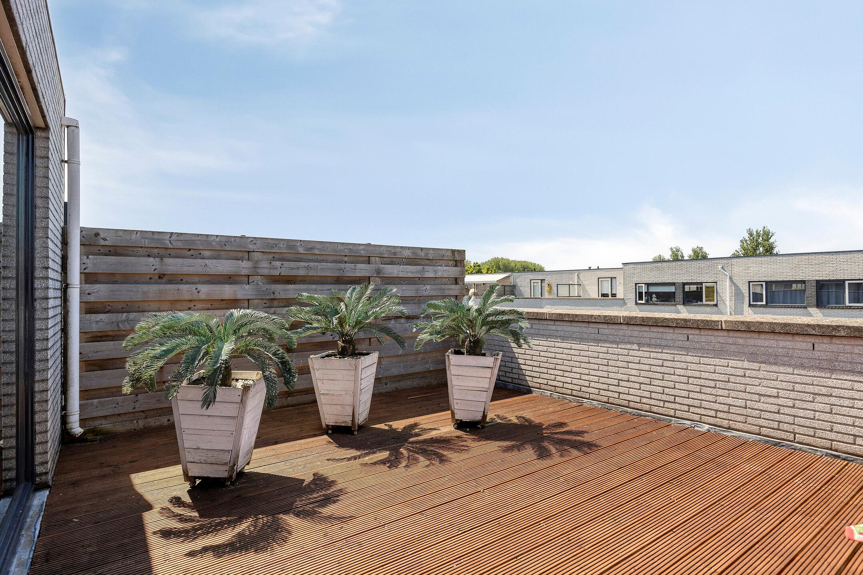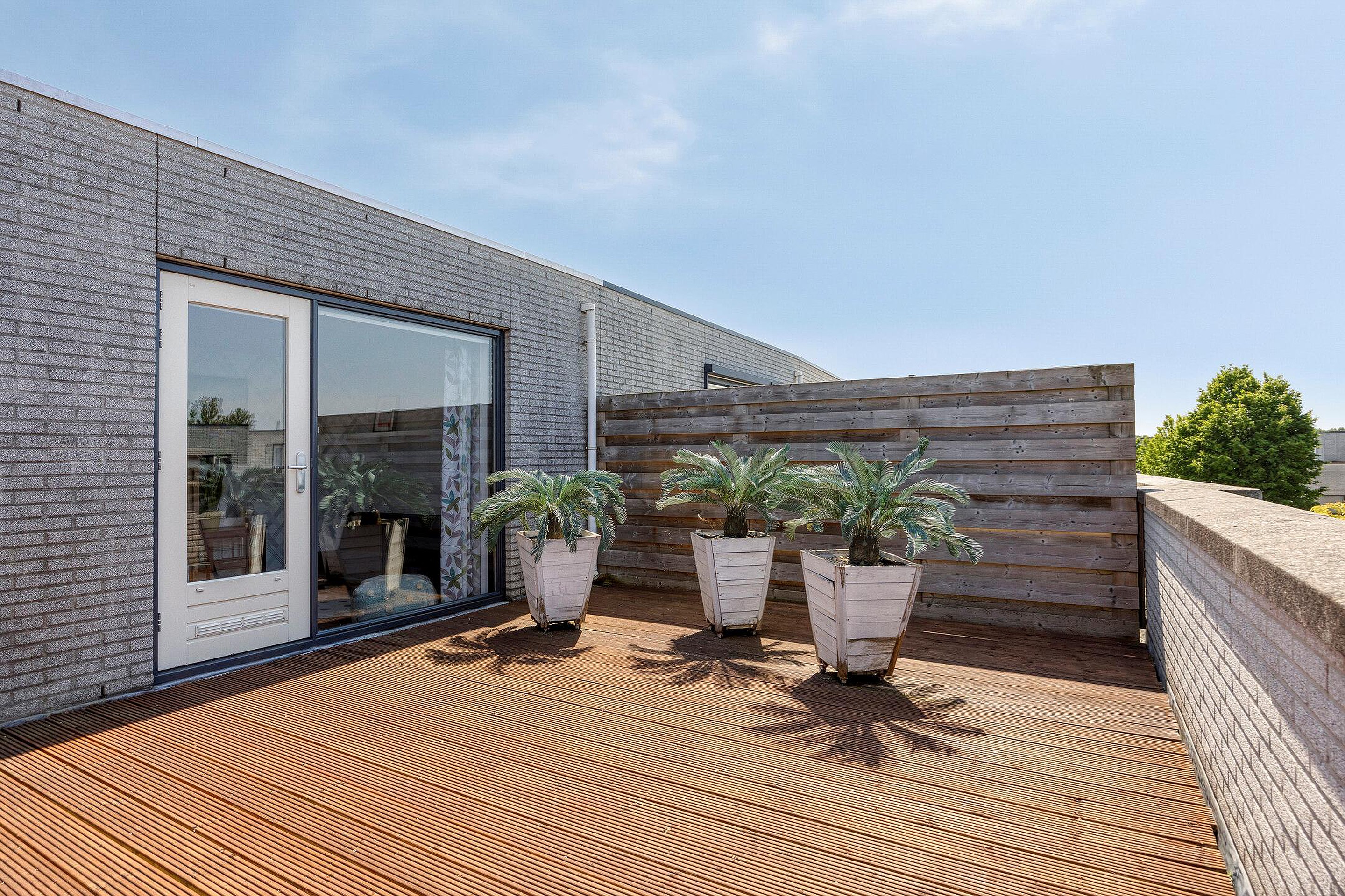 Een verdieping hoger is nog meer ruimte. Je vindt er de aansluitingen voor de wasmachine en droger en nog twee slaapkamers. Via de lichtkoepel op de tweede etage valt altijd natuurlijk licht naar binnen. De kamer aan de voorkant van het huis leent zich goed voor opbergruimte. De kamer aan de achterkant heeft een groot raam en een deur naar het dakterras met een grote D. Immers, met bijna 30 vierkante meter heb je hier echt een serieuze extra buitenruimte. De vlonders zorgen voor een warme uitstraling.