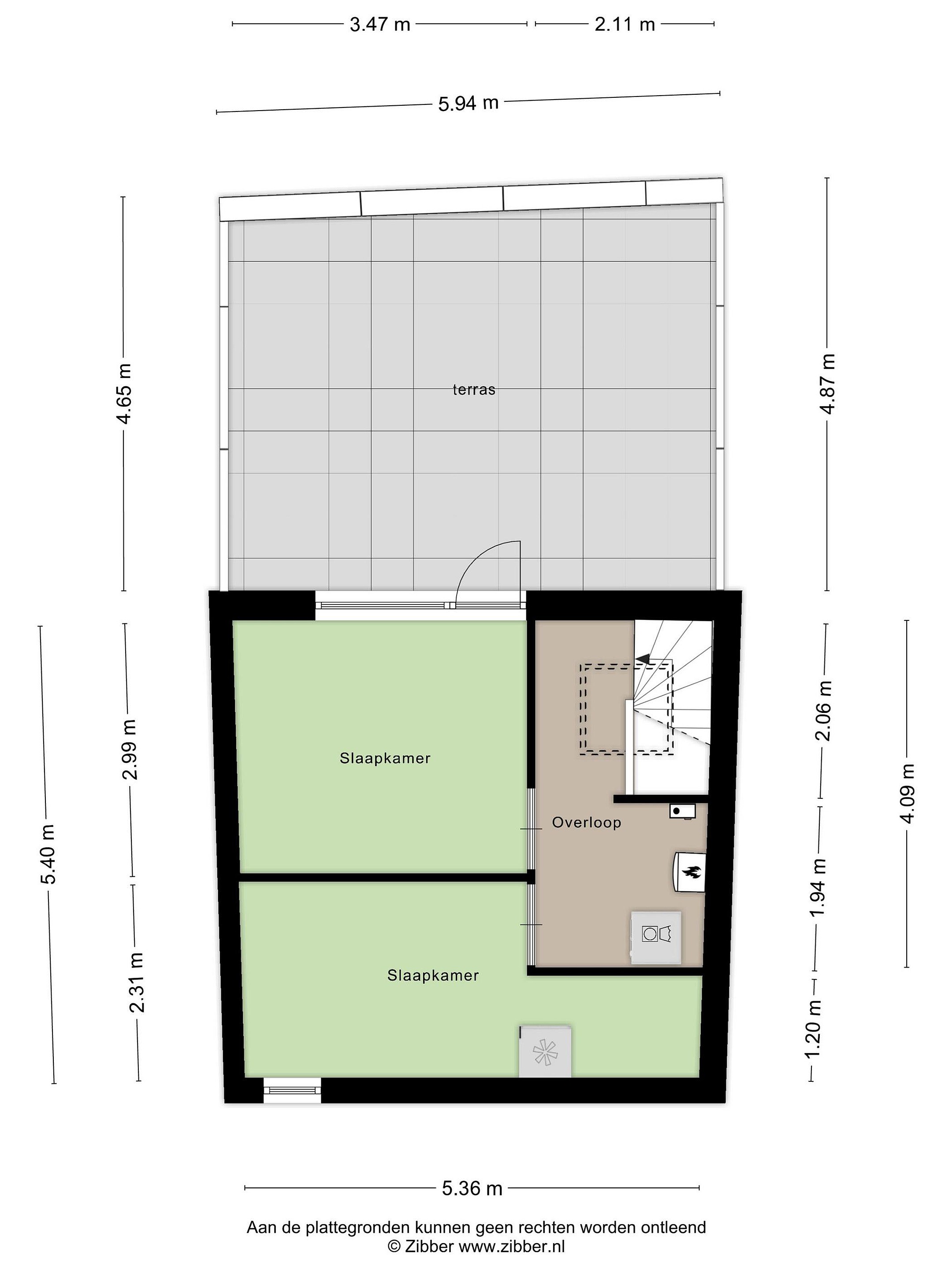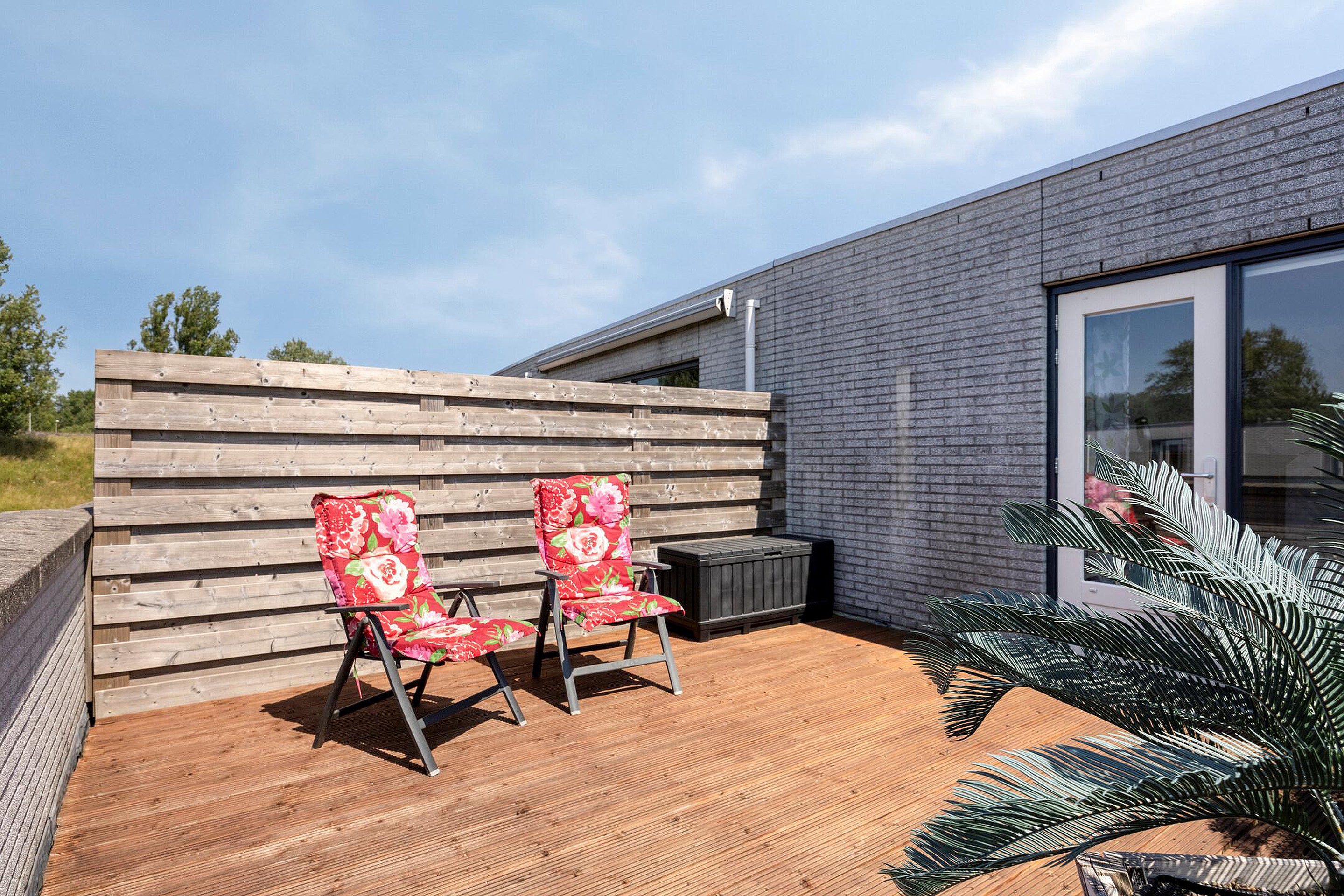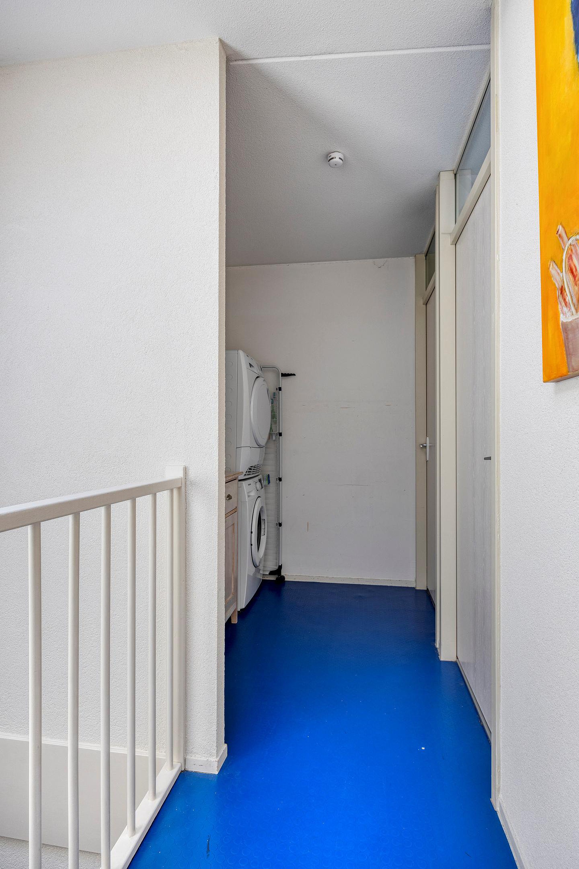 Een verdieping hoger is nog meer ruimte. Je vindt er de aansluitingen voor de wasmachine en droger en nog twee slaapkamers. Via de lichtkoepel op de tweede etage valt altijd natuurlijk licht naar binnen. De kamer aan de voorkant van het huis leent zich goed voor opbergruimte. De kamer aan de achterkant heeft een groot raam en een deur naar het dakterras met een grote D. Immers, met bijna 30 vierkante meter heb je hier echt een serieuze extra buitenruimte. De vlonders zorgen voor een warme uitstraling.
