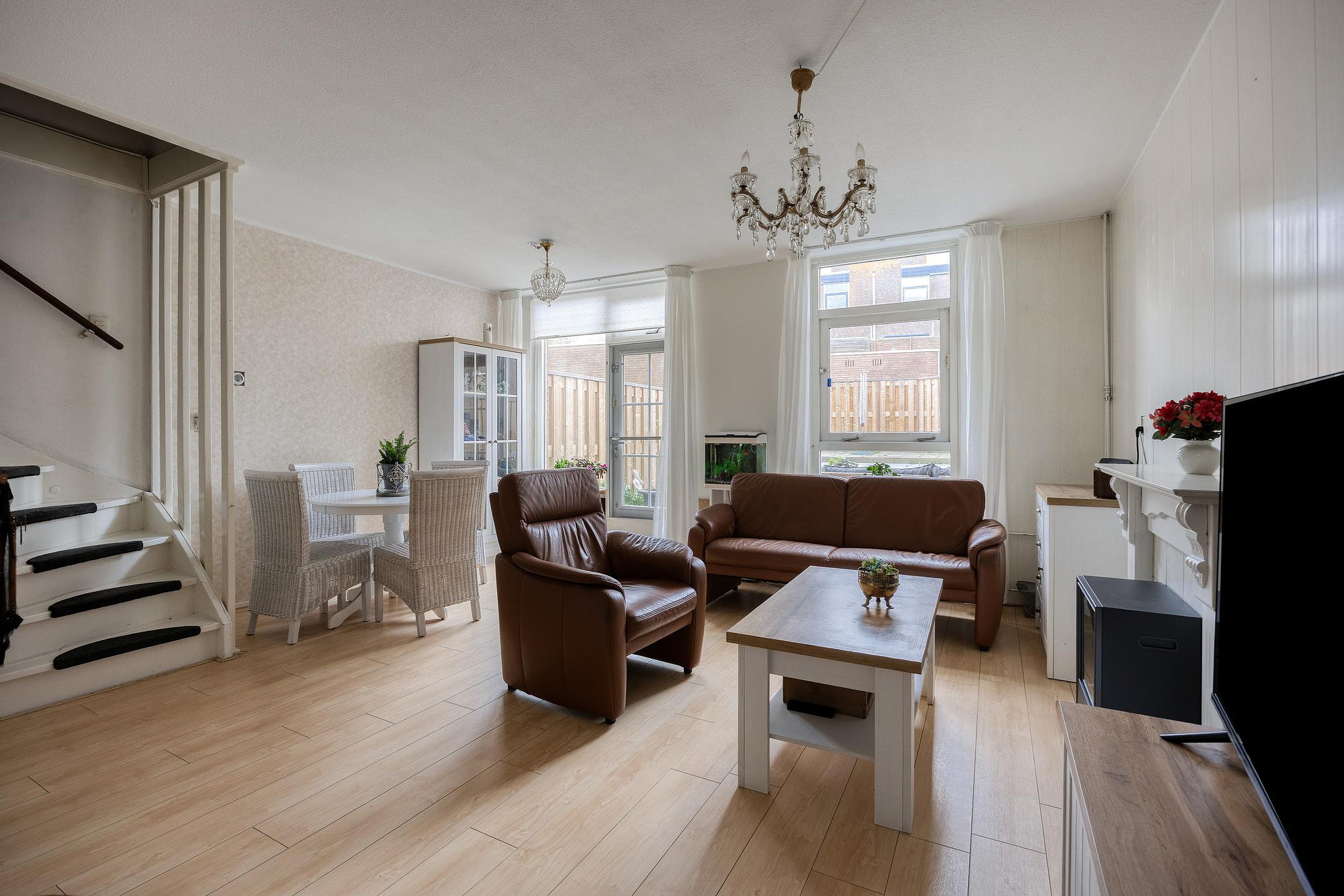 Je komt het huis binnen in een ruime en lichte hal. Daar vind je ook het toilet. De glazen deur geeft al een snelle blik in de woonkamer. Ook deze valt op door het invallende daglicht en de ruimte. Plek genoeg voor een bankstel en eettafel. De half open keuken is eveneens ruim en heeft alle apparatuur die je nodig hebt om lekker te kokkerellen. De keuken beschikt verder over veel opbergruimte. We lopen weer terug naar de woonkamer want we hebben de tuin nog niet gezien. Deze is opvallend diep en onderhoudsvrij aangelegd en heeft verschillende niveau’s. De open trap naar boven is in het midden van de woonkamer.