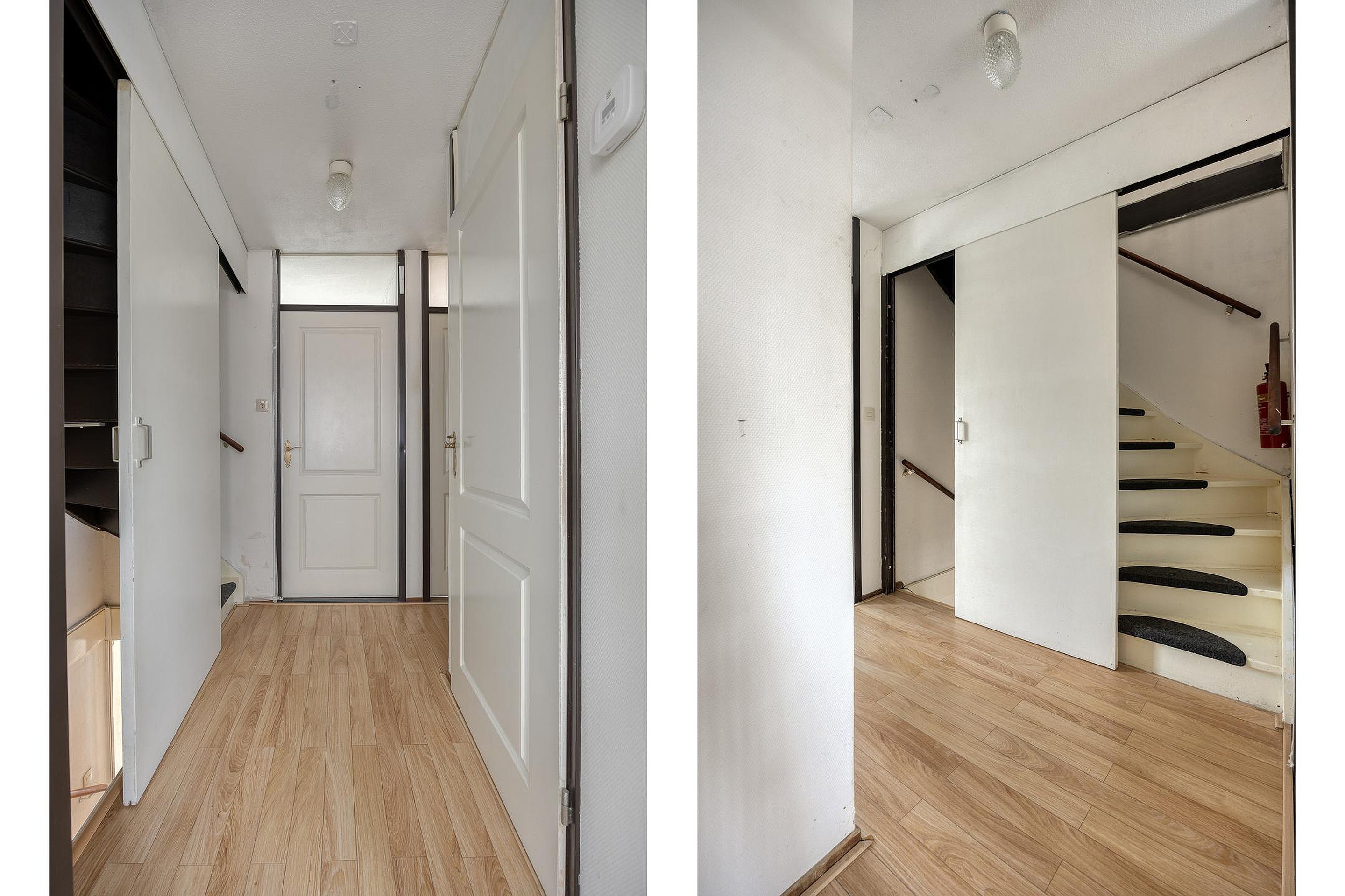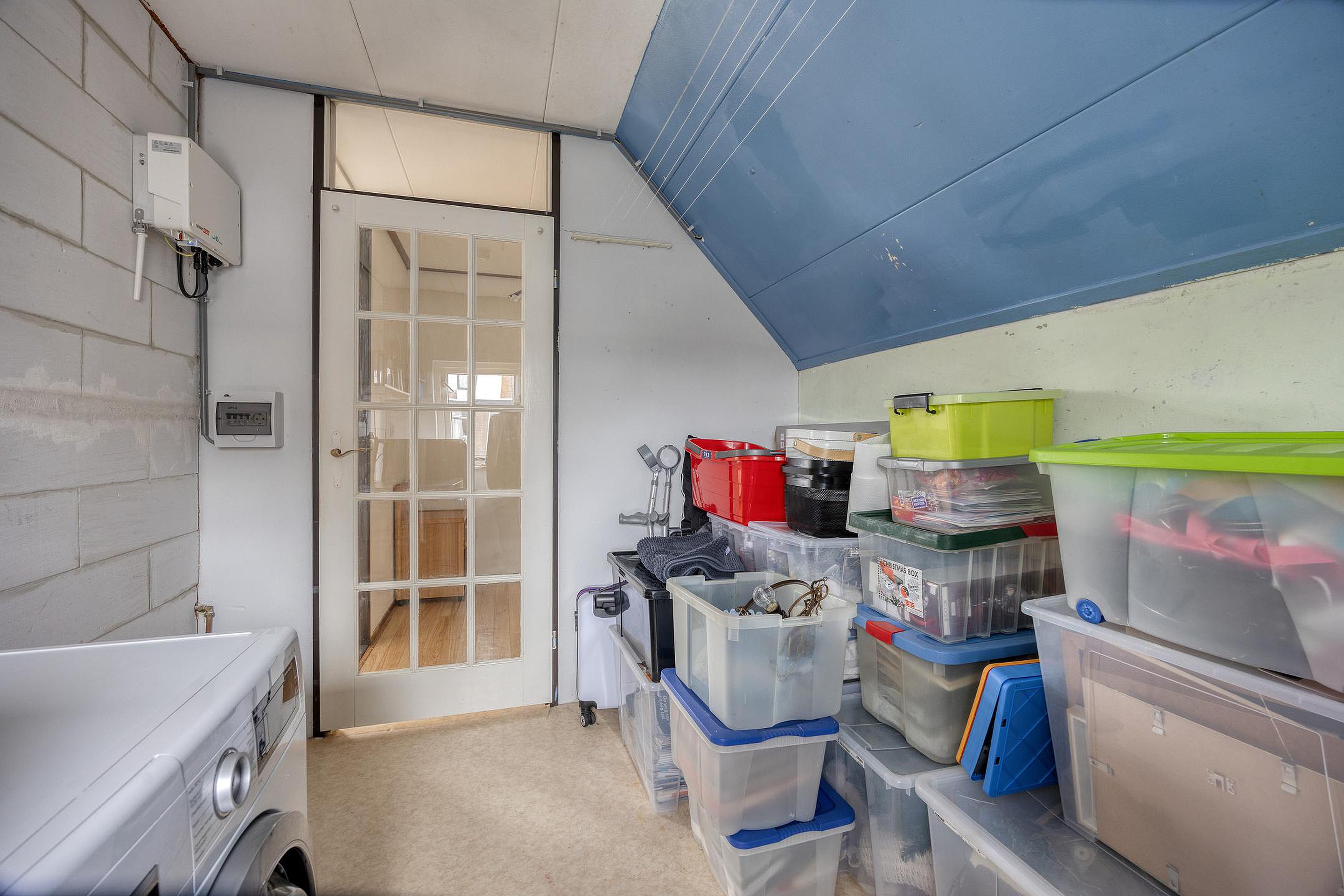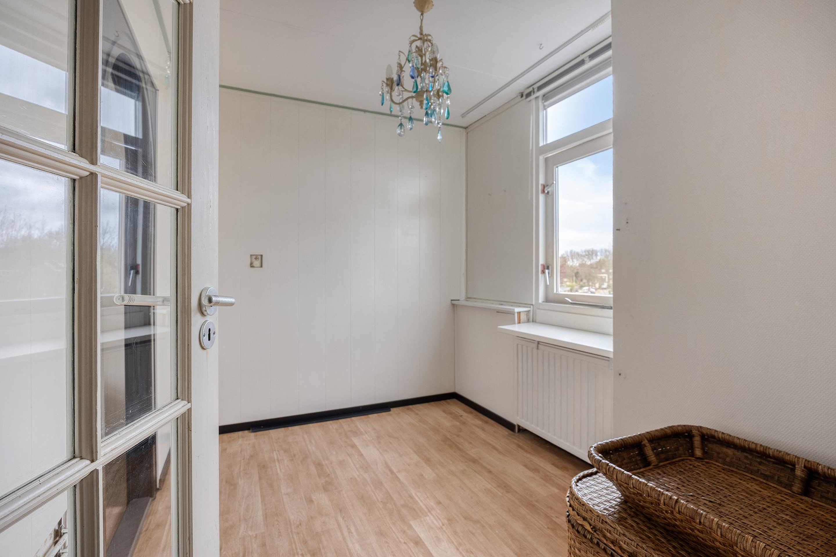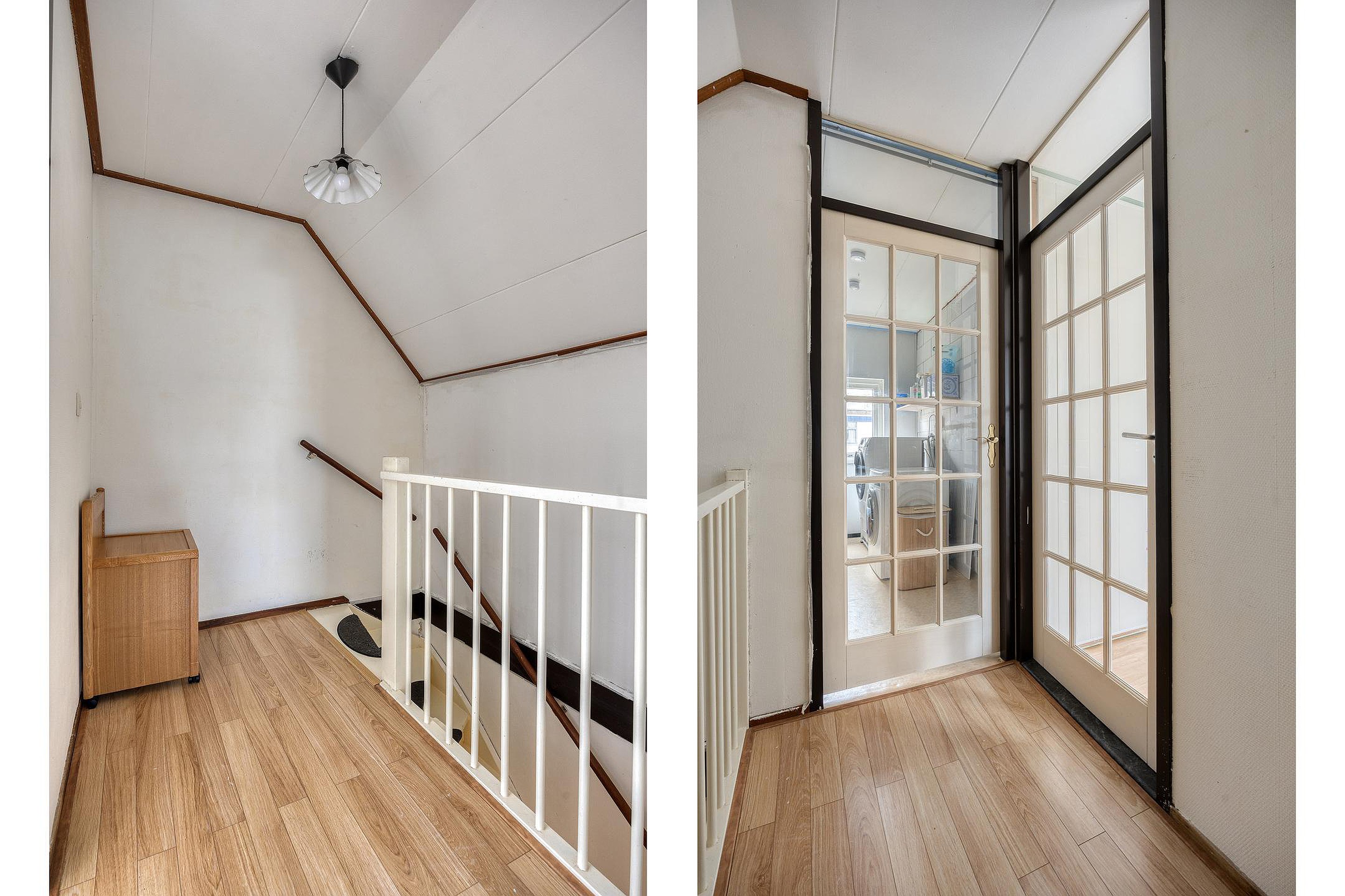 De volgende trap gaat naar de tweede etage. Glazen deuren zorgen voor veel licht op deze etage met twee ruime slaapkamers. Hier is ook de wasruimte. En waar bij veel woningen de wasruimte maar klein is, is dit bij het Azaleapark 34 een grote ruimte. Genoeg plek dus voor bijvoorbeeld een wasrek, strijkplank of extra opbergruimte.