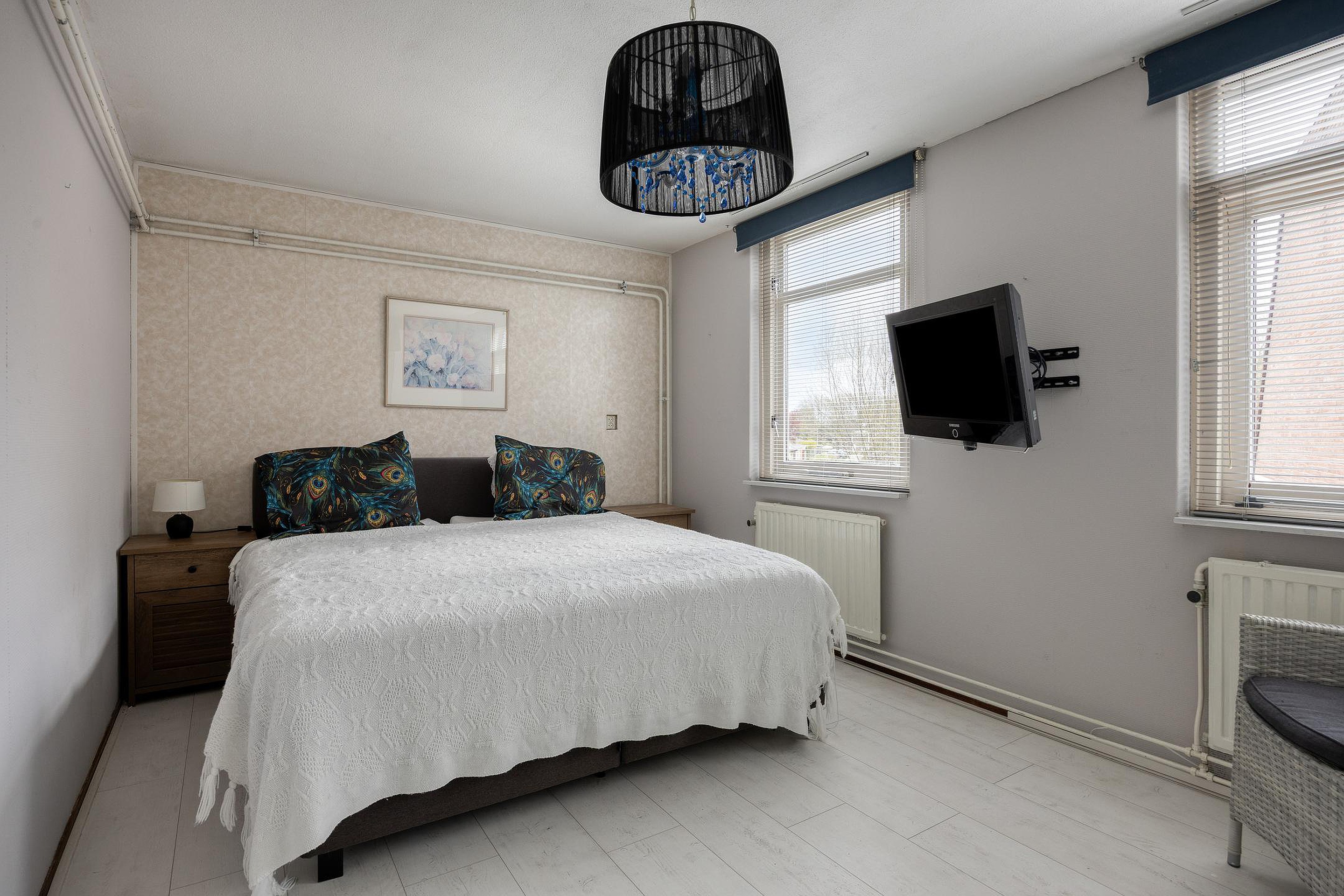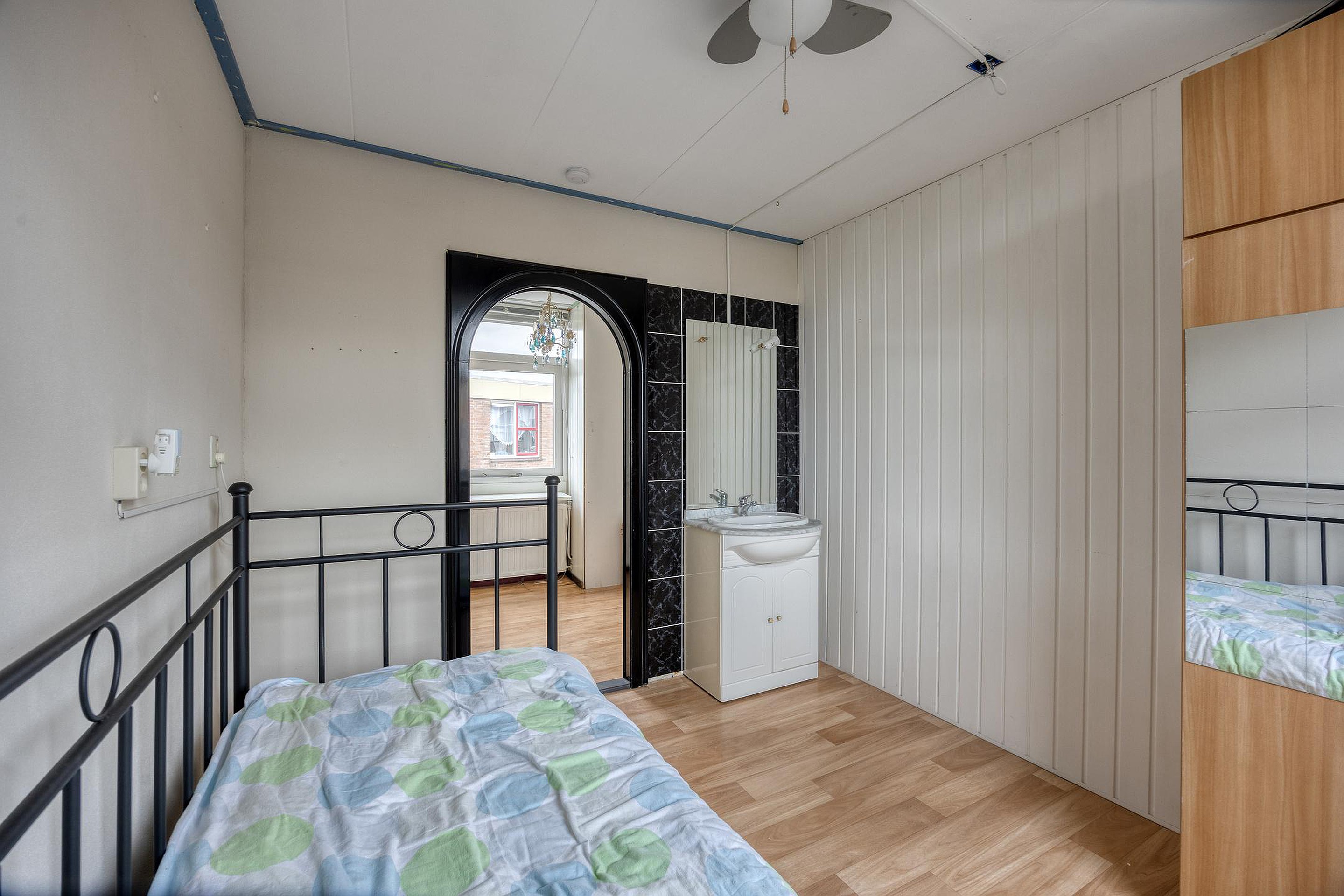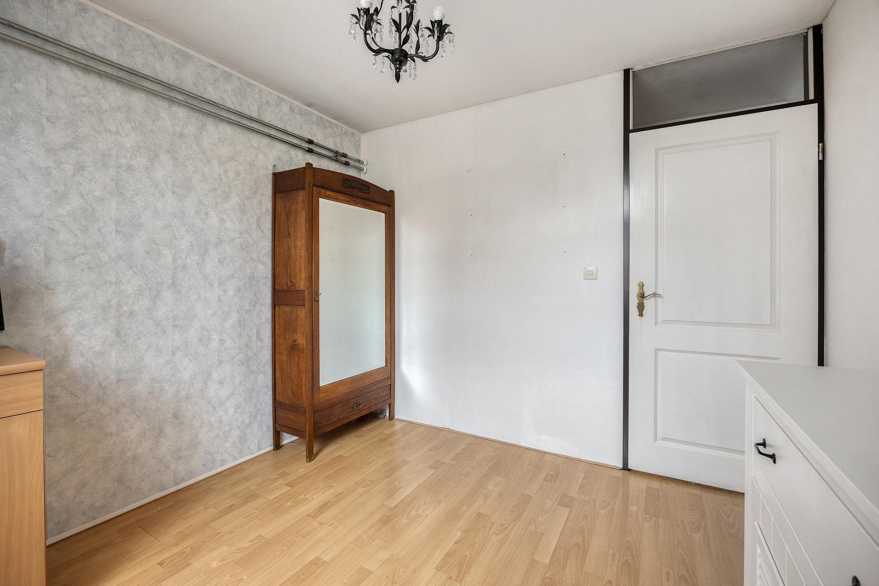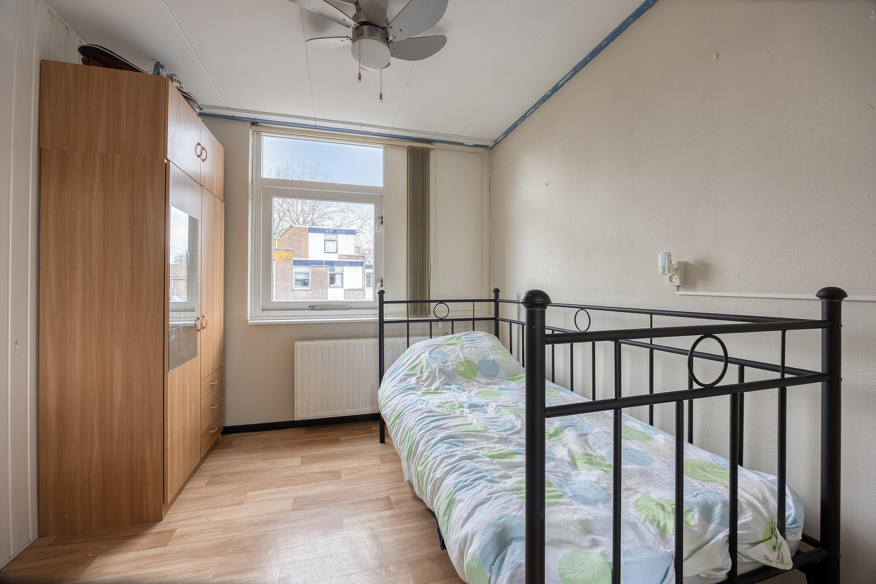 De volgende trap gaat naar de tweede etage. Glazen deuren zorgen voor veel licht op deze etage met twee ruime slaapkamers. Hier is ook de wasruimte. En waar bij veel woningen de wasruimte maar klein is, is dit bij het Azaleapark 34 een grote ruimte. Genoeg plek dus voor bijvoorbeeld een wasrek, strijkplank of extra opbergruimte.