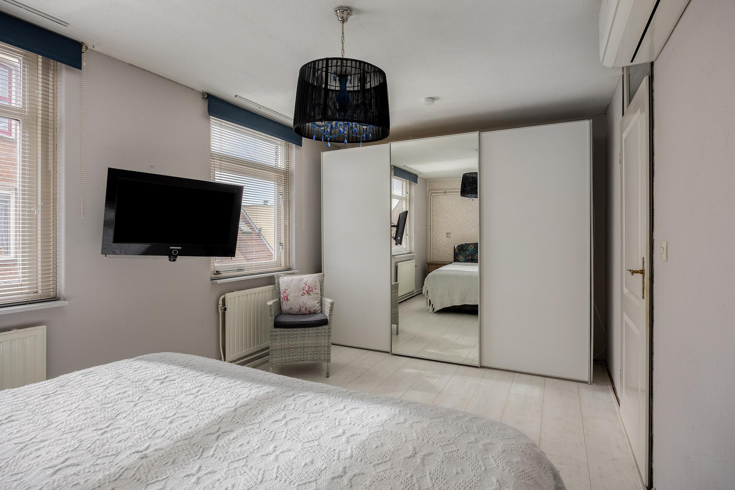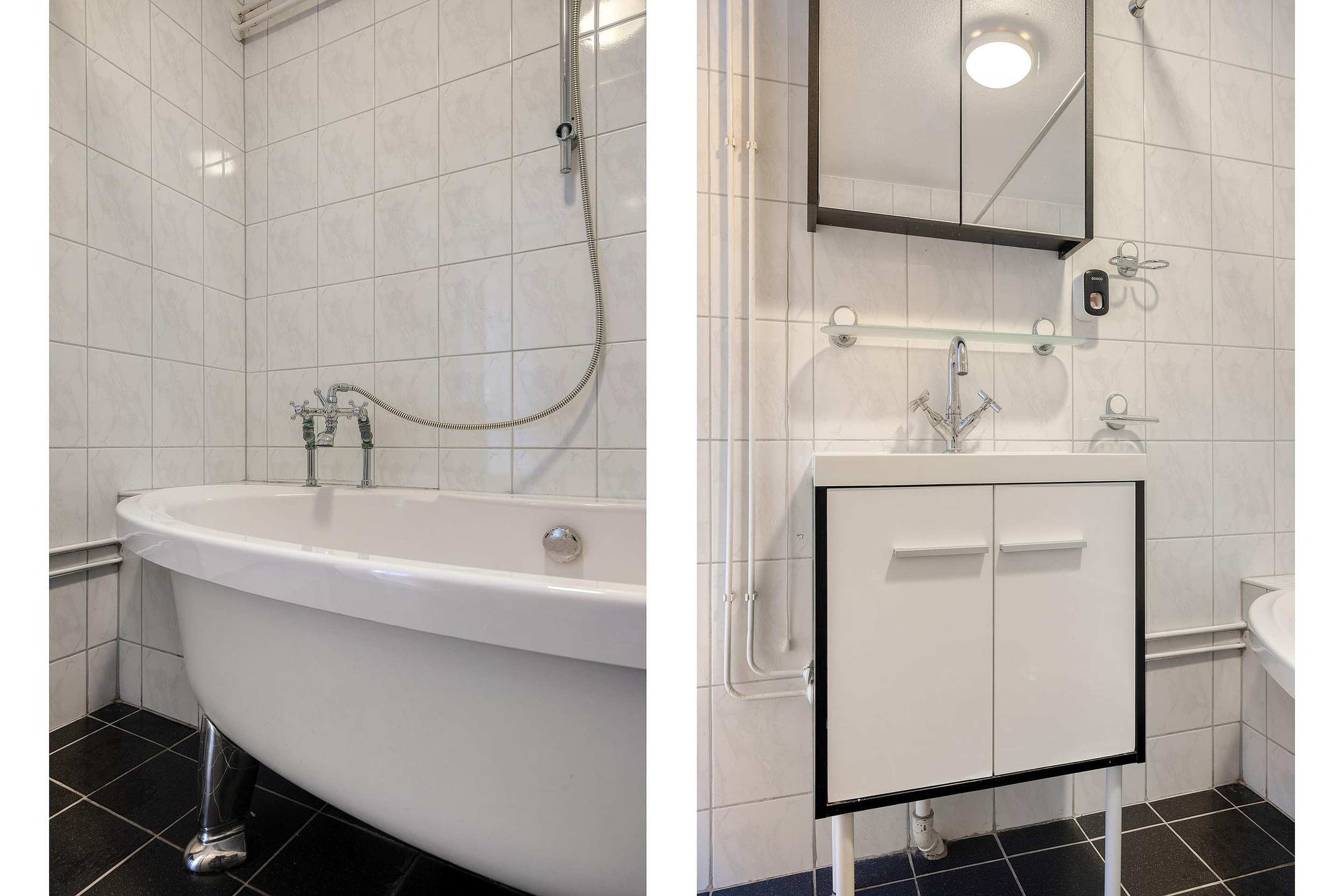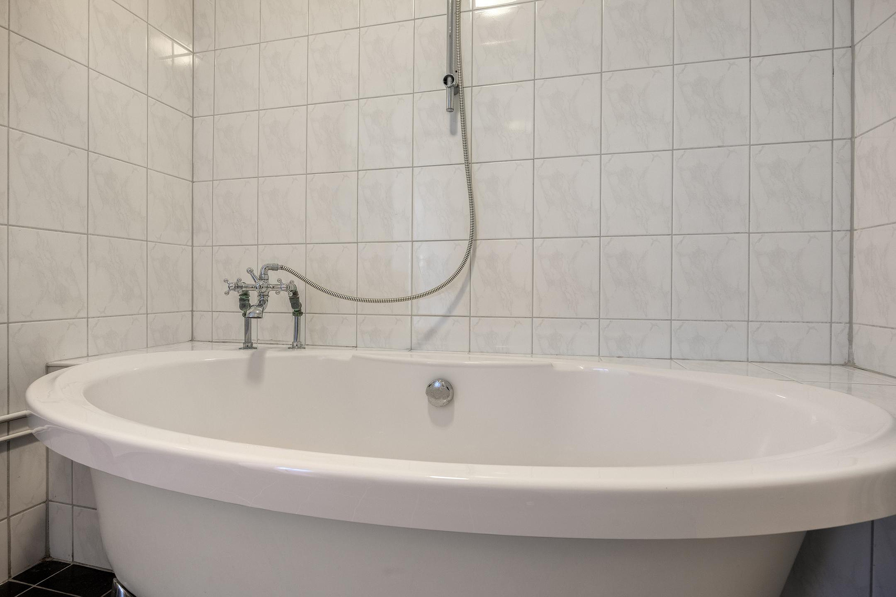 Op de eerste verdieping zijn de slaapkamers. De master bedroom is gelegen over de gehele breedte van het huis. Maar ook de andere twee slaapkamers zijn ruim en keurig onderhouden zoals eigenlijk de gehele woning. Op de eerste verdieping is ook de badkamer. Mooi betegeld, een fraai badkamermeubel, het tweede toilet en met een heel sfeervol ligbad op pootjes. De badkamer en het toilet zijn functioneel en nog goed te gebruiken, maar zijn van een oudere uitvoering en verdienen op termijn modernisering.
