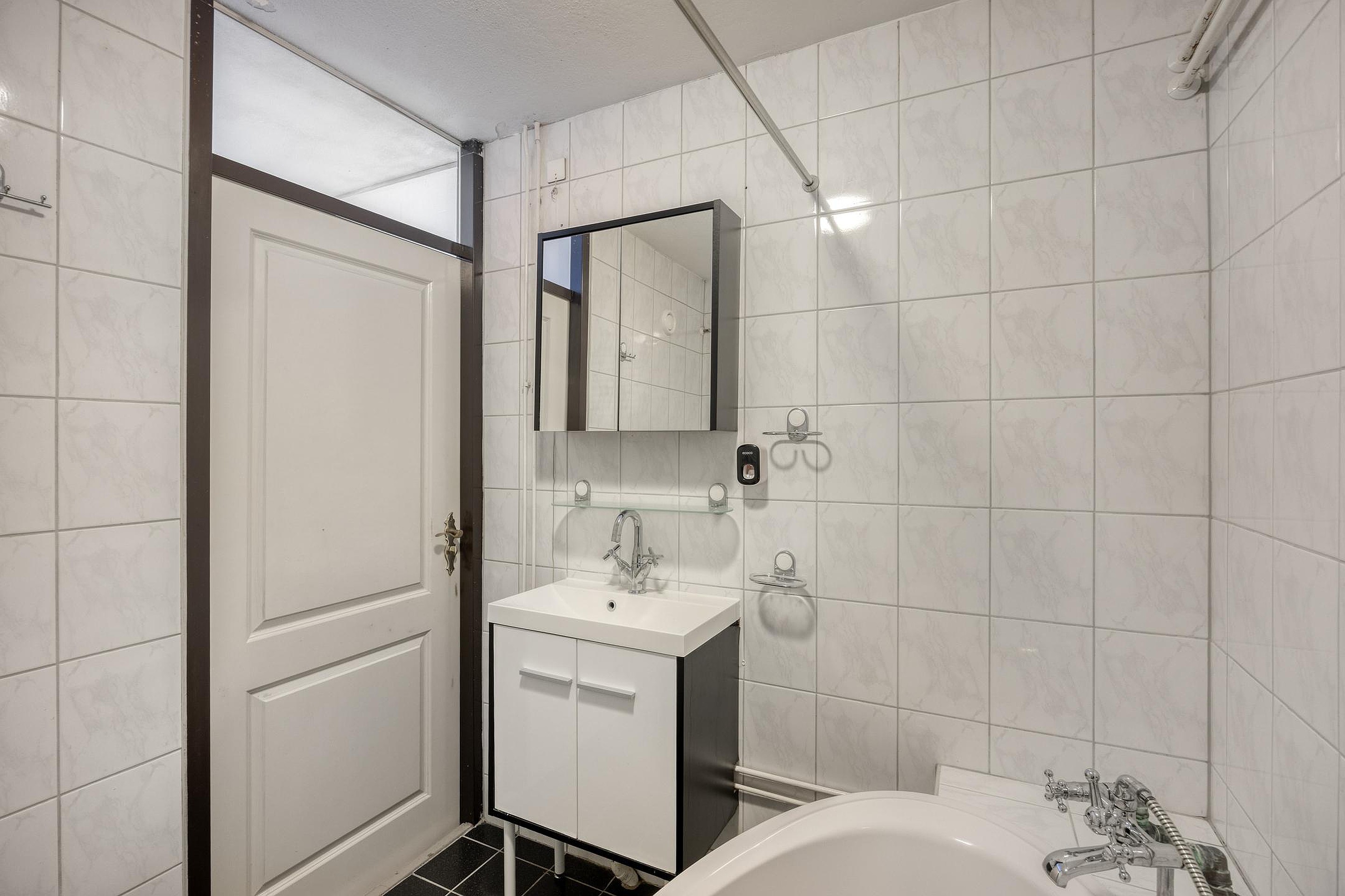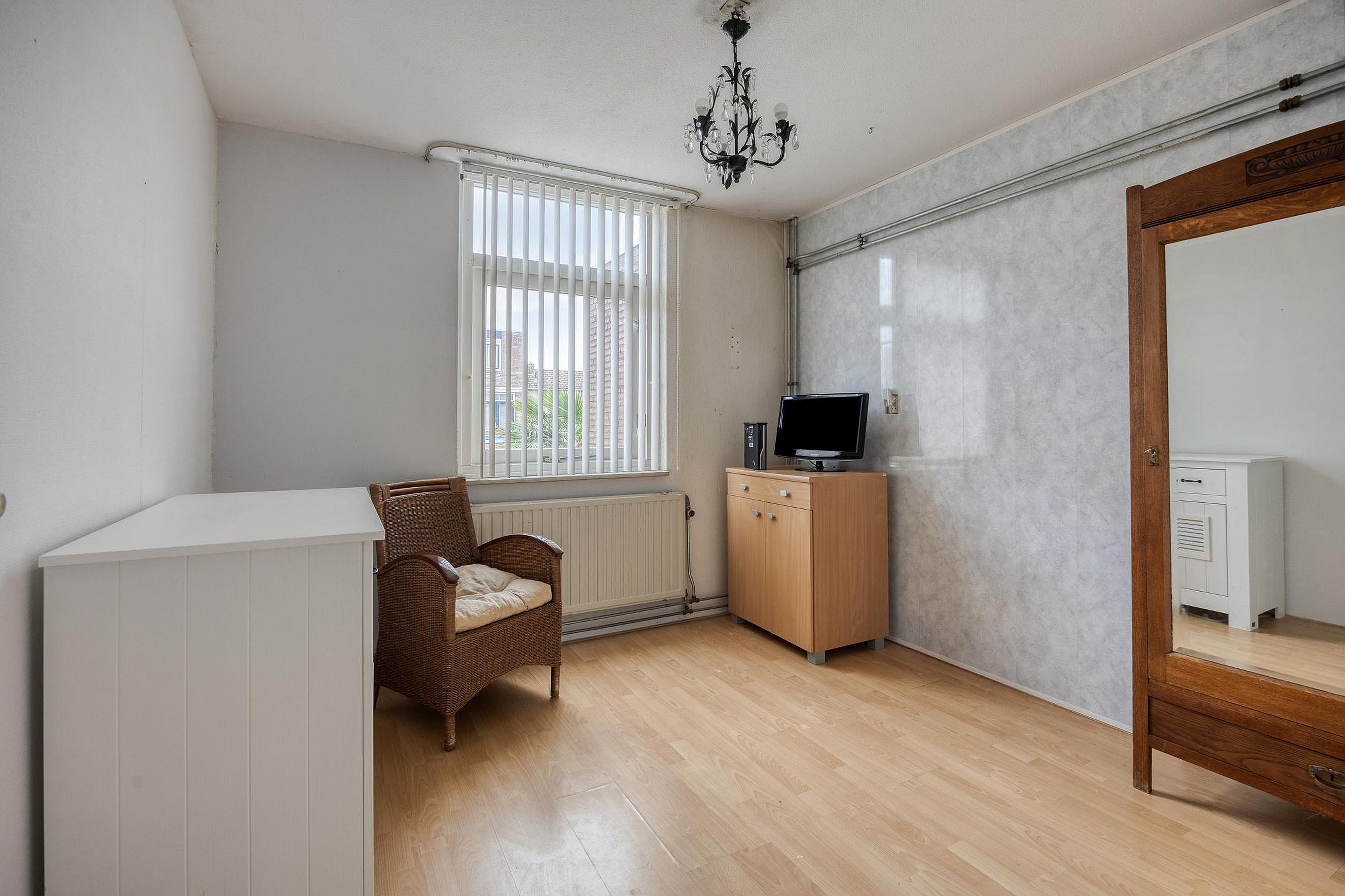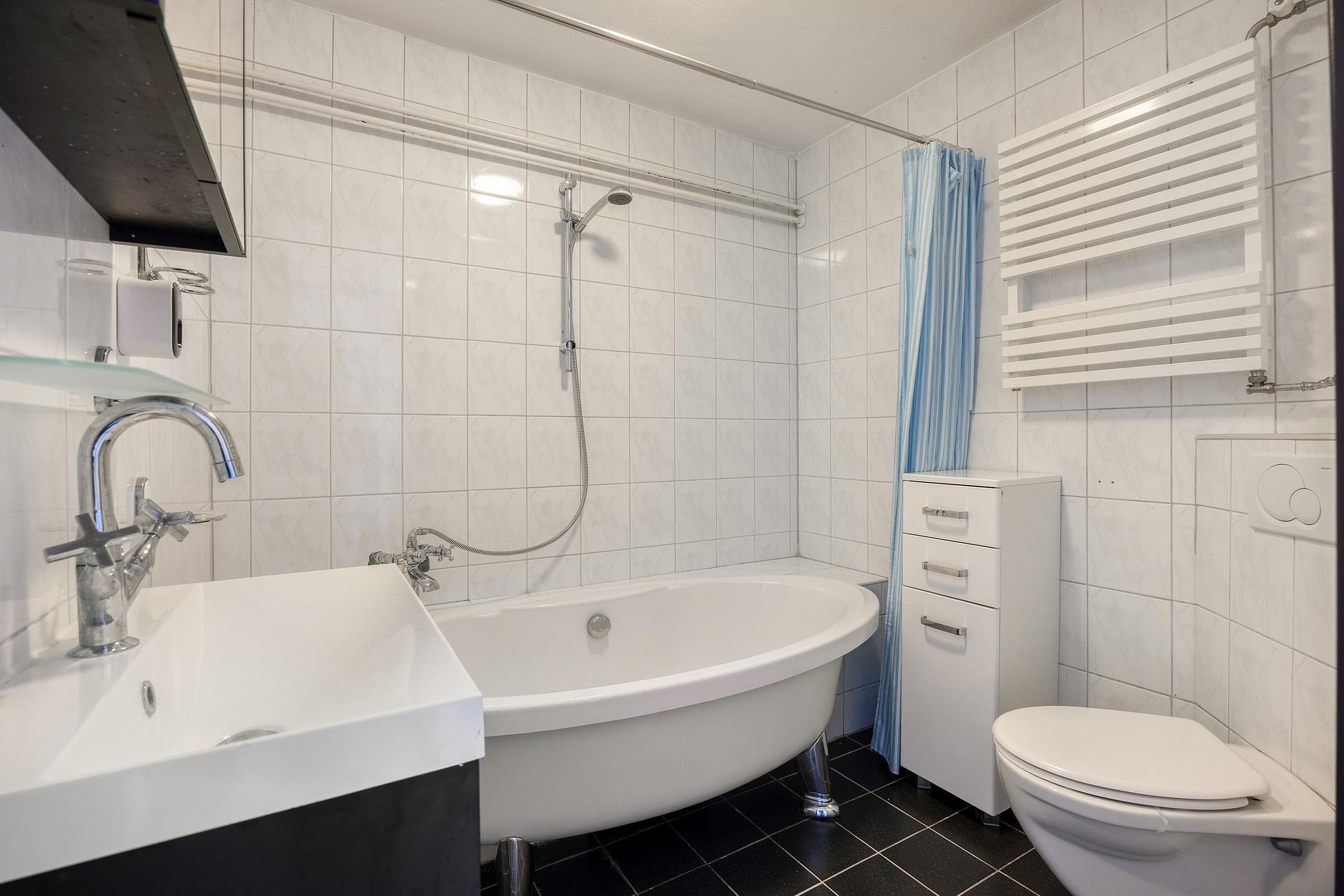 Op de eerste verdieping zijn de slaapkamers. De master bedroom is gelegen over de gehele breedte van het huis. Maar ook de andere twee slaapkamers zijn ruim en keurig onderhouden zoals eigenlijk de gehele woning. Op de eerste verdieping is ook de badkamer. Mooi betegeld, een fraai badkamermeubel, het tweede toilet en met een heel sfeervol ligbad op pootjes. De badkamer en het toilet zijn functioneel en nog goed te gebruiken, maar zijn van een oudere uitvoering en verdienen op termijn modernisering.