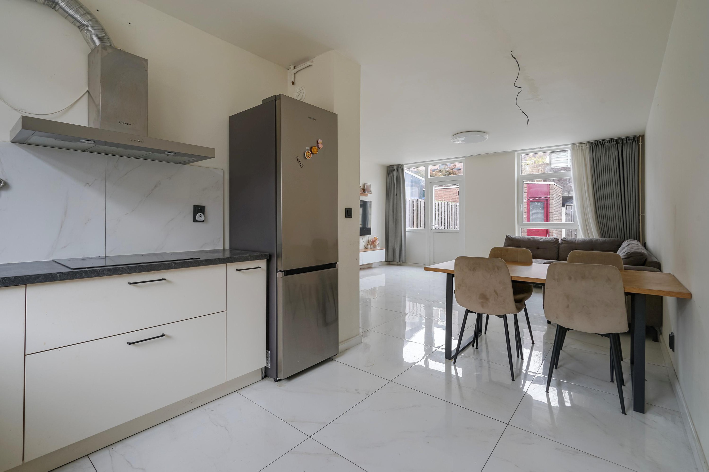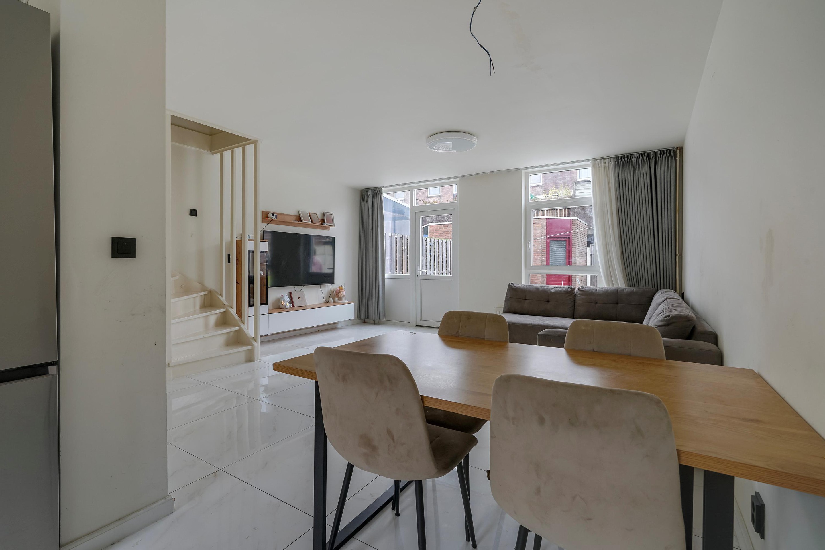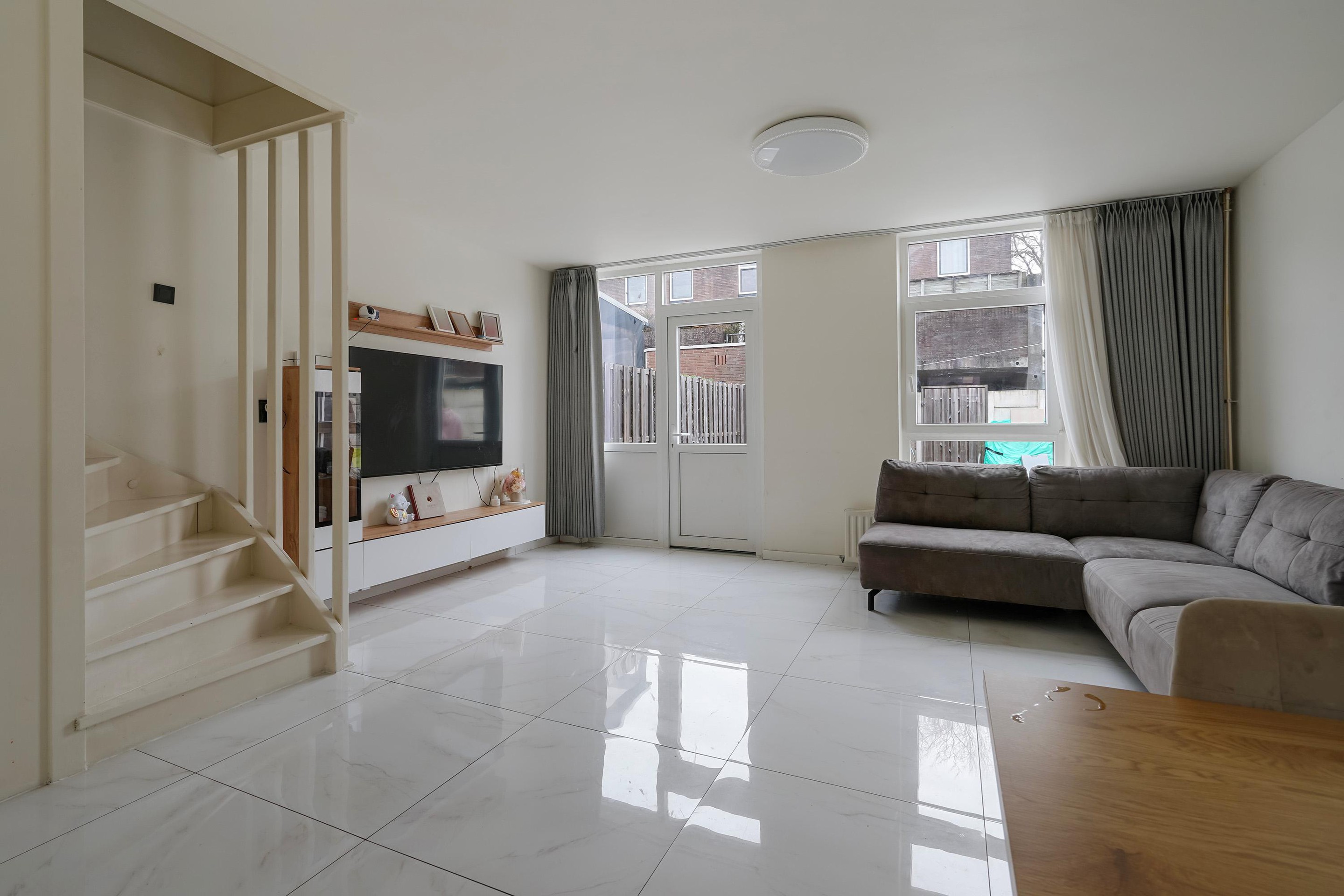 Ruime entree met separaat toilet. De lichte woonkamer vormt het hart van de woning en biedt volop ruimte voor een comfortabele zit- en eethoek. De keuken grenst direct aan de woonkamer en is praktisch ingericht, waardoor koken en gezellig samenzijn moeiteloos samengaan.