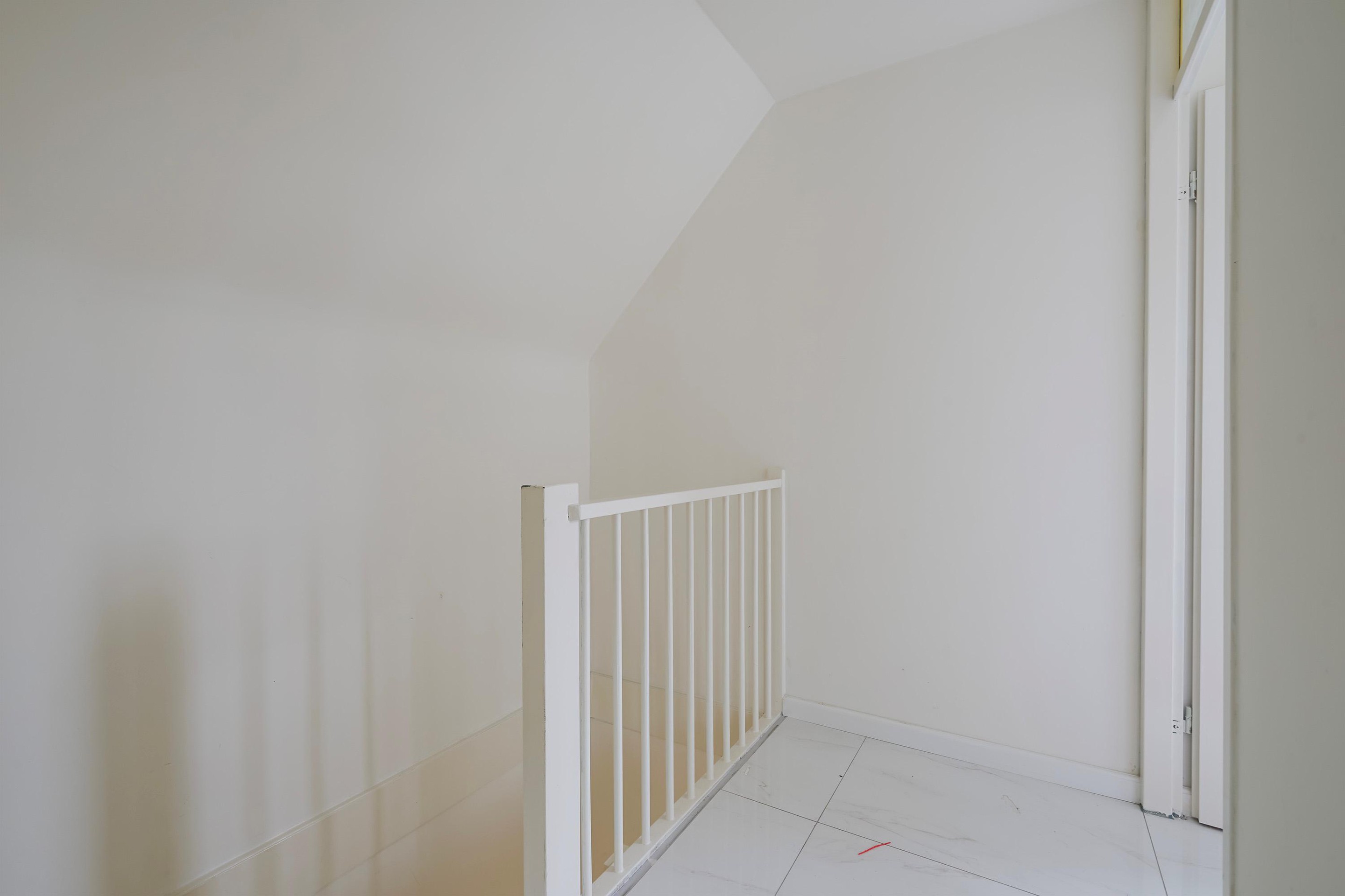 Overloop met toegang tot drie goed bemeten slaapkamers, een handige inbouwkast en de badkamer. De badkamer is voorzien van een moderne inloopdouche met regendouche — een fijne start van de dag.