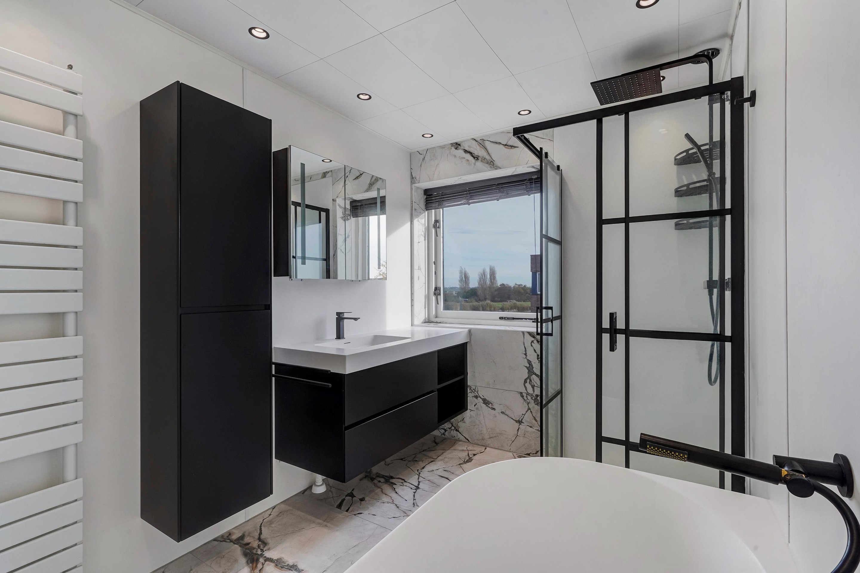 Begane grond Entree woning, hal v.v. meterkast en toilet, vanuit de hal toegang tot de riante tuinkamer v.v. airconditioning en toegang tot de zonnige tuin met carport. 1e verdieping (woonverdieping) in de woonkamer geniet u van een prachtig uitzicht over de Benthuizerplas, de vrijheid die u hier ervaart is fantastisch. Een uitzicht welke iedere dag anders is maar een oase van rust en natuur geeft. De open keuken is modern opgezet en v.v. 4 pits inductie kookplaat met geïntegreerd afzuigsysteem, koel-/vriescombi, wijnkoelkast, warmhoudplaat, combi oven en toegang tot het geweldige terras. deze verdieping is eveneens v.v. airconditioning. 2e verdieping: 2 ruime slaapkamers en eveneens een moderne badkamer v.v. ligbad, douche, wastafelmeubel, handdoekradiator, wandmeubel en mechanische ventilatie. Berging v.v. wasmachine-/droger opstelling, mechanische ventilatie, omvormer zonnepanelen. Separate (spoel)toilet met fontein.