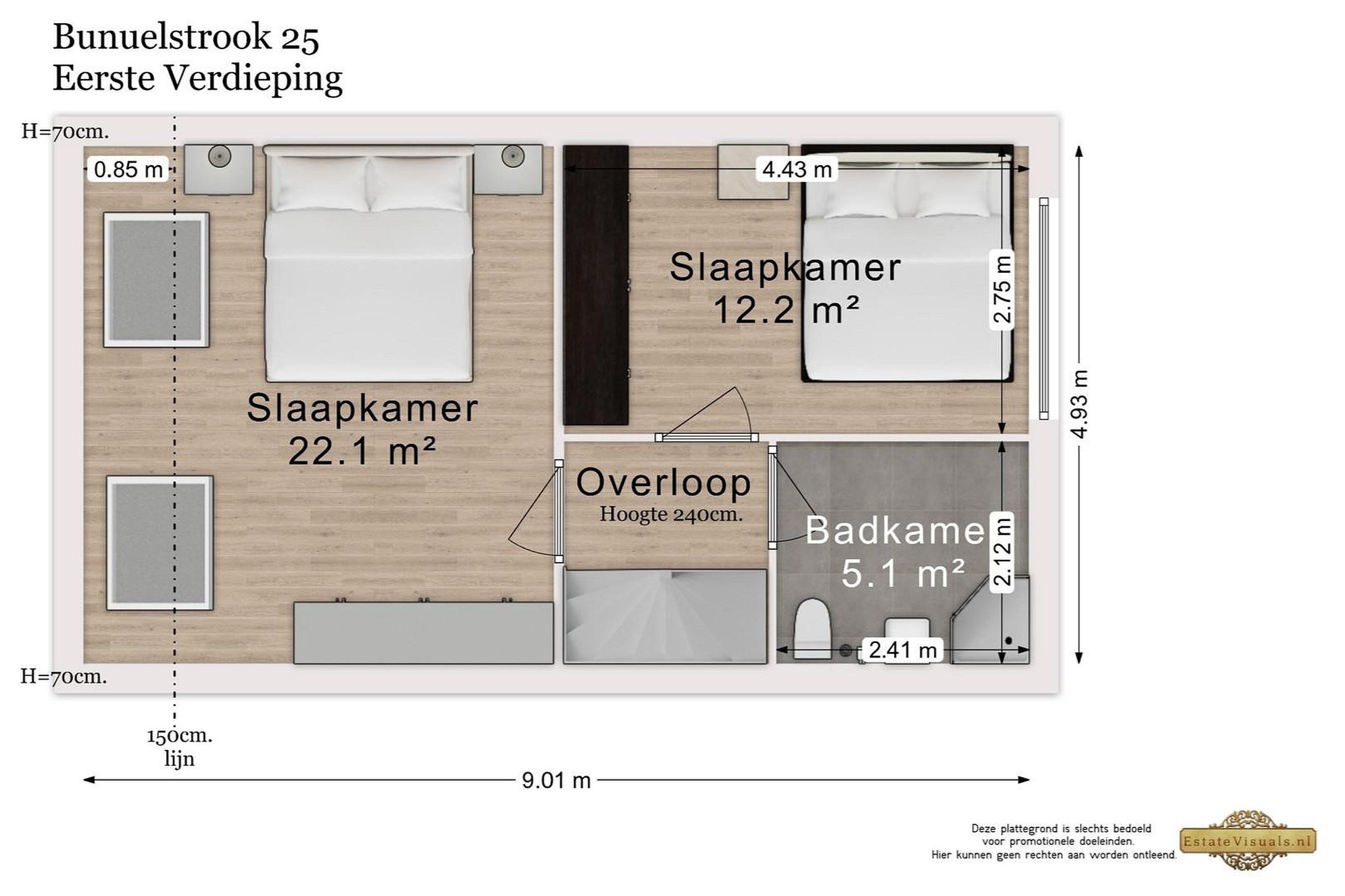 Eerste verdieping Hier vindt u twee ruime slaapkamers, waaronder een royale kamer over de volledige breedte van de woning.
