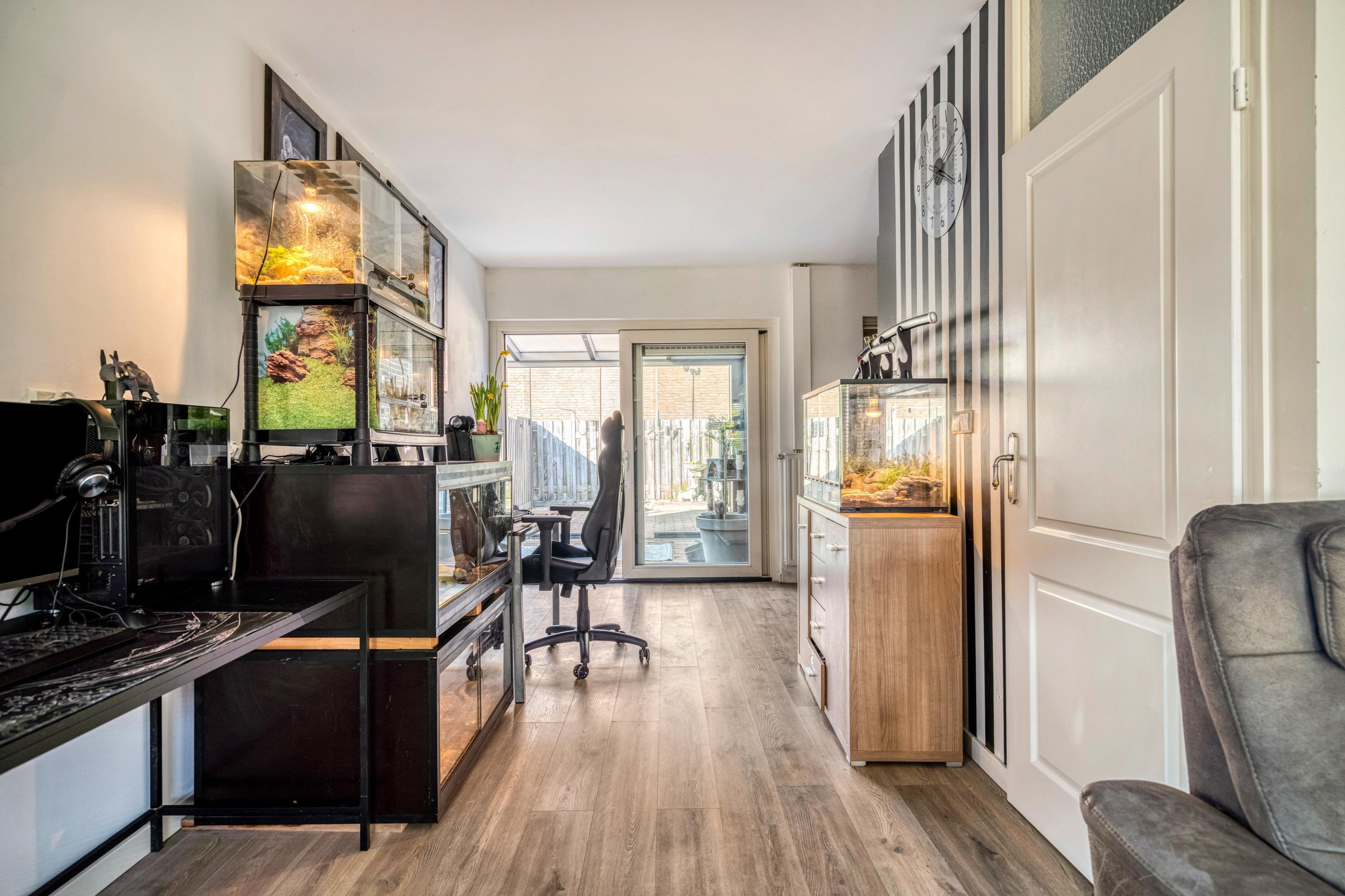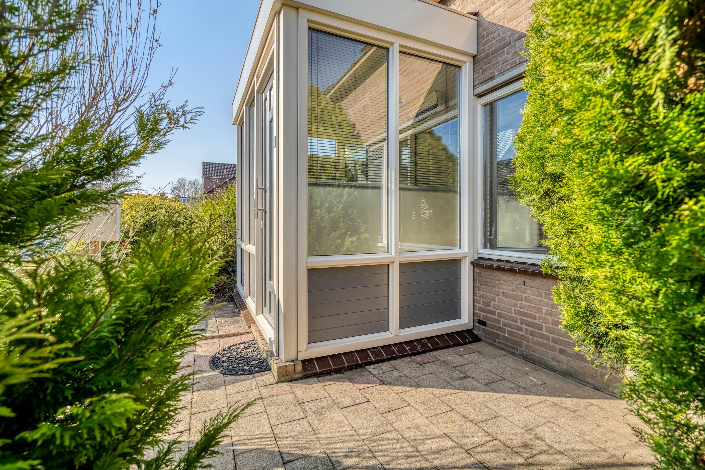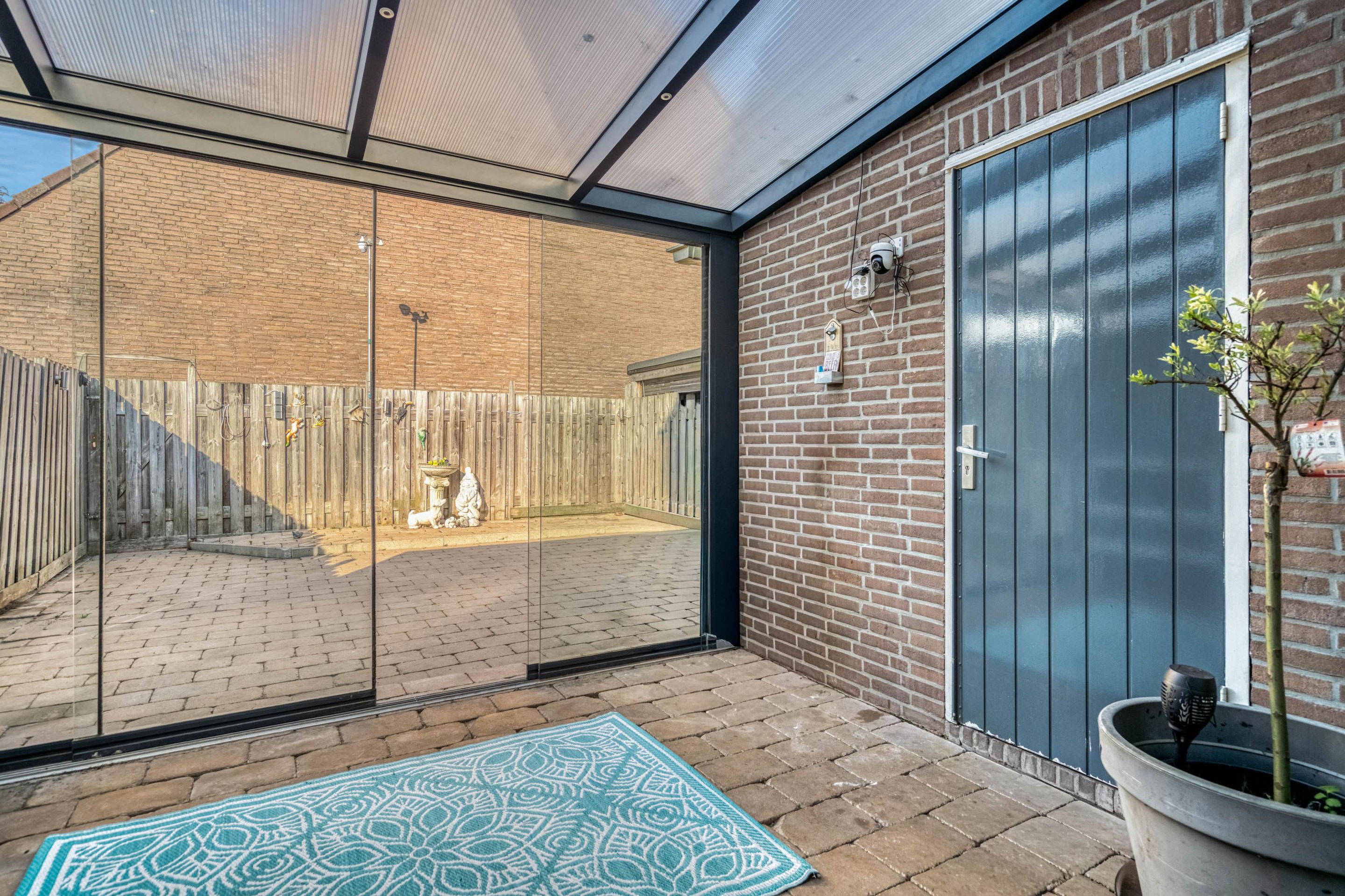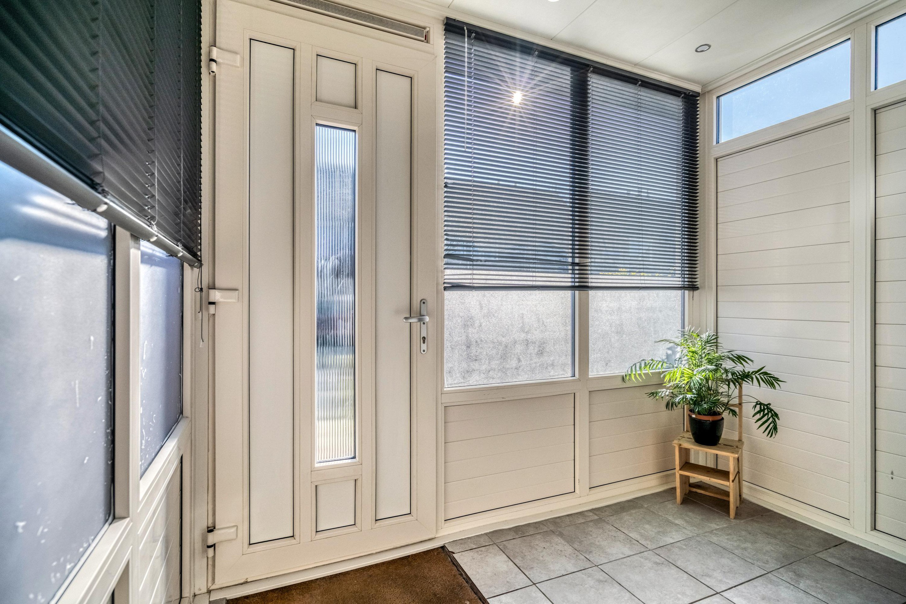 Vanuit de eetkamer loopt u via de schuifpui zo de sfeervolle serre in, die met glazen schuifdeuren direct toegang biedt tot de tuin. Binnen en buiten lopen hier naadloos in elkaar over.