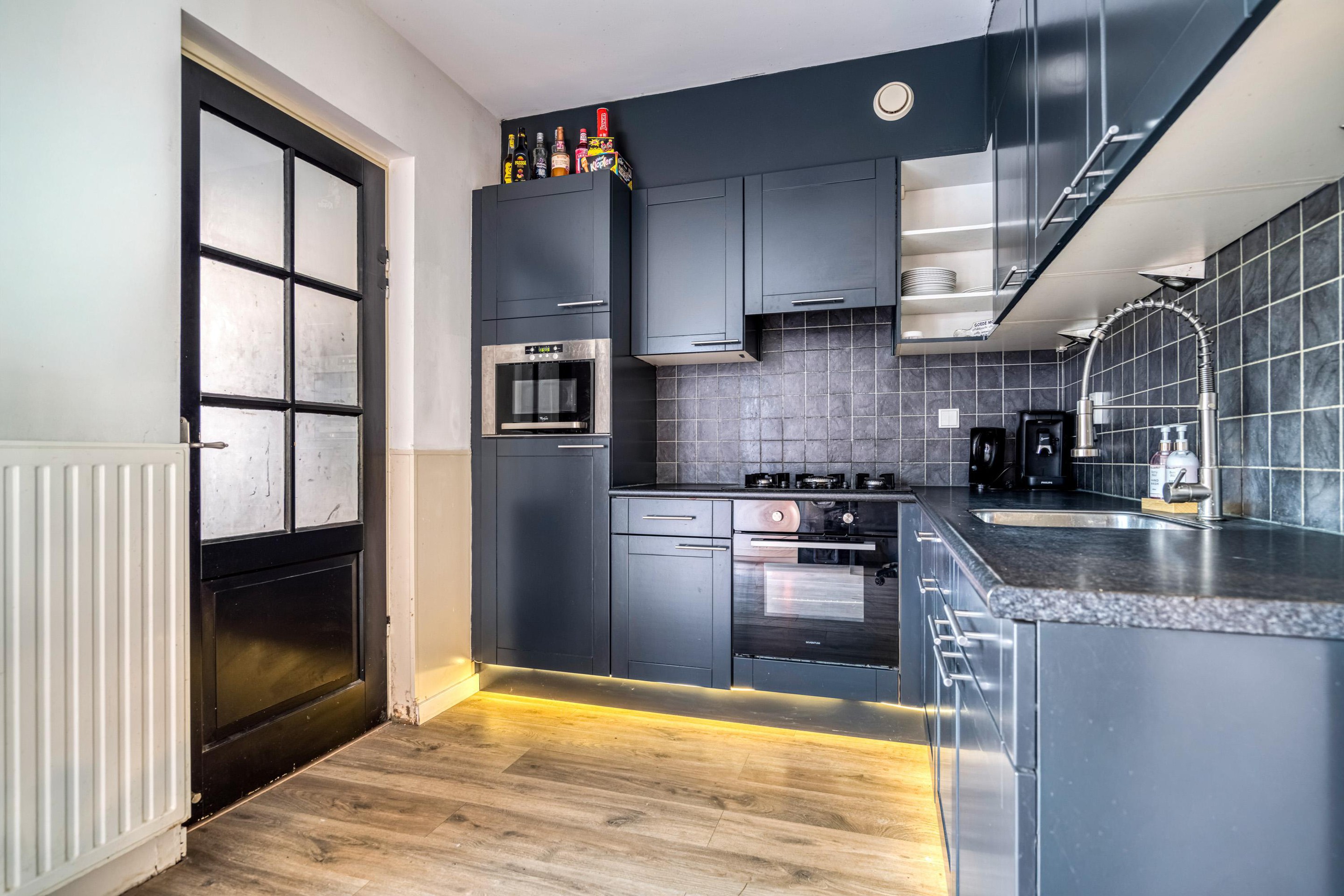 De keuken is voorzien van diverse inbouwapparatuur, waaronder een gaskookplaat, oven en magnetron.